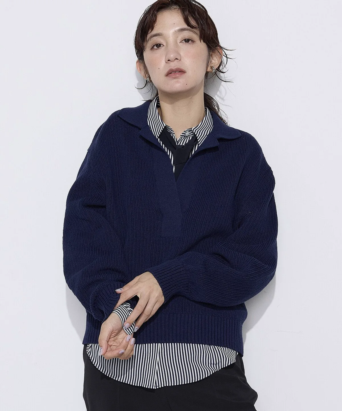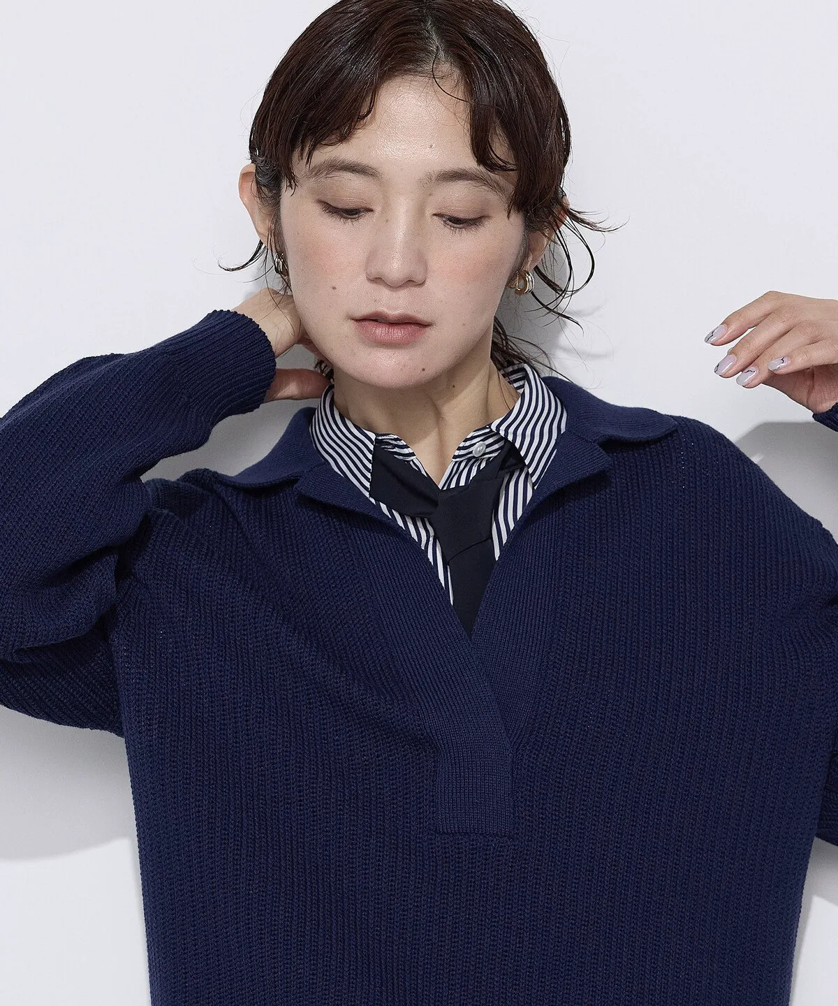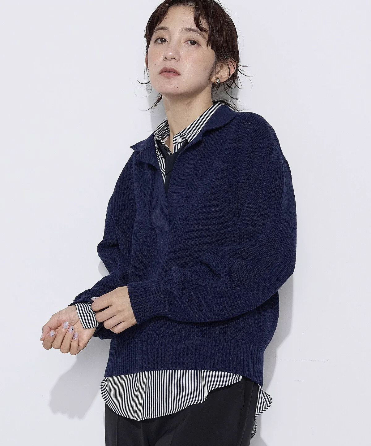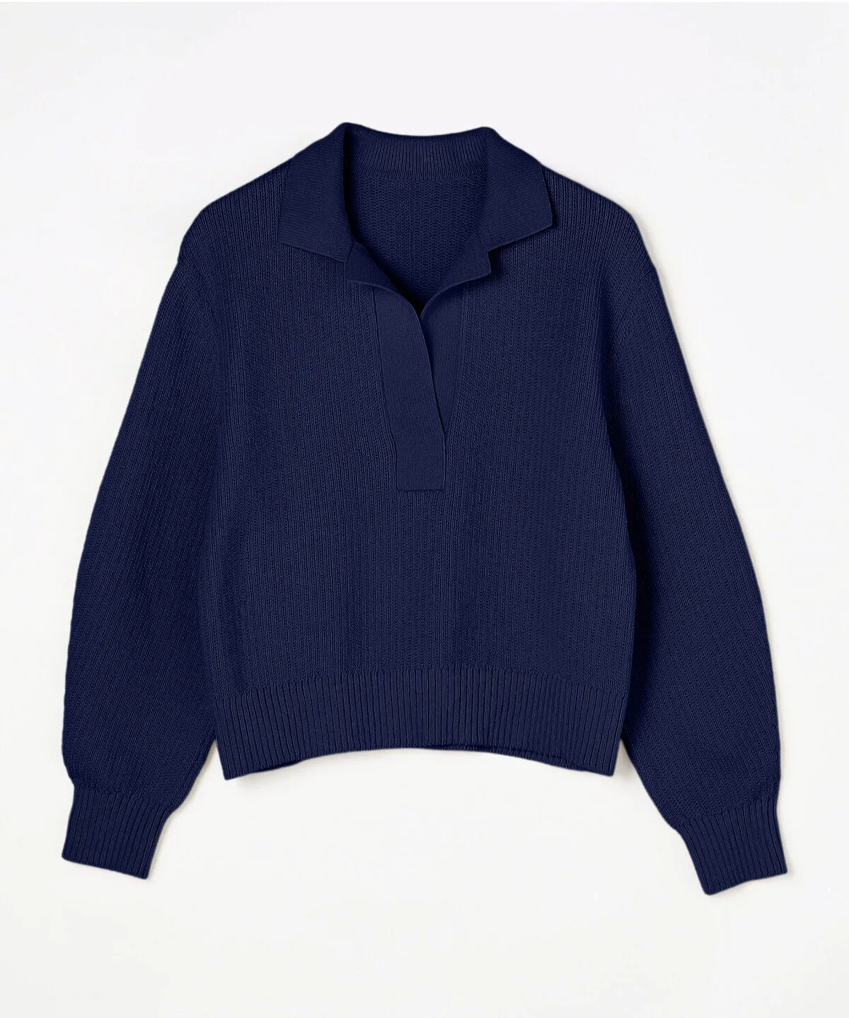 Модный вязаный пуловер, сочетающий в себе воротник-стойку и воротник-поло.