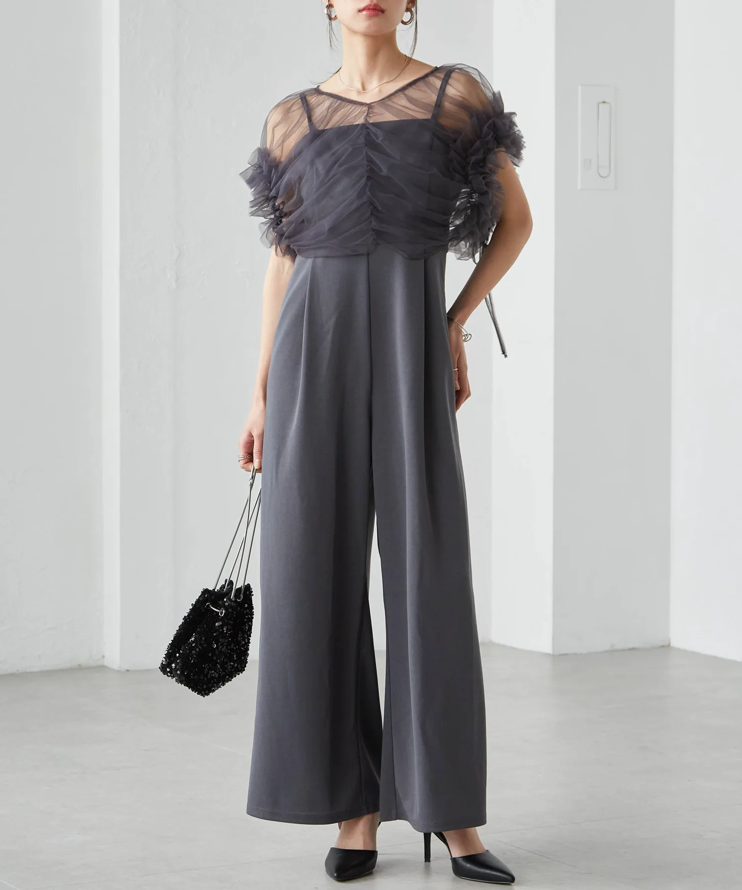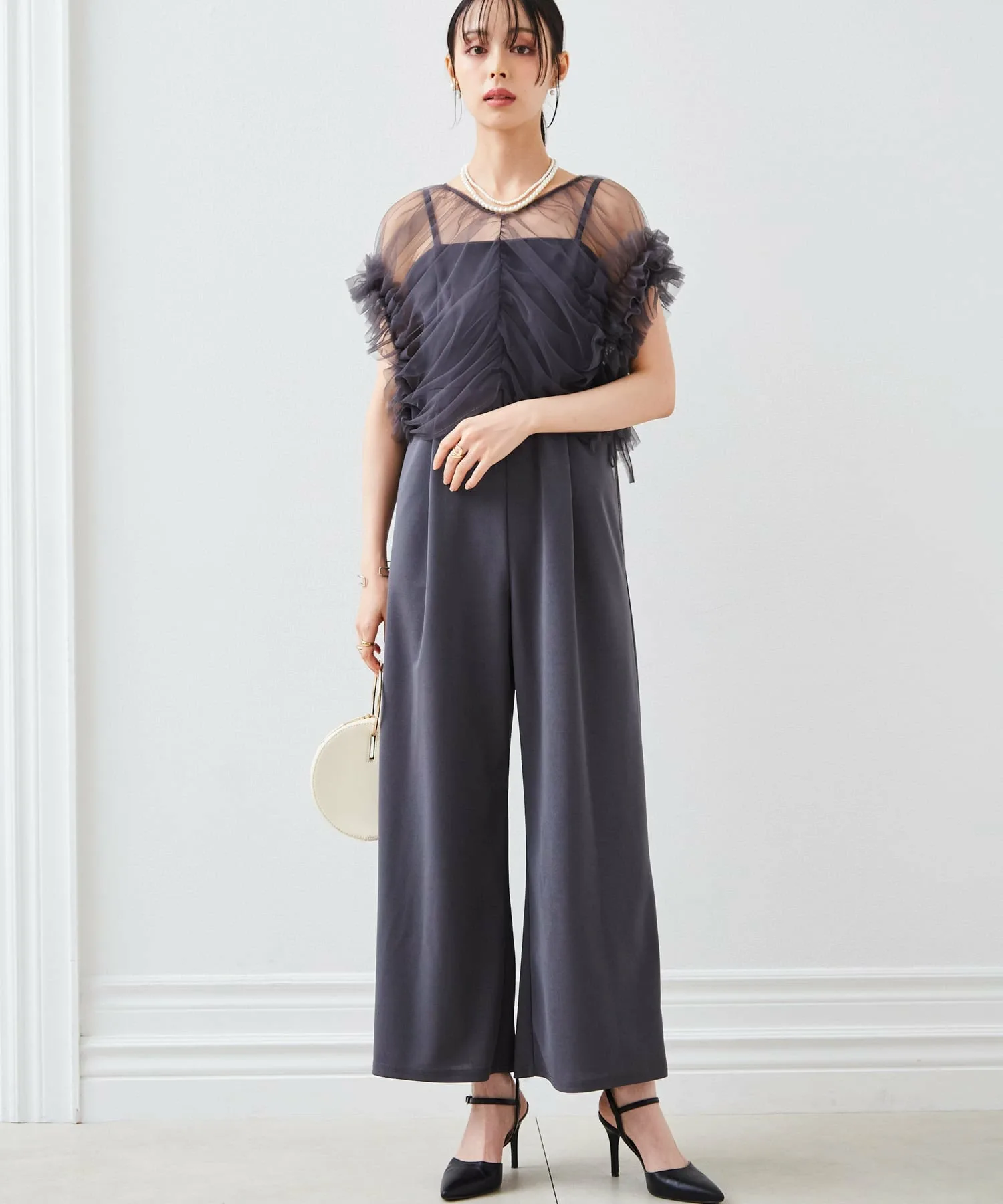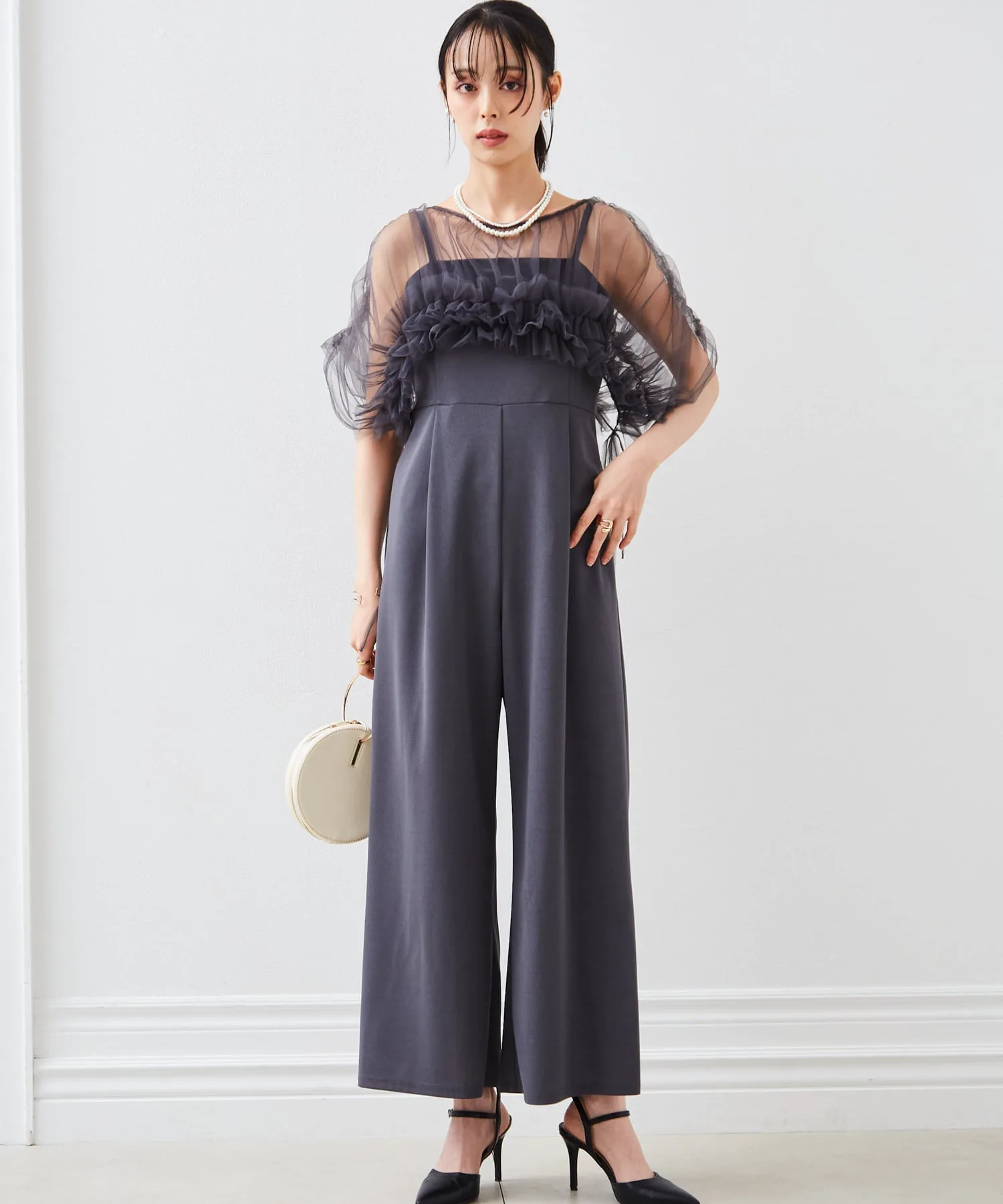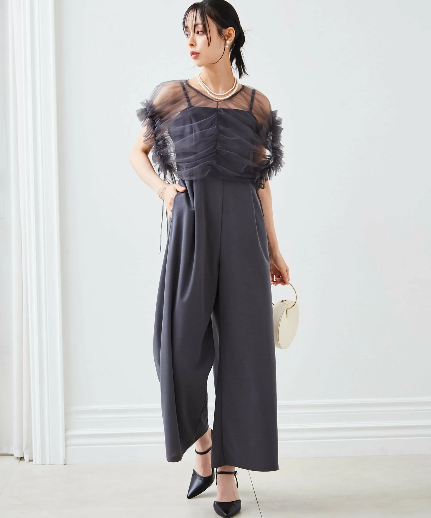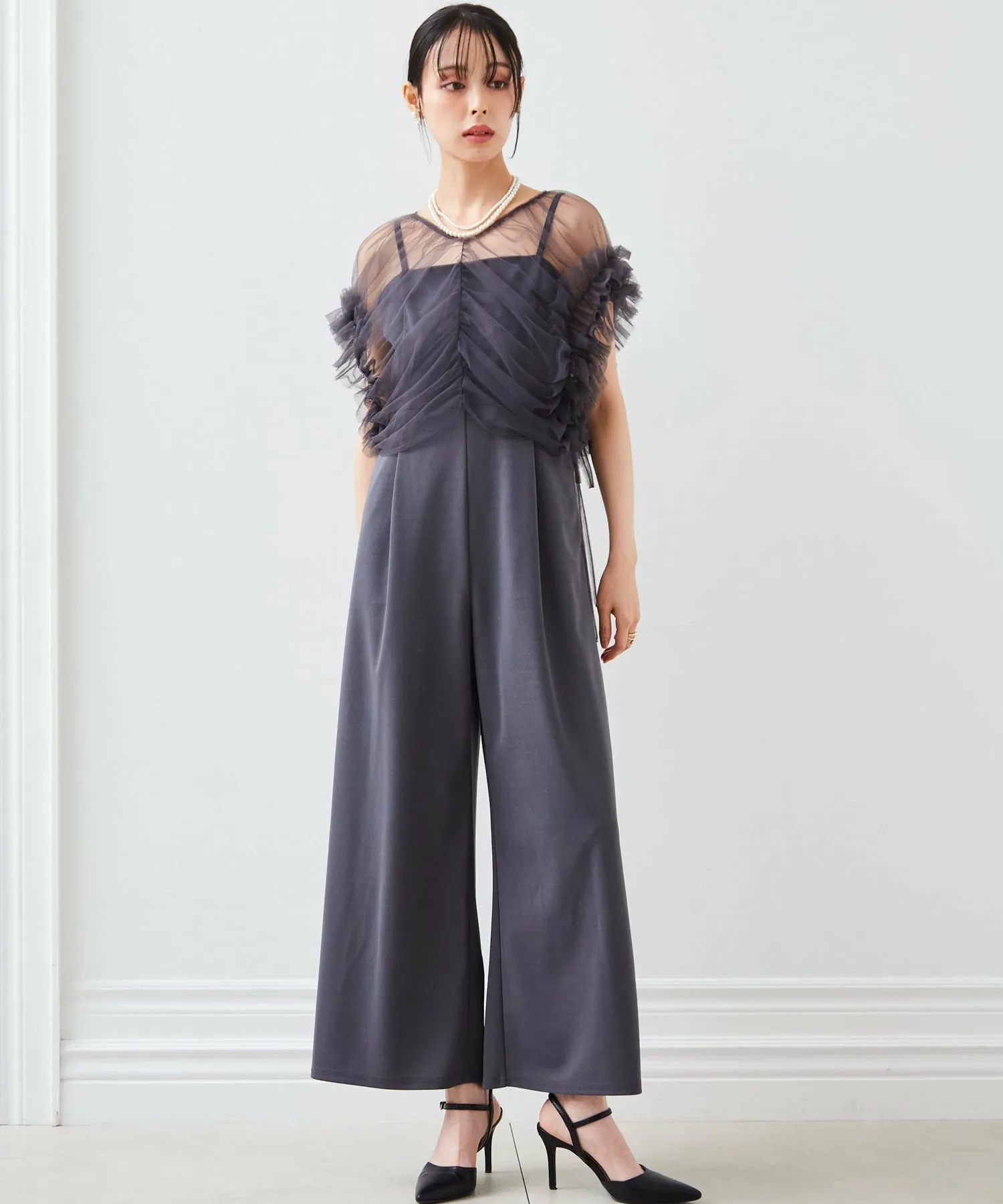 Тюлевое болеро с впечатляющими объемными оборками и платье-брюки с чистым, красивым расклешенным силуэтом.