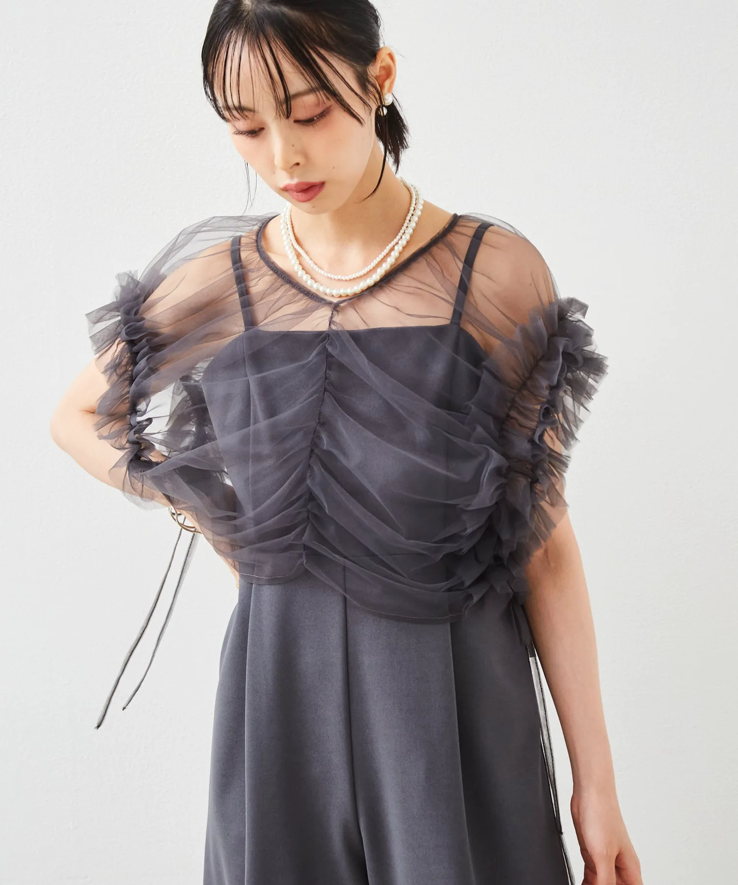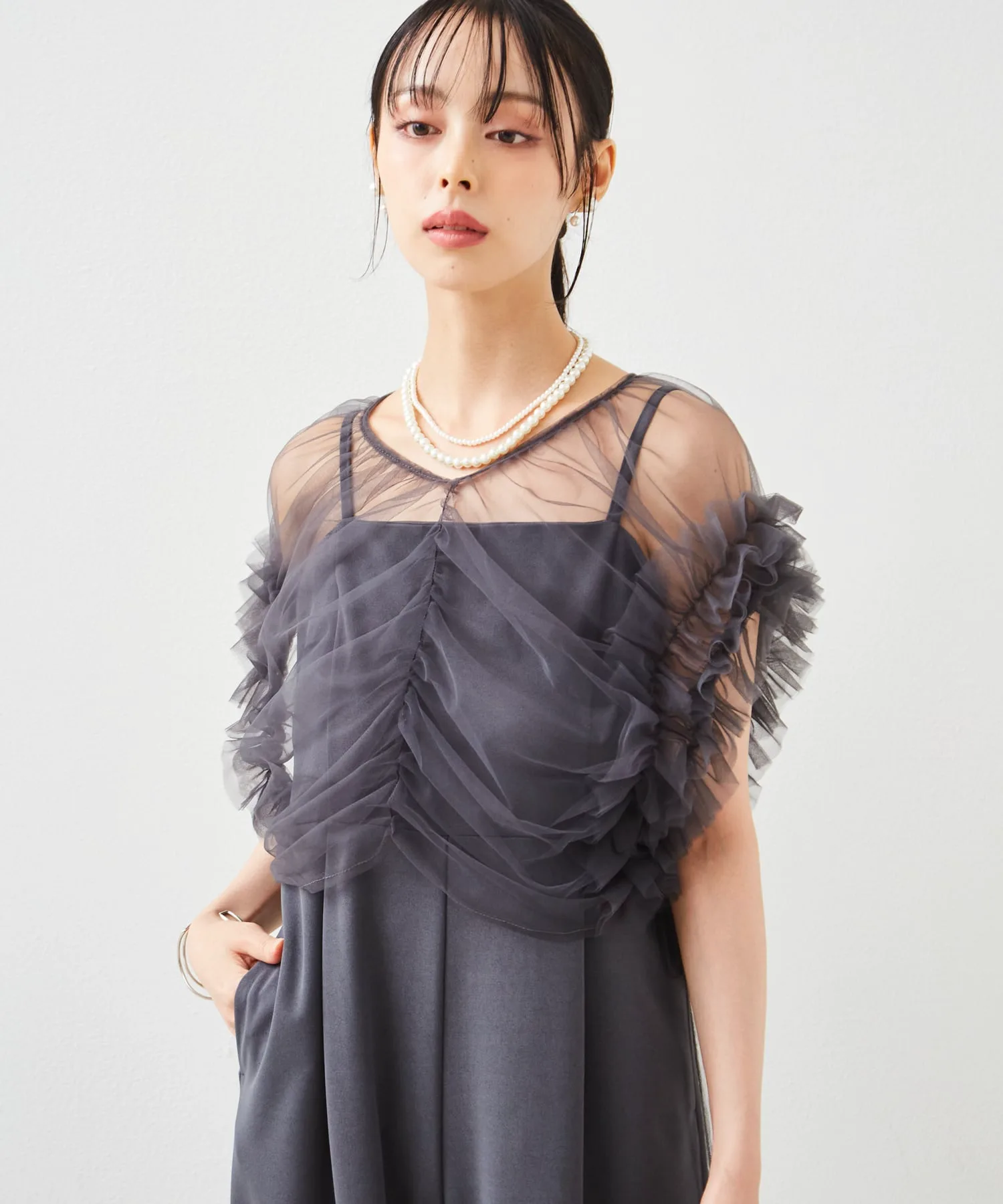 Прозрачный тюль и гладкая текстура платья создают изысканный и непринужденный образ.
