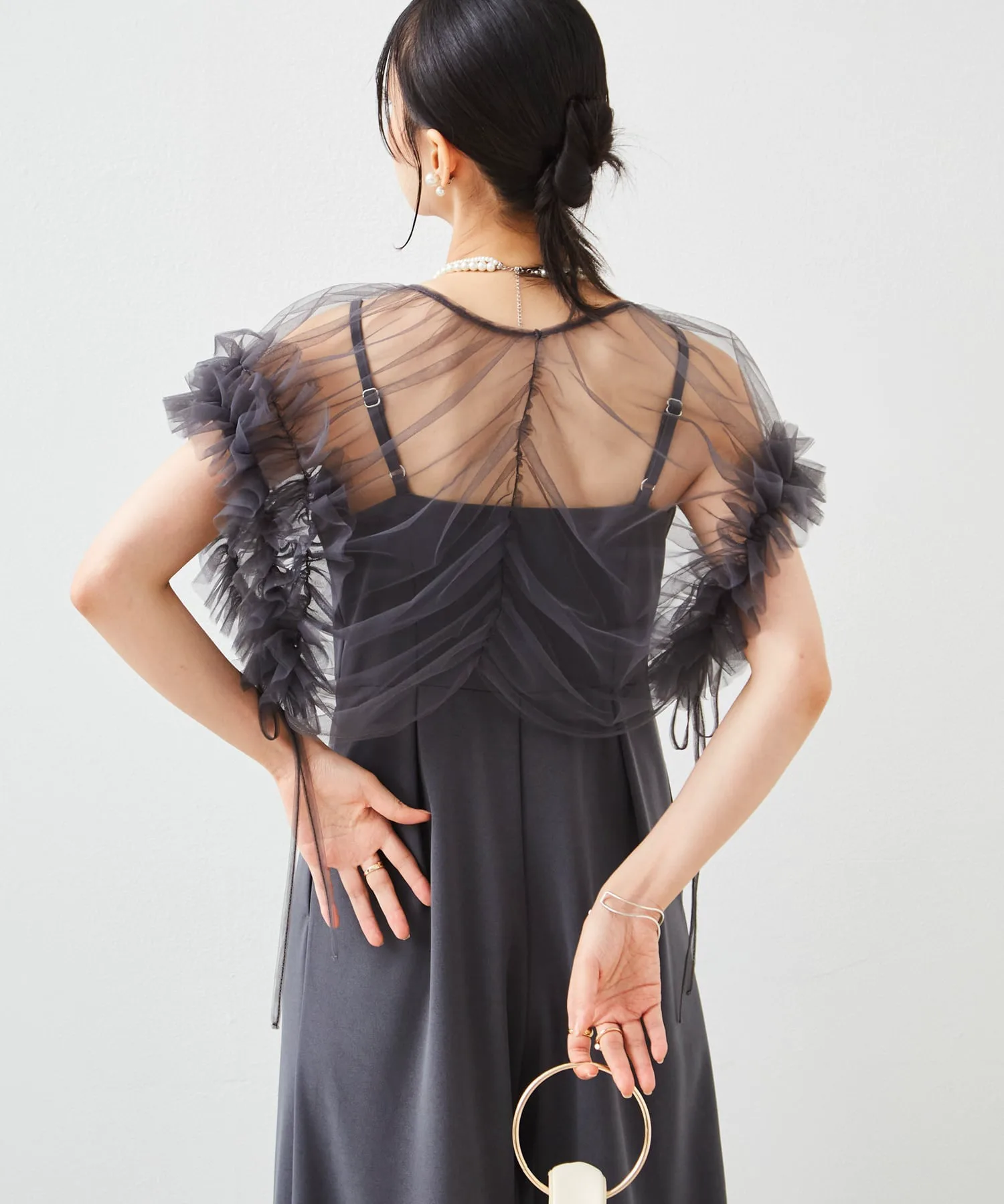 ・Прозрачное тюлевое болеро украшено впечатляющими объемными оборками.