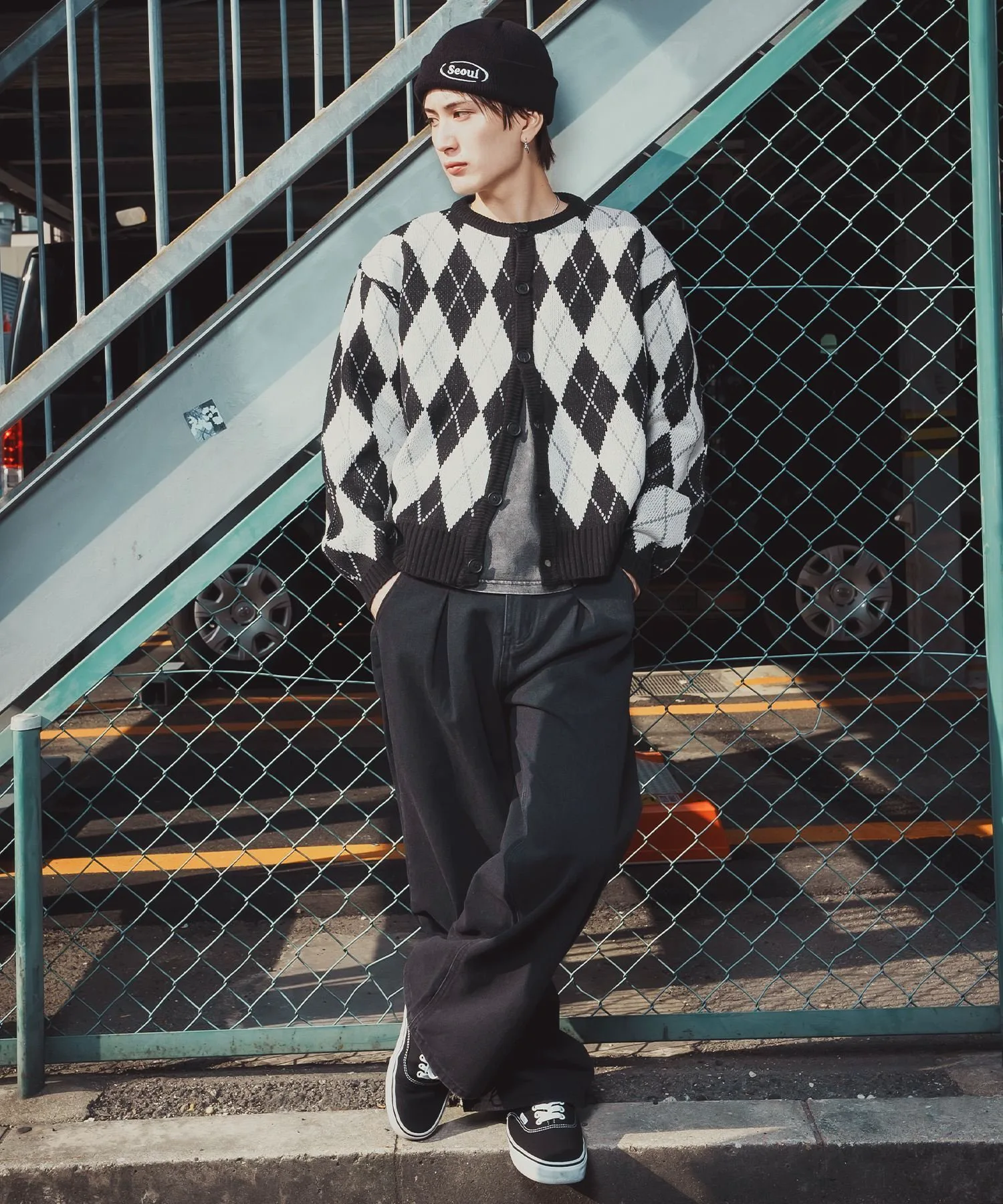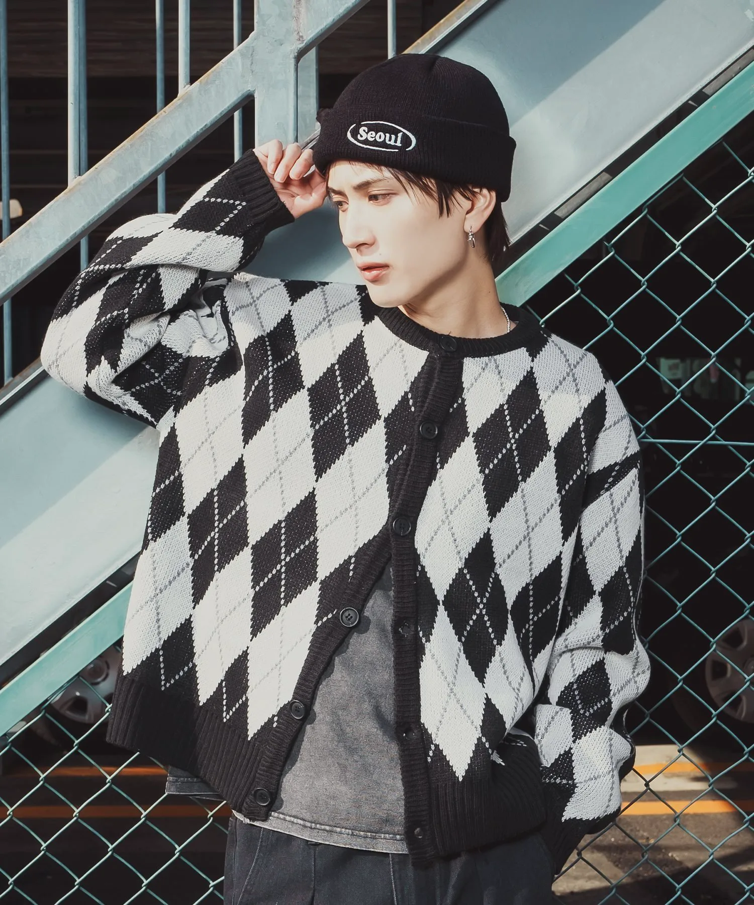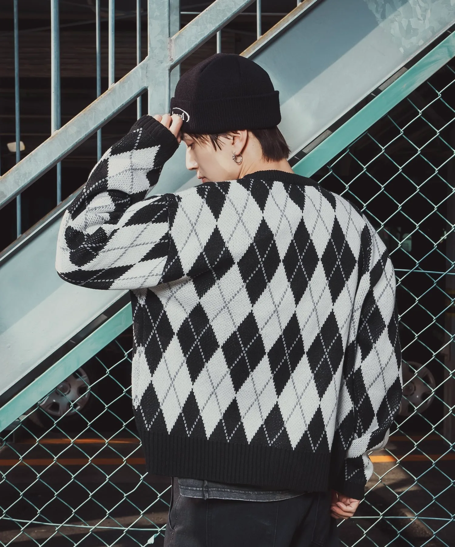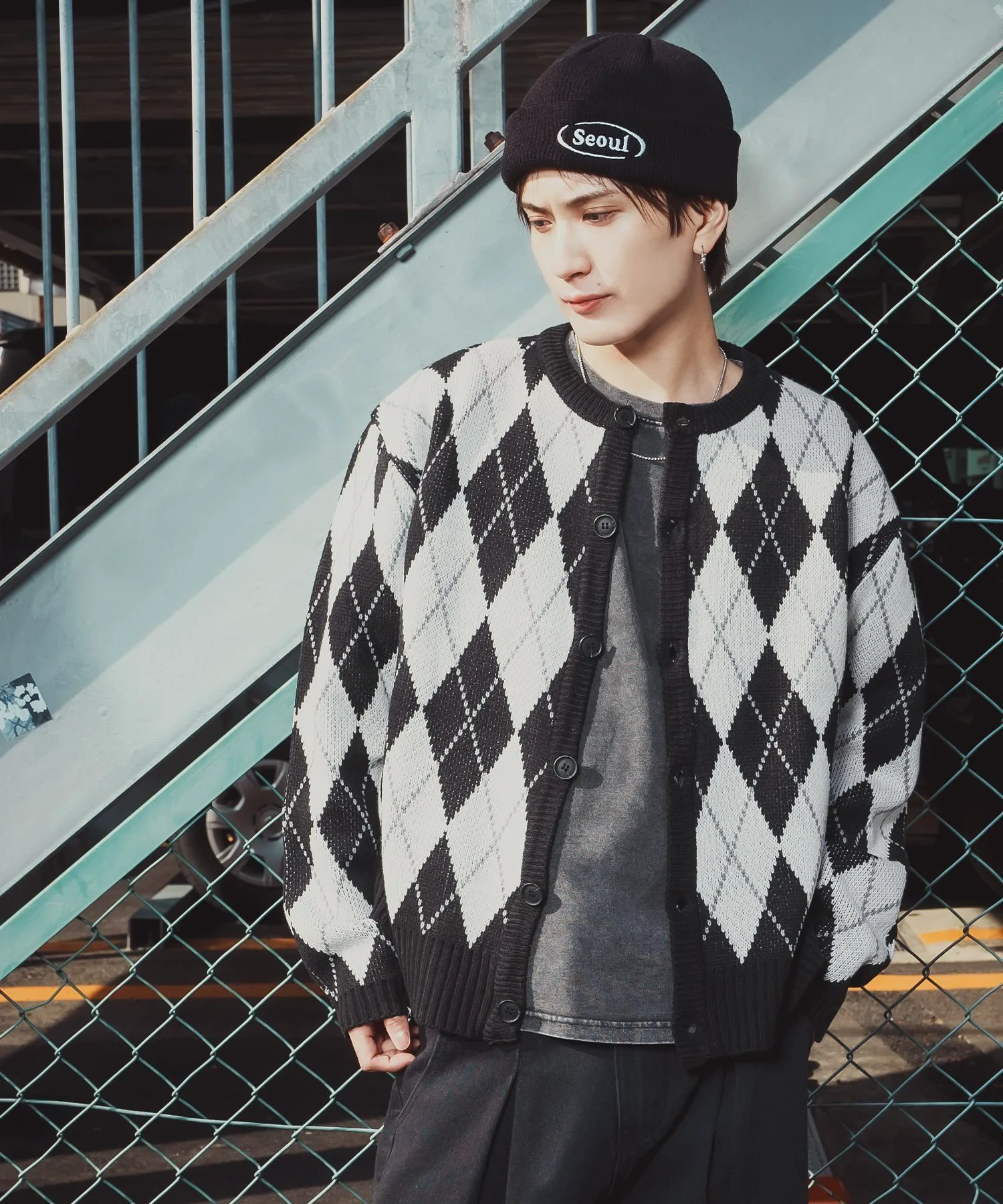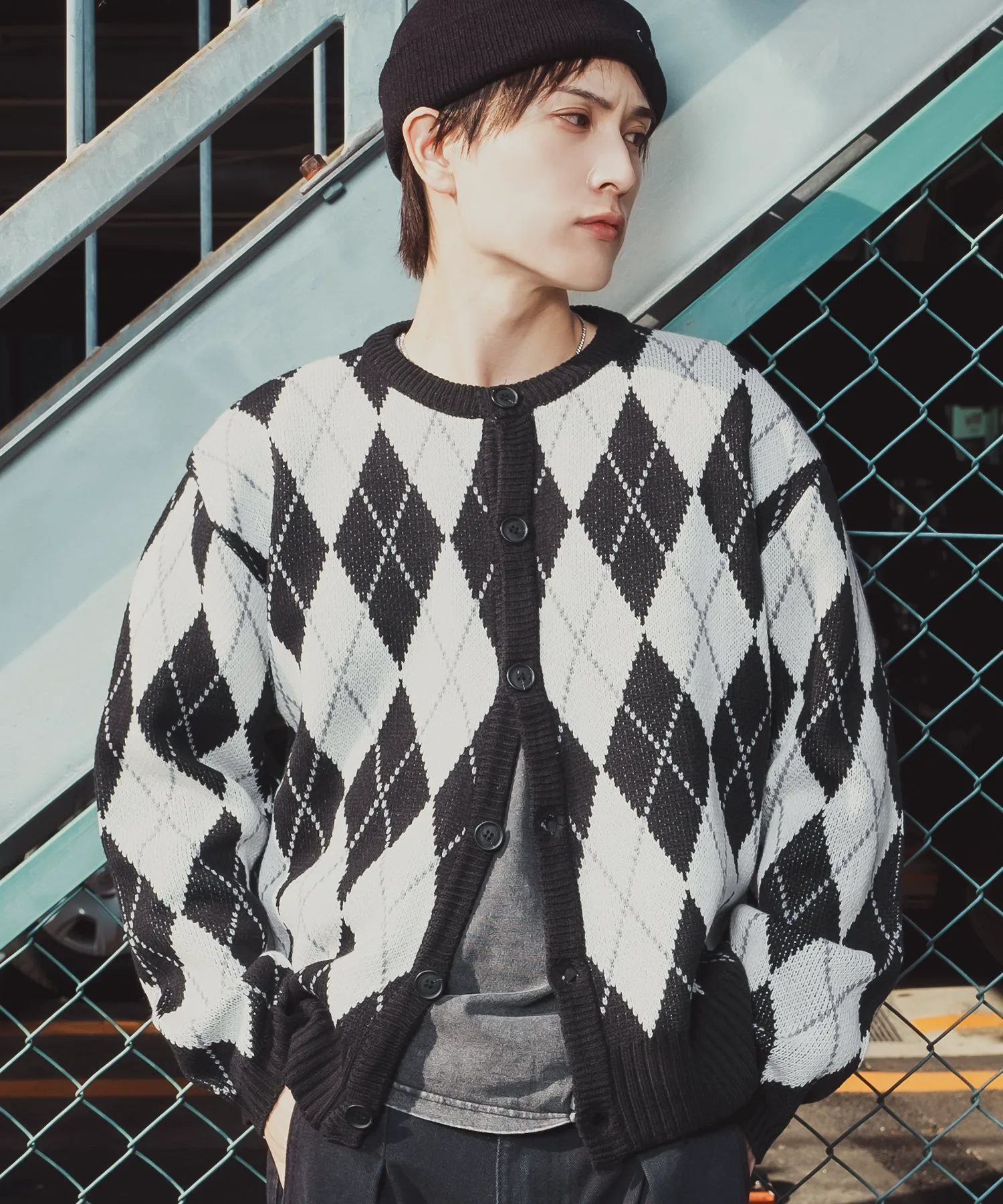 Кардиган с ромбовидным узором, сочетающий ретро-стиль с современным силуэтом.