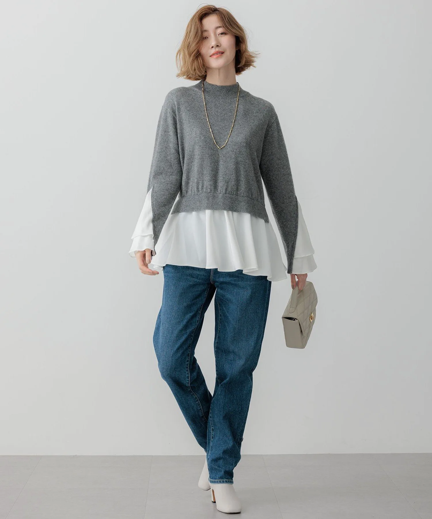 Этот трикотаж отличается привлекательными расклешенными рукавами и подолом. Этот короткий трикотаж имеет слегка свободный крой и современный вид, сочетая в себе мягкий материал для блузок с умеренным блеском. Несмотря на свободный крой, объем рукавов и подола создает женственный силуэт «приталенное и расклешенное». В пояс вшита резинка сзади, что позволяет носить его как пуловер. Рукава имеют V-образный разрез, который расширяется в два слоя, а подол щедро расклешен для элегантного вида. Объемный дизайн отлично сочетается с любым стилем брюк, включая широкие и зауженные. При сочетании с юбкой мы рекомендуем строгий, узкий силуэт. Также хорошо сочетается с курткой из коллекции Oggi. Доступна в четырех цветах: приглушенный серый (#004), яркий черный с блестками (#005), мягкий бежевый (#033) и освежающий синий (#073). Материал: Пушистый, густой мех енота создает женственную и мягкую текстуру. Легкий и тонкий, но при этом теплый, он просто восхитителен. Нежные блестки плотностью 170 ден добавляют тонкий, элегантный блеск. Рукава и подол с оборками выполнены из атласа, который обеспечивает упругую текстуру. Этот материал красиво драпируется, блестит и тянется. *Изображение является образцом; фактический продукт может отличаться по размеру и отделке.