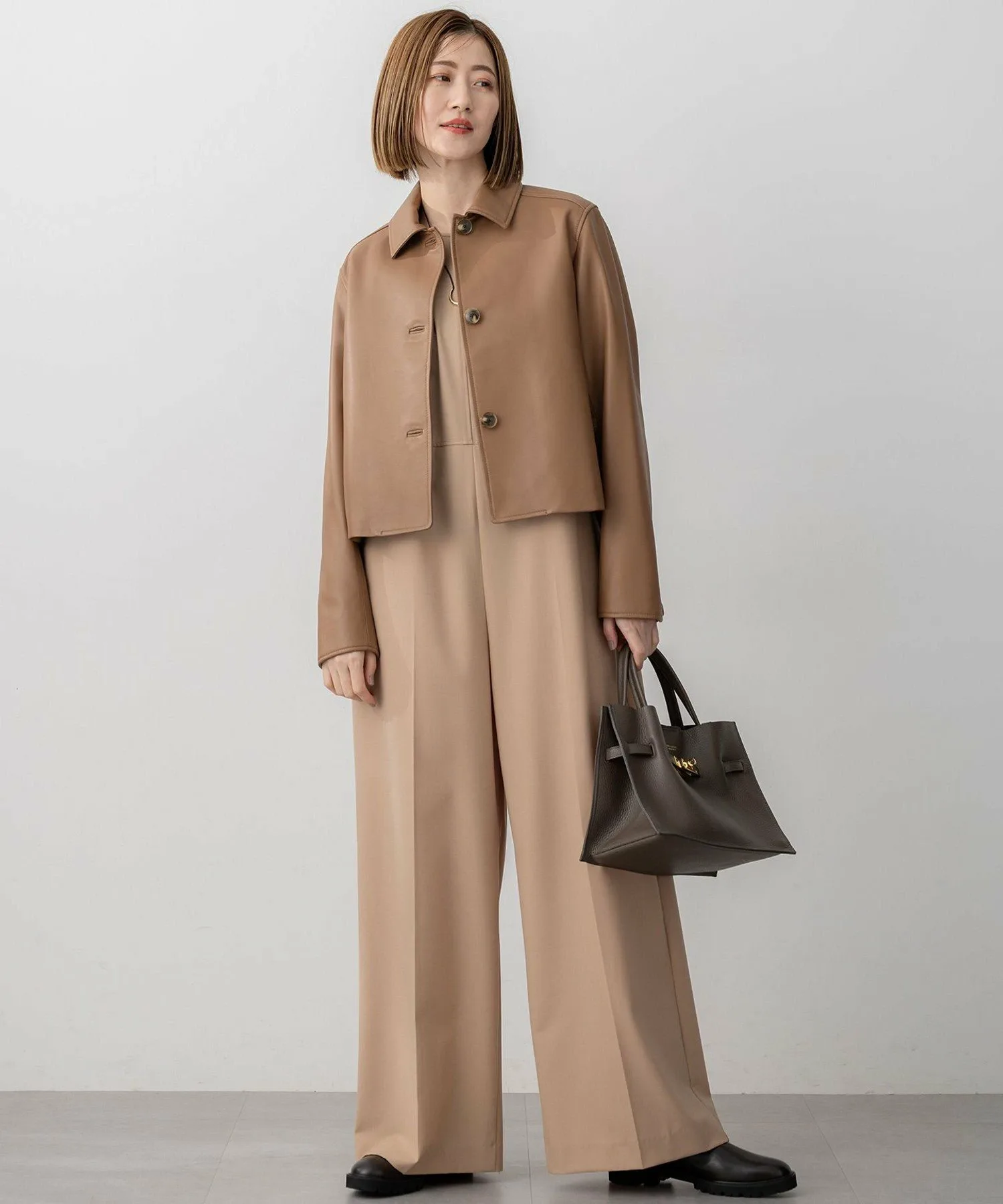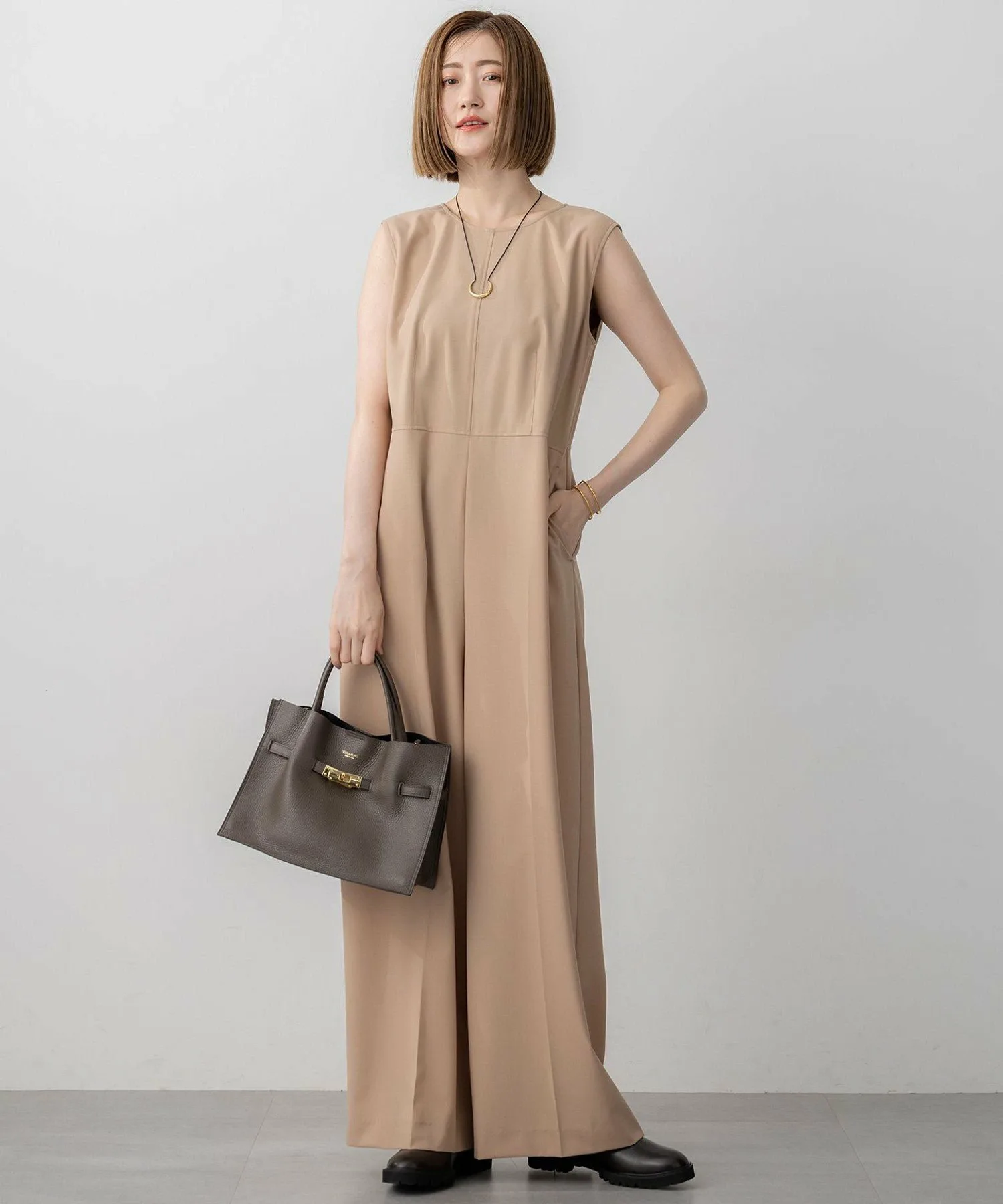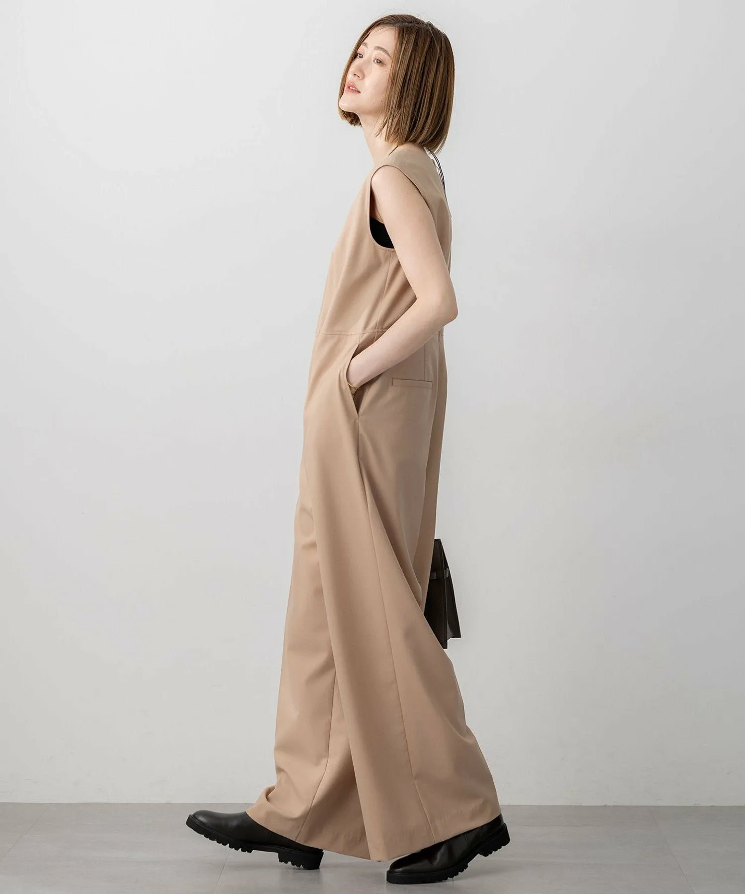 Этот комбинезон отличается простым и изысканным видом. Умеренно свободный силуэт и высокая талия создают утонченный образ даже при ношении отдельно. Простые, но тщательно проработанные детали, такие как воротник, крой рукавов и боковые карманы, излучают ощущение высокого мастерства. Задняя молния ненавязчиво подчеркнута репсовой лентой. Мы также рекомендуем сочетать его с жилетом или рубашкой из того же материала. Доступен в двух цветах: элегантный и классический верблюжий (#034) и изысканный, глубокий угольно-серый (#004).