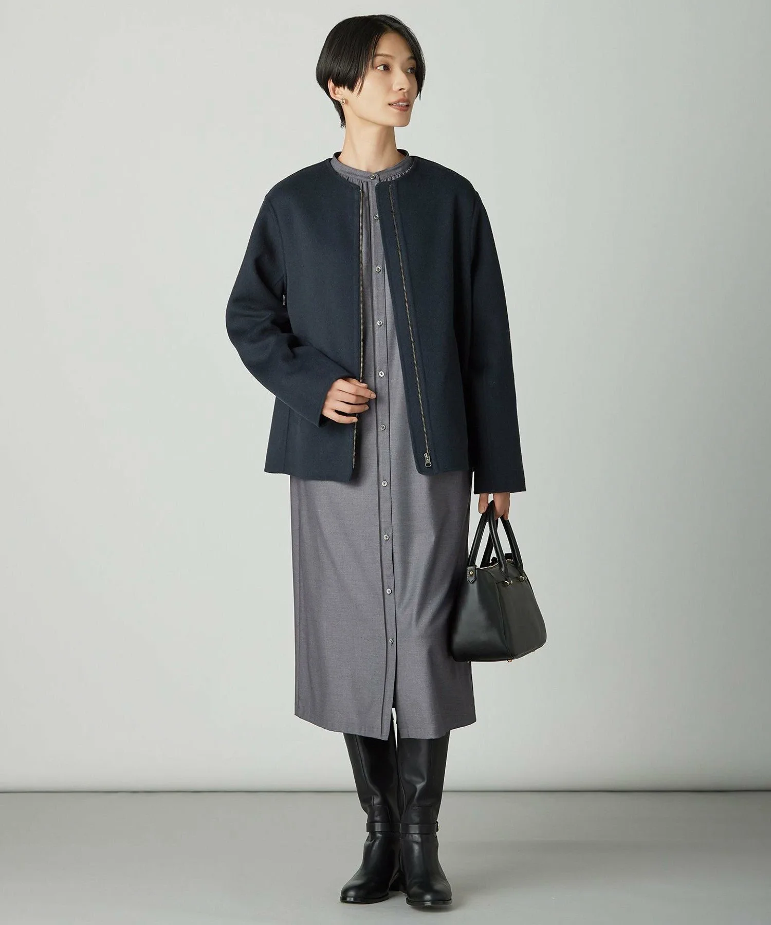 Насладитесь сменой силуэта! Платье-рубашка с аккуратным воротником-стойкой. Дизайн: Это платье-рубашка имеет А-образный силуэт. Одна сторона переднего разреза отделана кантом с легким блеском, что добавляет элегантности. Завяжите талию прикрепленной лентой для более женственного образа. Это универсальное изделие также можно носить как жакет с брюками. Без подкладки. Доступно в трех цветах: приглушенный серый (#003), изысканный темно-коричневый (#035) и универсальный темно-синий (#075). Материал: Эта габардиновая ткань представляет собой смесь полиэстера и вискозы, что придает платью аккуратный и опрятный вид. Тщательно отобранные длинные волокна минимизируют образование катышков, а отделка «ситц» добавляет легкий блеск. Свободный крой минимизирует складки и обеспечивает защиту от УФ-излучения.