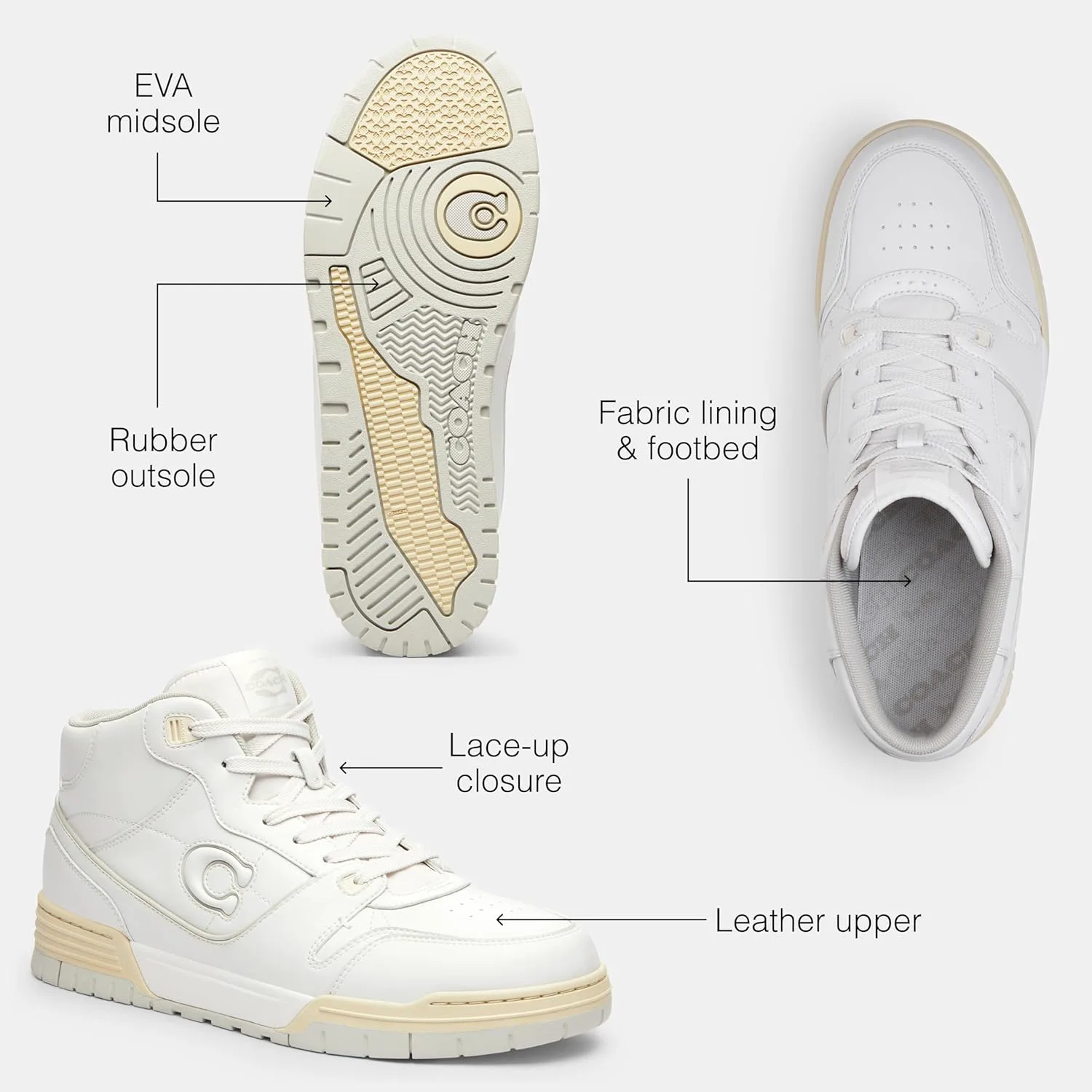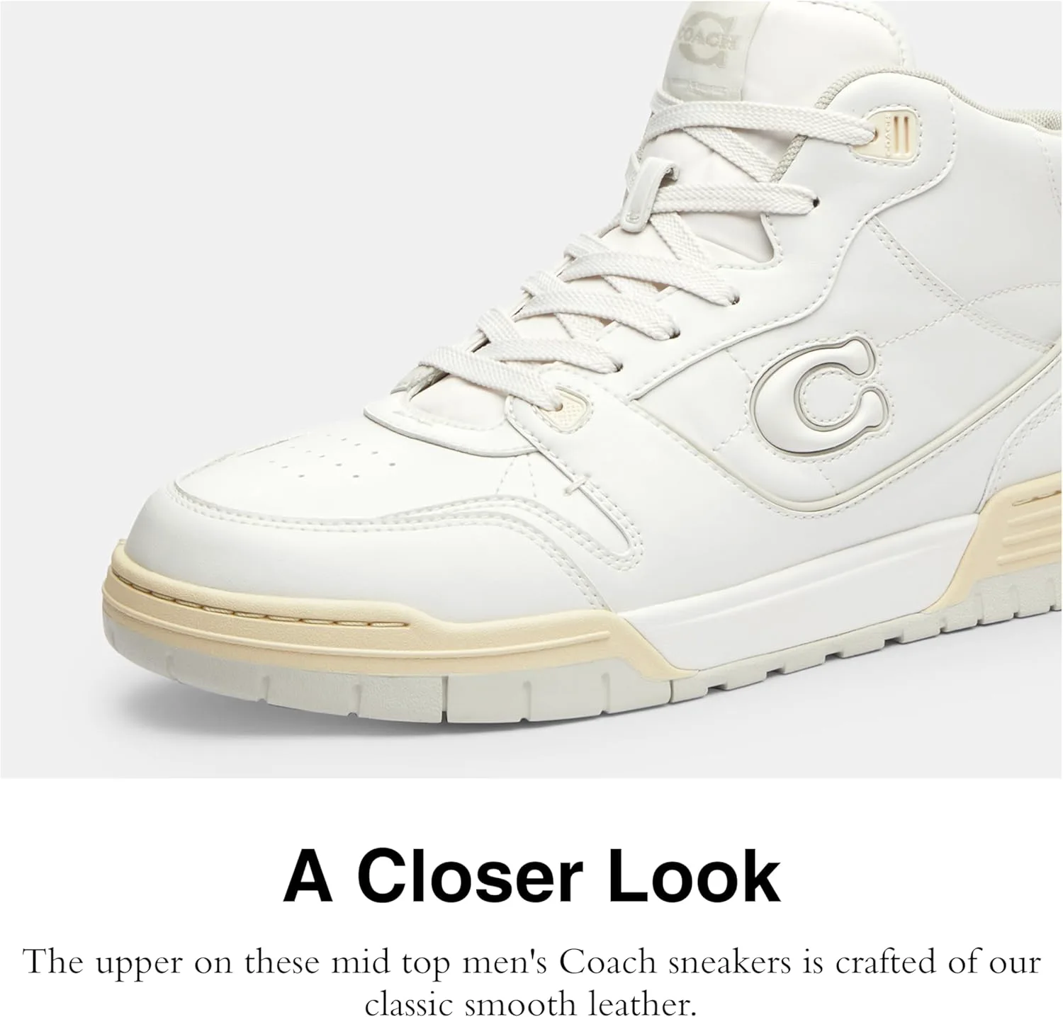 Наша фирменная ткань: Лучшее сочетание. Этот богатый смешанный дизайн из кожи объединяет изысканную гладкую кожу с нашей фирменной тканью, создавая идеально знаковую модель кроссовок Coach средней высоты.