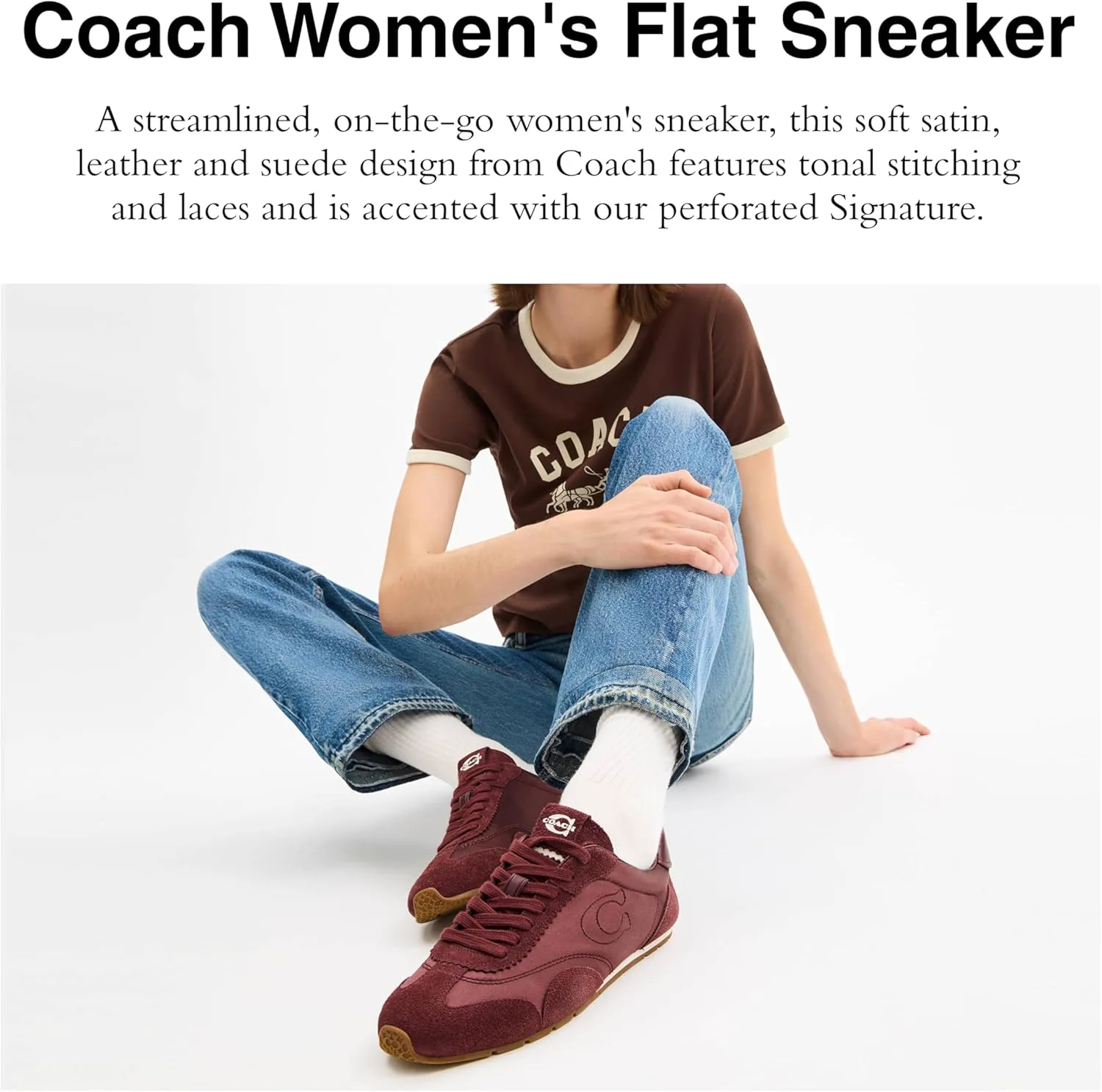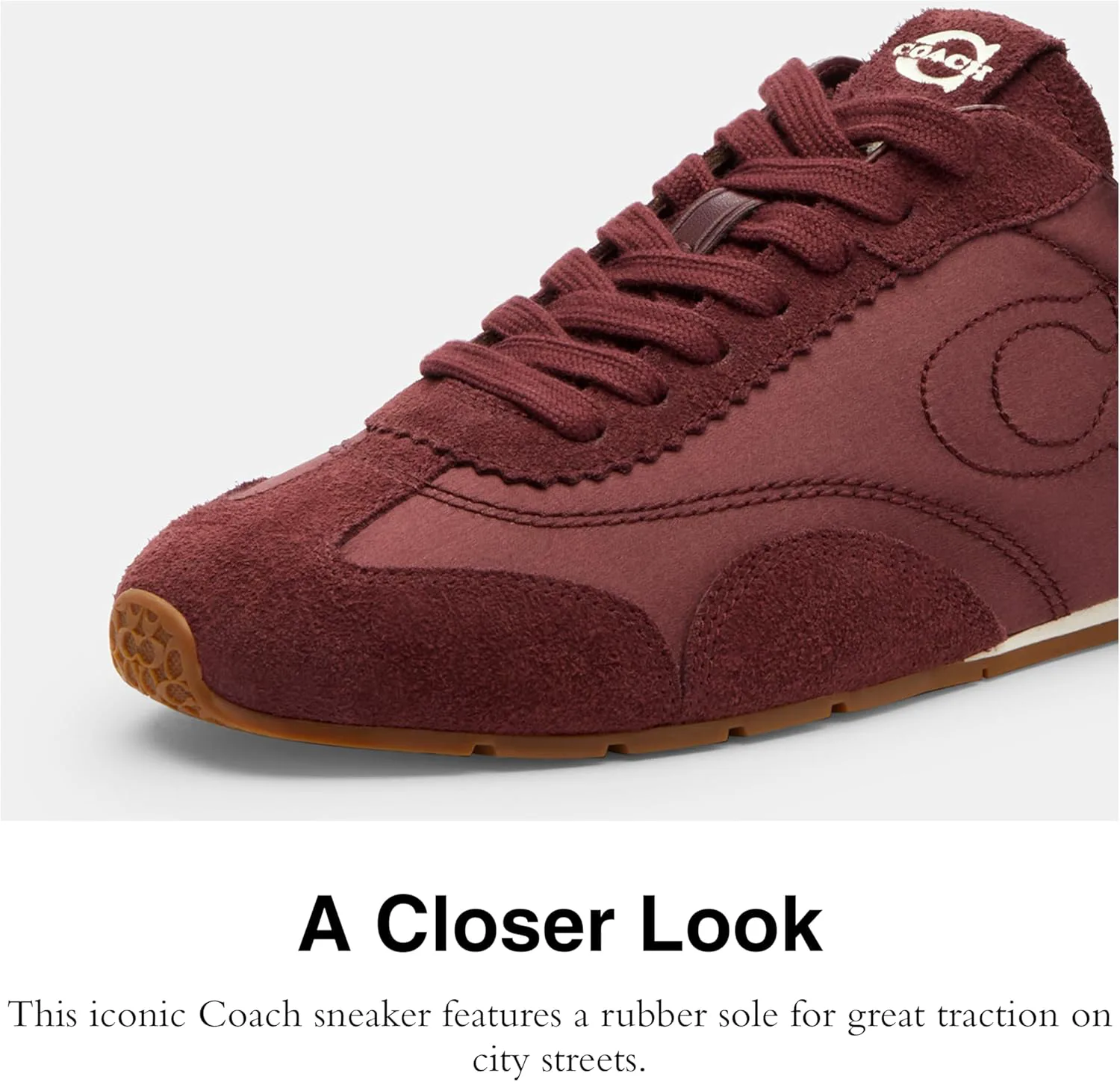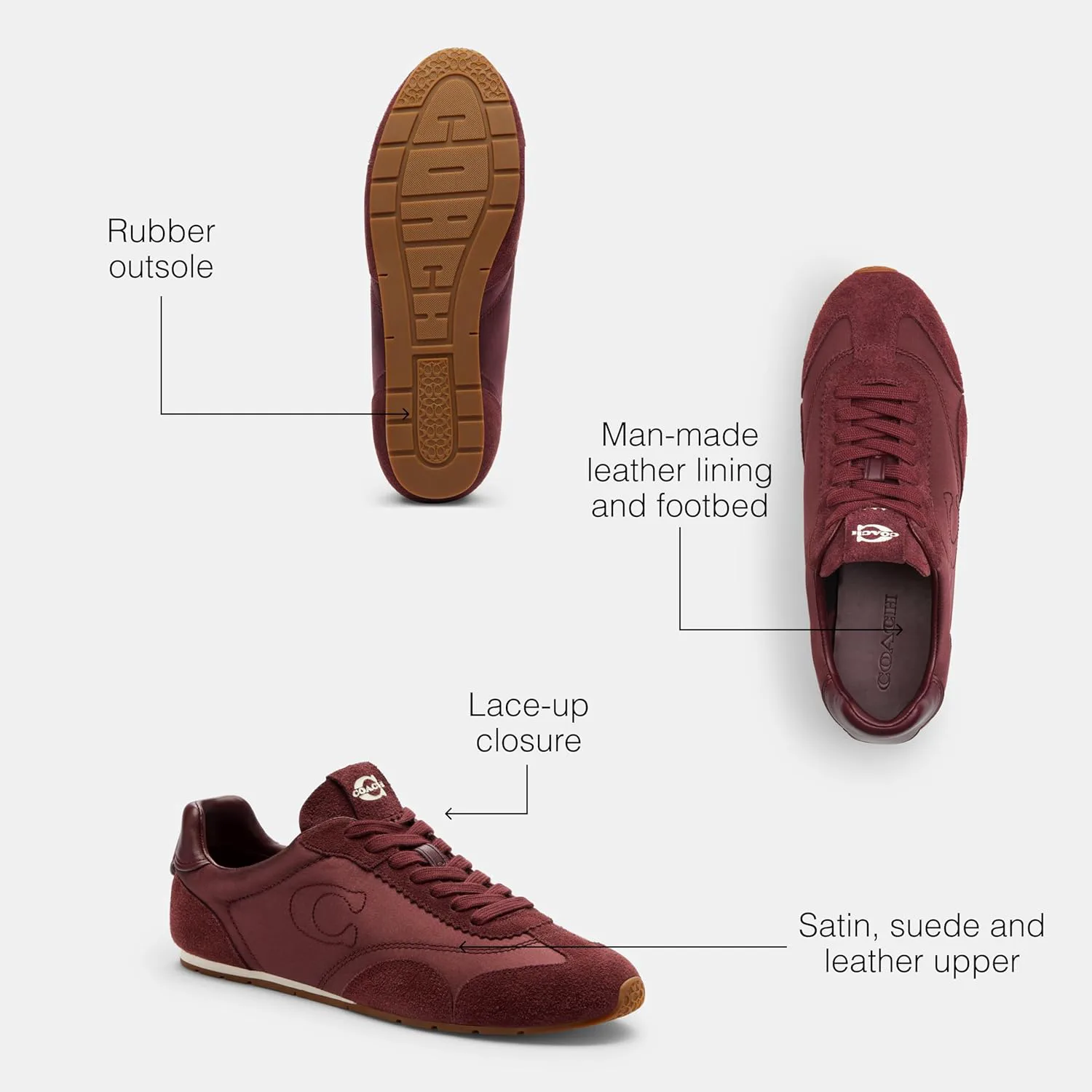 Жаккард, замша и кожа: Изготовлены из нашего фирменного жаккарда, искусственной кожи и невероятно приятной на ощупь, мягкой и эластичной замши - для роскошного кроссовка Coach