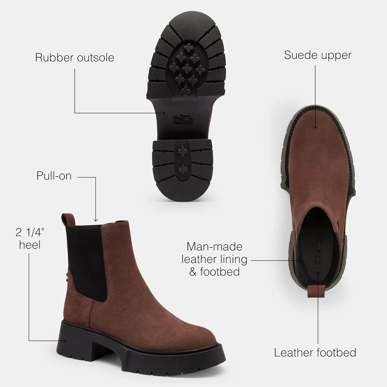 Происхождение: Импорт Материал подошвы: Кожа Высота голенища: До щиколотки Обхват голенища: 5,71 дюйма Отдел: женский Производитель: Coach