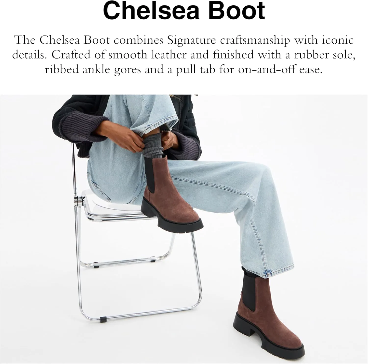 Ботильоны Chelsea сочетают фирменное мастерство с культовыми деталями. Изготовлены из гладкой кожи и оснащены резиновой подошвой, ребристыми вставками на щиколотке и петлей для легкости надевания и снятия. Верх из замши и резины, подкладка из искусственной кожи, стелька из кожи, резиновая подошва, модель без застежки, высота голенища: 14,5 см, окружность голенища: 24,5 см, высота каблука: 5,7 см.