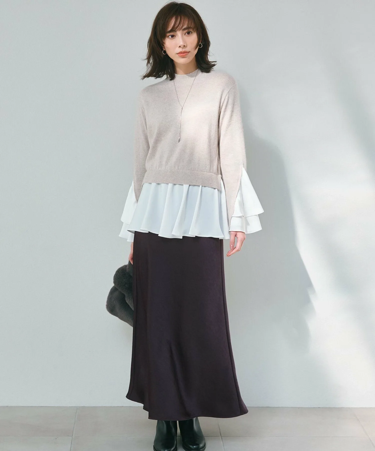 Этот трикотаж отличается привлекательными расклешенными рукавами и подолом. Этот короткий трикотаж имеет слегка свободный крой и современный вид, сочетая в себе мягкий материал для блузок с умеренным блеском. Несмотря на свободный крой, объем рукавов и подола создает женственный силуэт «приталенное и расклешенное». В пояс вшита резинка сзади, что позволяет носить его как пуловер. Рукава имеют V-образный разрез, который расширяется в два слоя, а подол щедро расклешен для элегантного вида. Объемный дизайн отлично сочетается с любым стилем брюк, включая широкие и зауженные. При сочетании с юбкой мы рекомендуем строгий, узкий силуэт. Также хорошо сочетается с курткой из коллекции Oggi. Доступна в четырех цветах: приглушенный серый (#004), яркий черный с блестками (#005), мягкий бежевый (#033) и освежающий синий (#073). Материал: Пушистый, густой мех енота создает женственную и мягкую текстуру. Легкий и тонкий, но при этом теплый, он просто восхитителен. Нежные блестки плотностью 170 ден добавляют тонкий, элегантный блеск. Рукава и подол с оборками выполнены из атласа, который обеспечивает упругую текстуру. Этот материал красиво драпируется, блестит и тянется. *Изображение является образцом; фактический продукт может отличаться по размеру и отделке.