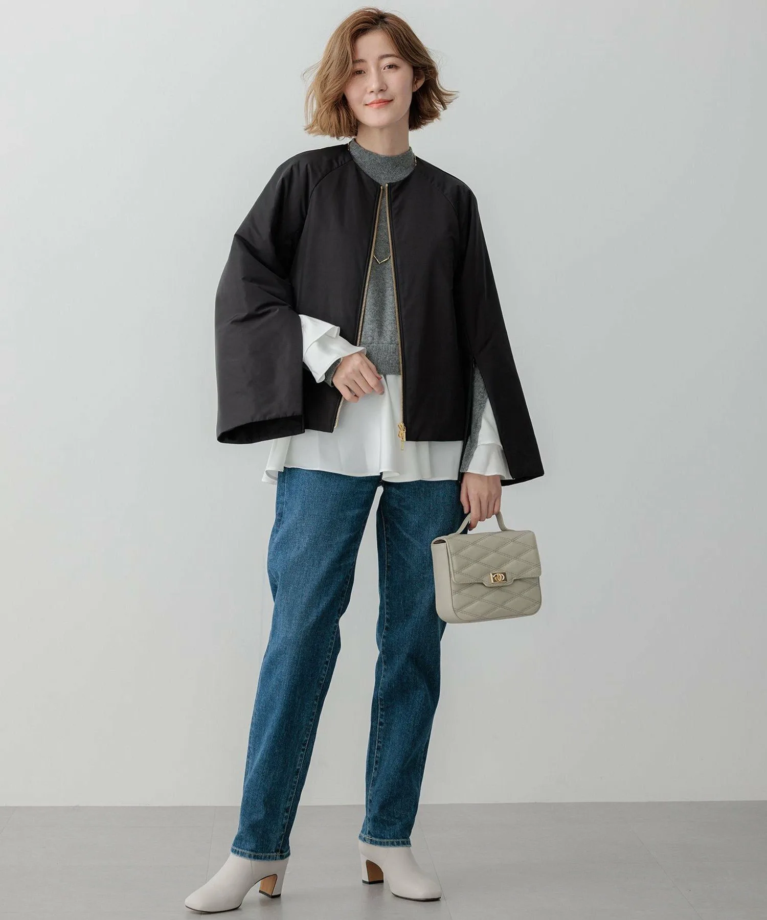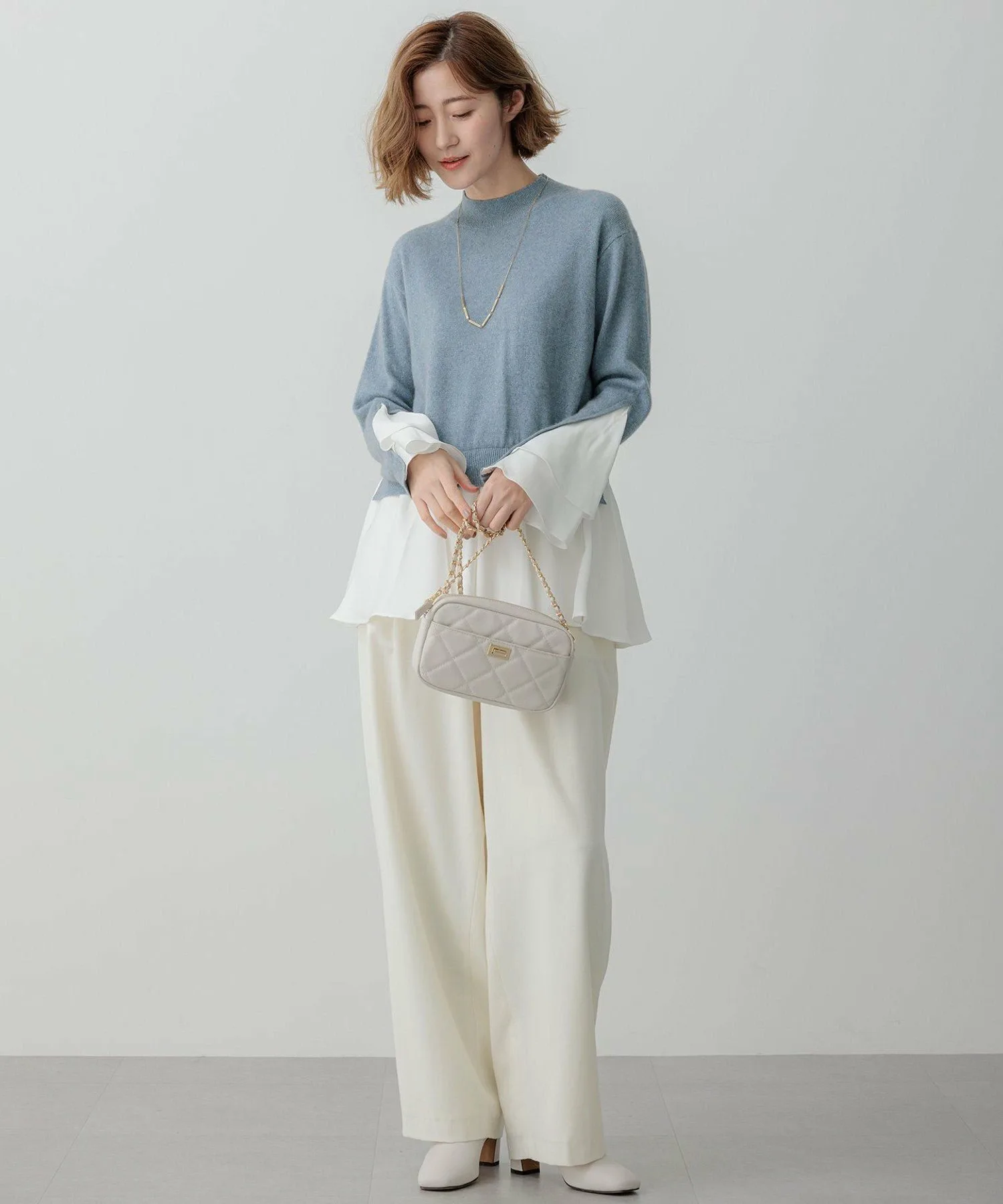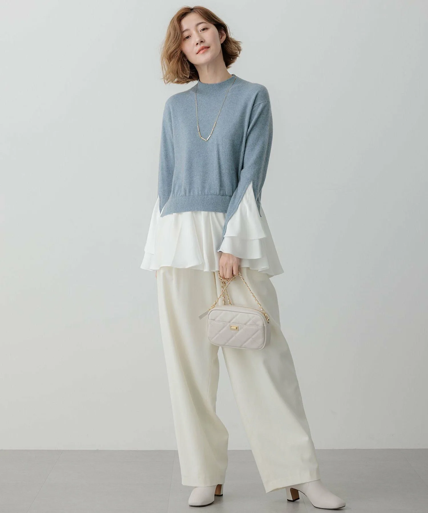 Этот трикотаж отличается привлекательными расклешенными рукавами и подолом. Этот короткий трикотаж имеет слегка свободный крой и современный вид, сочетая в себе мягкий материал для блузок с умеренным блеском. Несмотря на свободный крой, объем рукавов и подола создает женственный силуэт «приталенное и расклешенное». В пояс вшита резинка сзади, что позволяет носить его как пуловер. Рукава имеют V-образный разрез, который расширяется в два слоя, а подол щедро расклешен для элегантного вида. Объемный дизайн отлично сочетается с любым стилем брюк, включая широкие и зауженные. При сочетании с юбкой мы рекомендуем строгий, узкий силуэт. Также хорошо сочетается с курткой из коллекции Oggi. Доступна в четырех цветах: приглушенный серый (#004), яркий черный с блестками (#005), мягкий бежевый (#033) и освежающий синий (#073). Материал: Пушистый, густой мех енота создает женственную и мягкую текстуру. Легкий и тонкий, но при этом теплый, он просто восхитителен. Нежные блестки плотностью 170 ден добавляют тонкий, элегантный блеск. Рукава и подол с оборками выполнены из атласа, который обеспечивает упругую текстуру. Этот материал красиво драпируется, блестит и тянется. *Изображение является образцом; фактический продукт может отличаться по размеру и отделке.