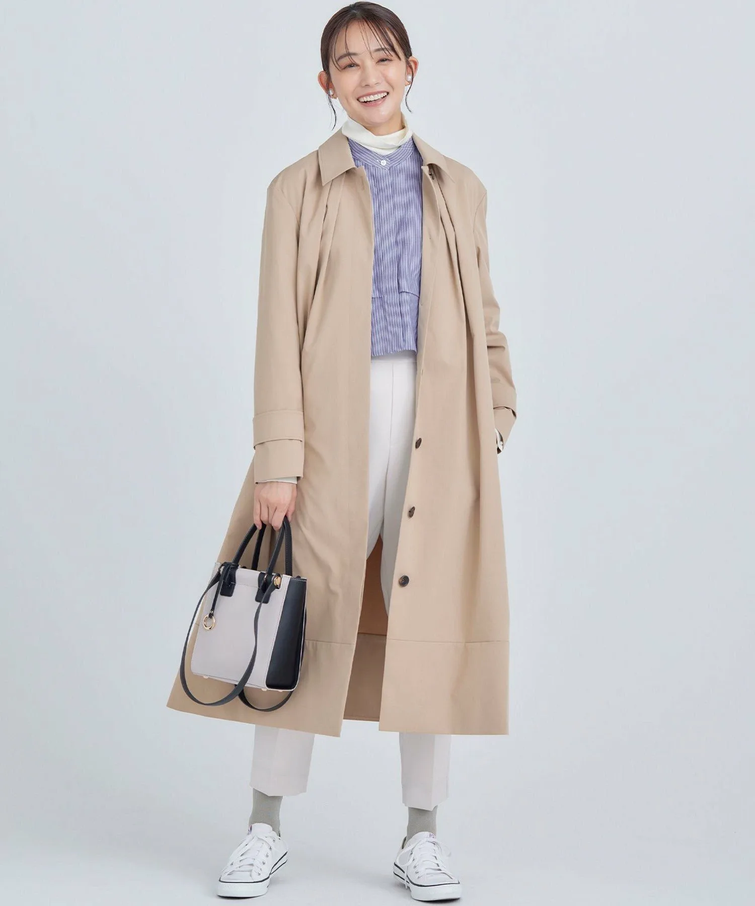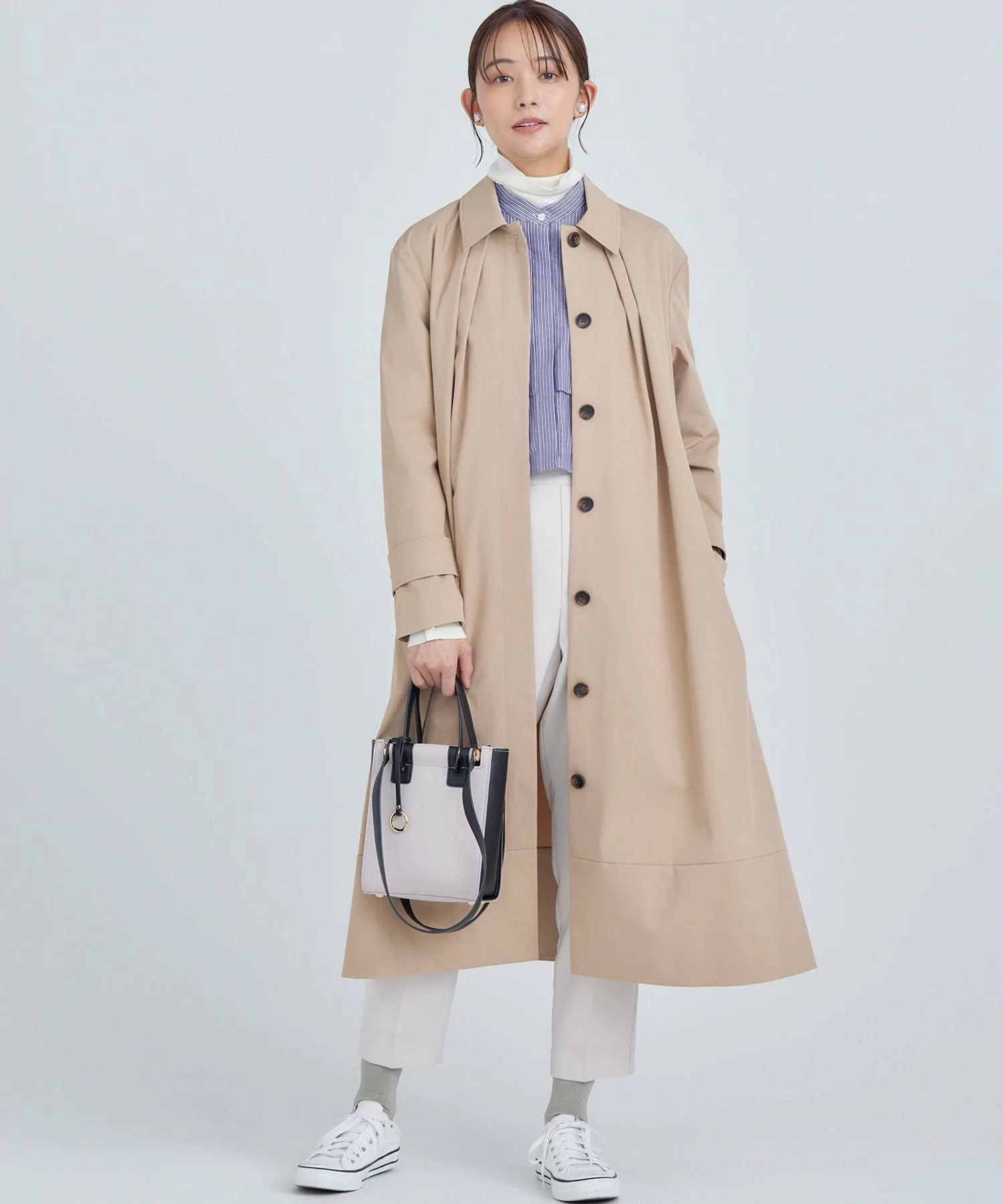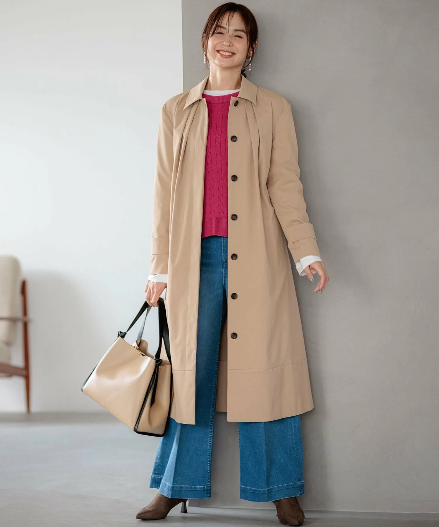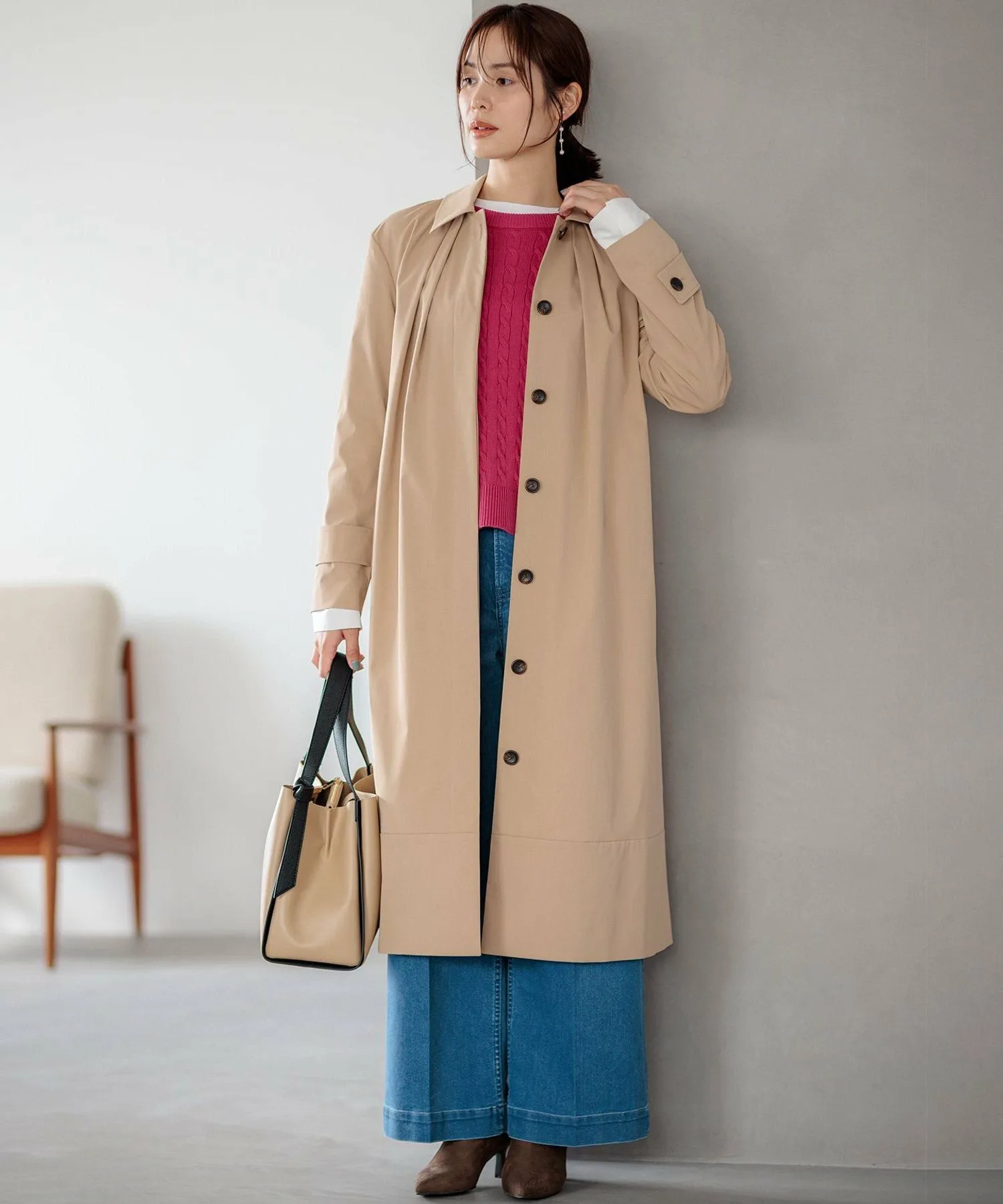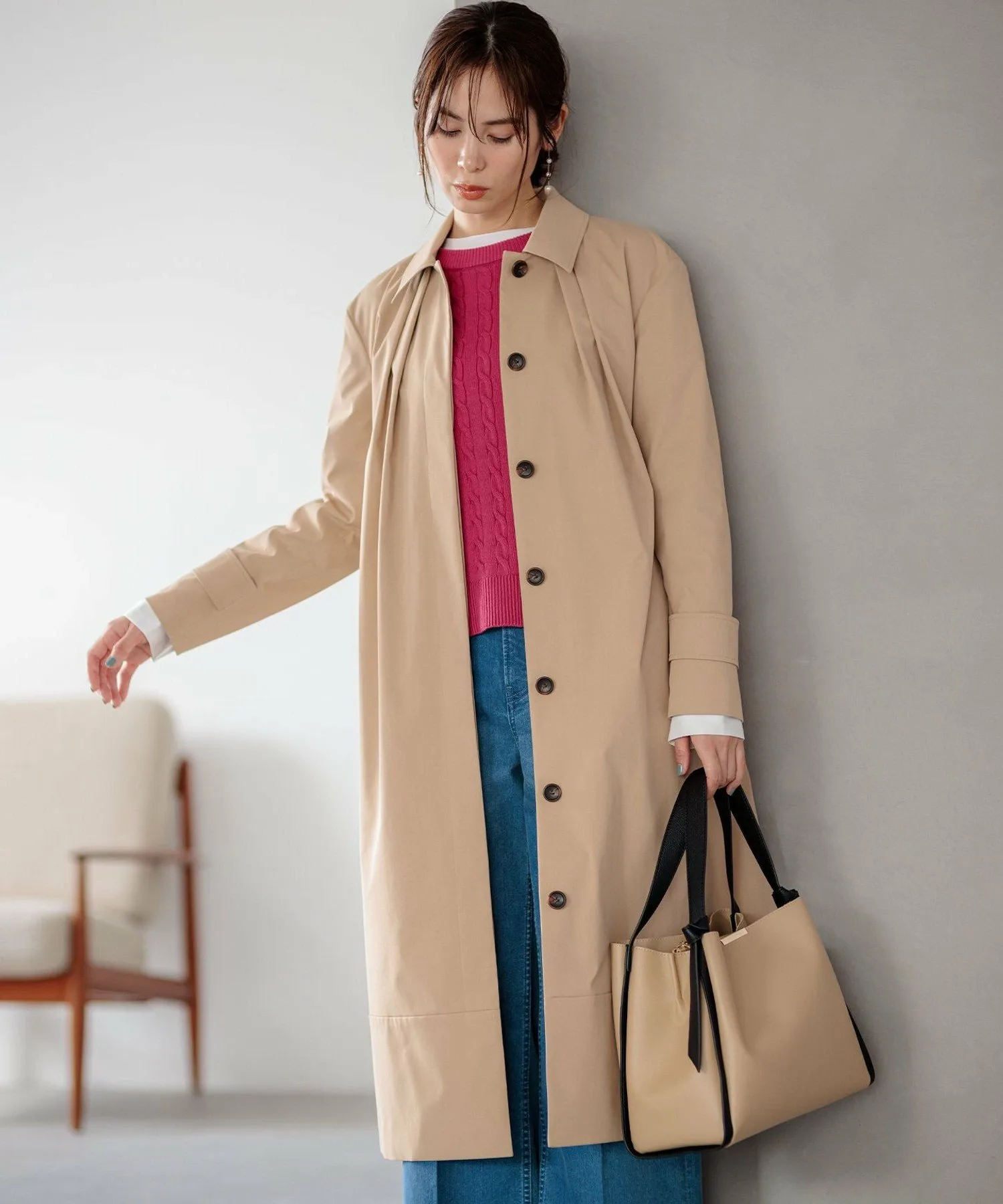 Дизайн: Современная интерпретация классического тренча. Трехмерная форма создает А-образный силуэт, слегка отходящий от тела, а большой воротник и складки на воротнике создают привлекательный силуэт вокруг лица. Свободный крой дополнен тщательно разработанными узорами и деталями, которые избегают громоздкости, создавая изысканный и сбалансированный вид. Его удобно накинуть поверх объемной блузки. Простой дизайн подчеркивает текстуру материала, создавая идеальный баланс между повседневным и нарядным стилем. Он отлично смотрится с расстегнутым спереди для повседневного образа или застегнутым на пуговицы и в сочетании с ботинками для более нарядного образа.