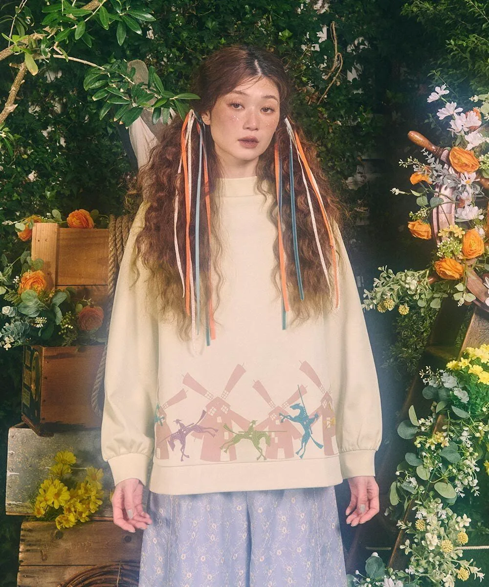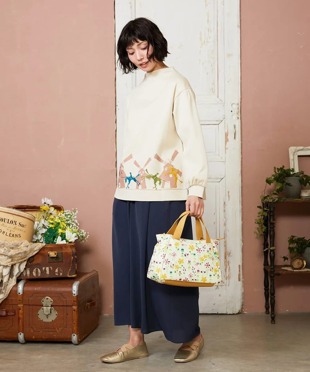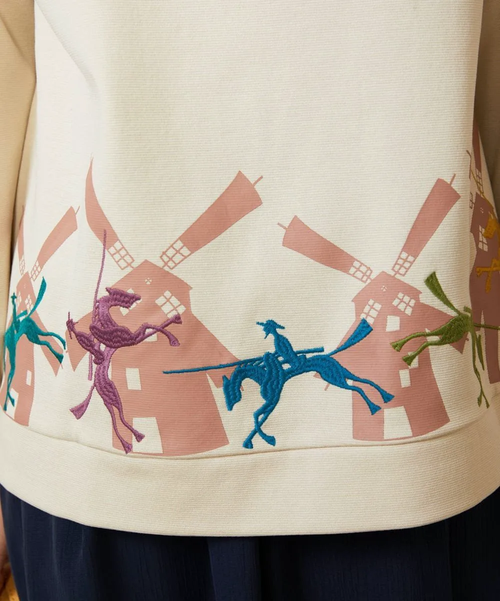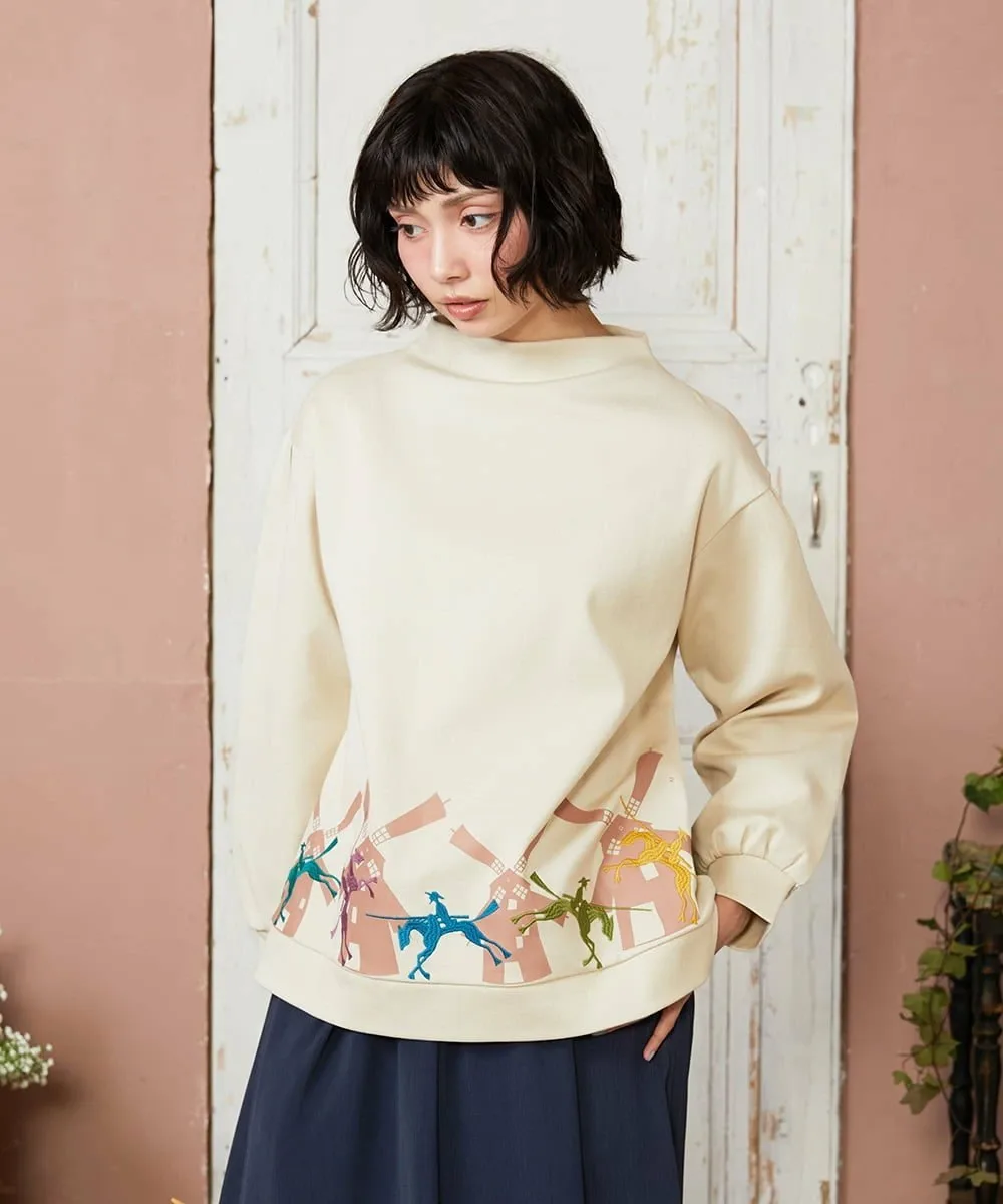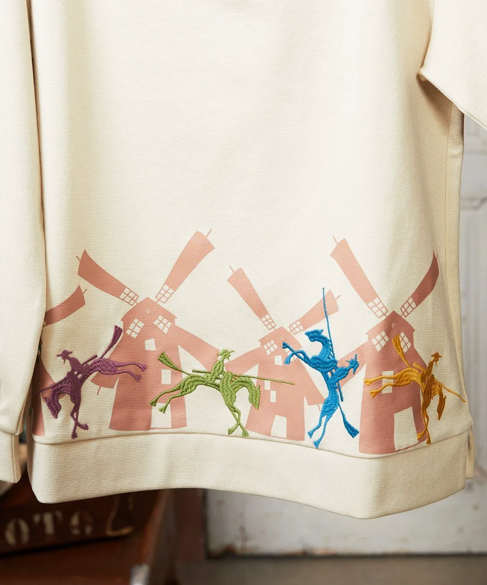 Этот сшитый пуловер отличается вниманием к деталям. Воротник-стойка и расклешенный силуэт подчеркивают его солидный и милый вид. Нижний край украшен принтом в виде ветряных мельниц и вышитыми лошадьми, воссоздающими сцену из истории Дон Кихота. Эта сшитая вещь станет ярким акцентом в вашем гардеробе и идеально подойдет для повседневной носки.