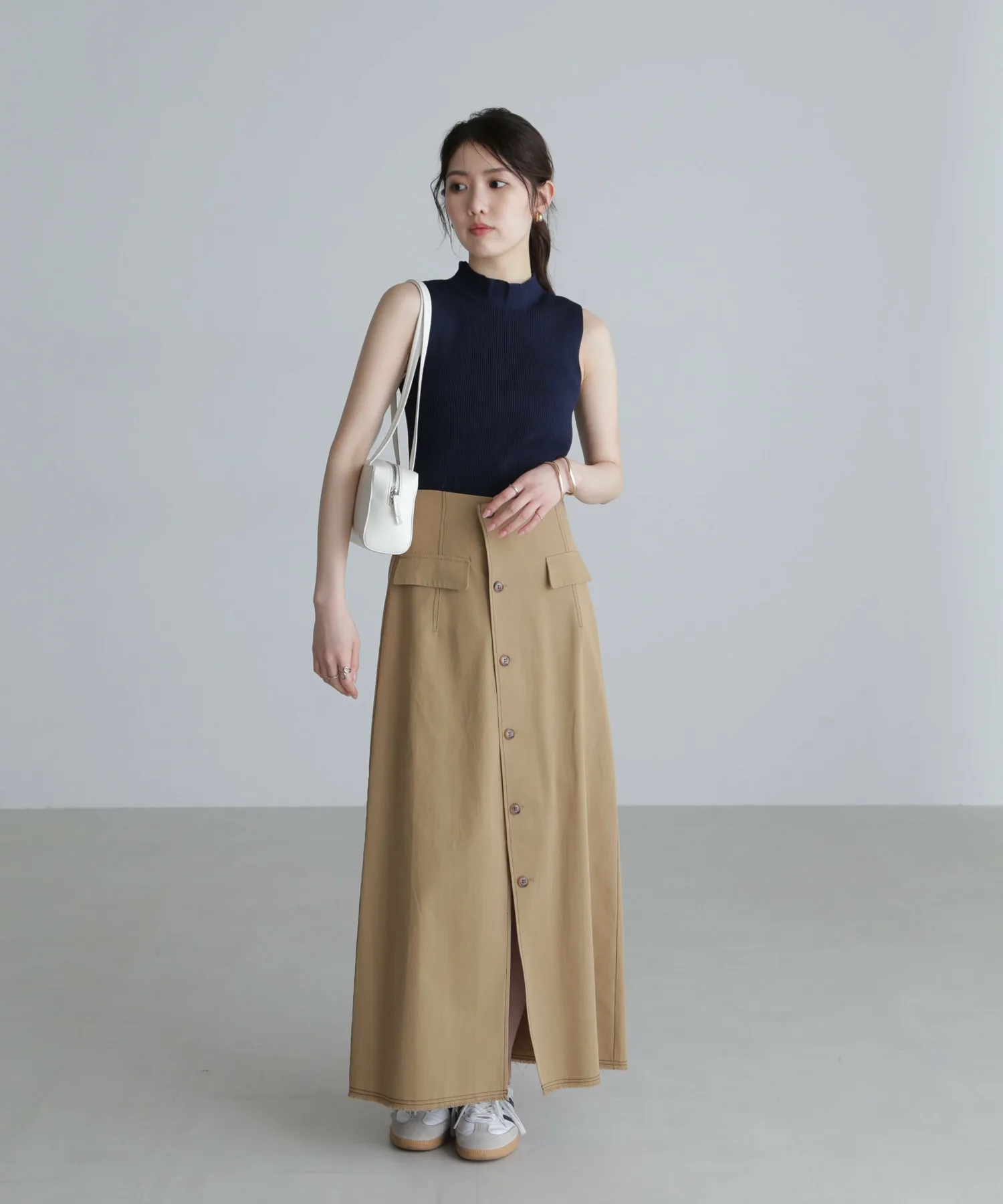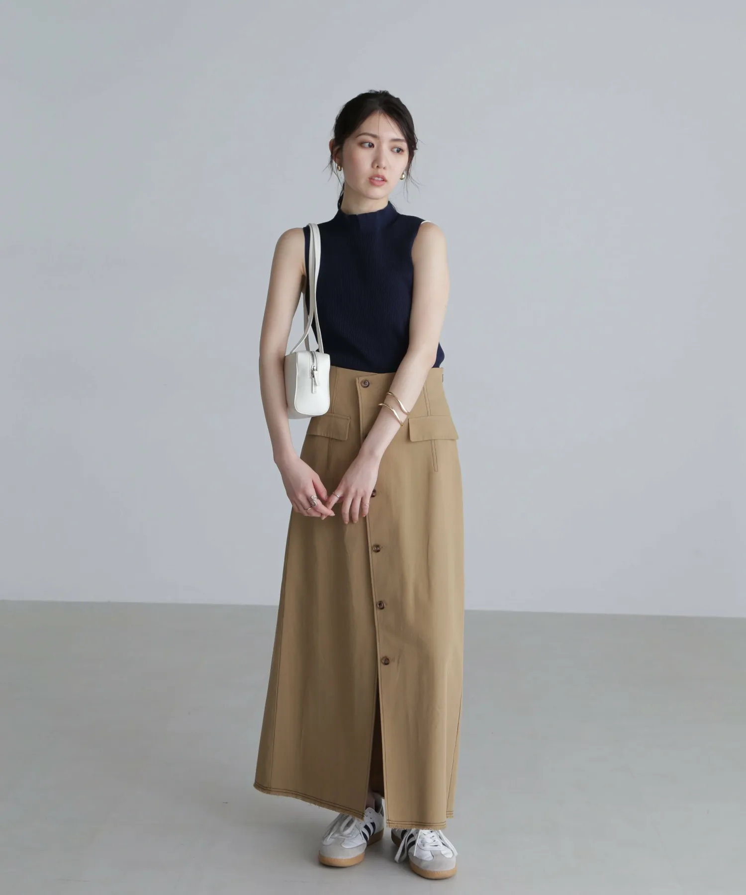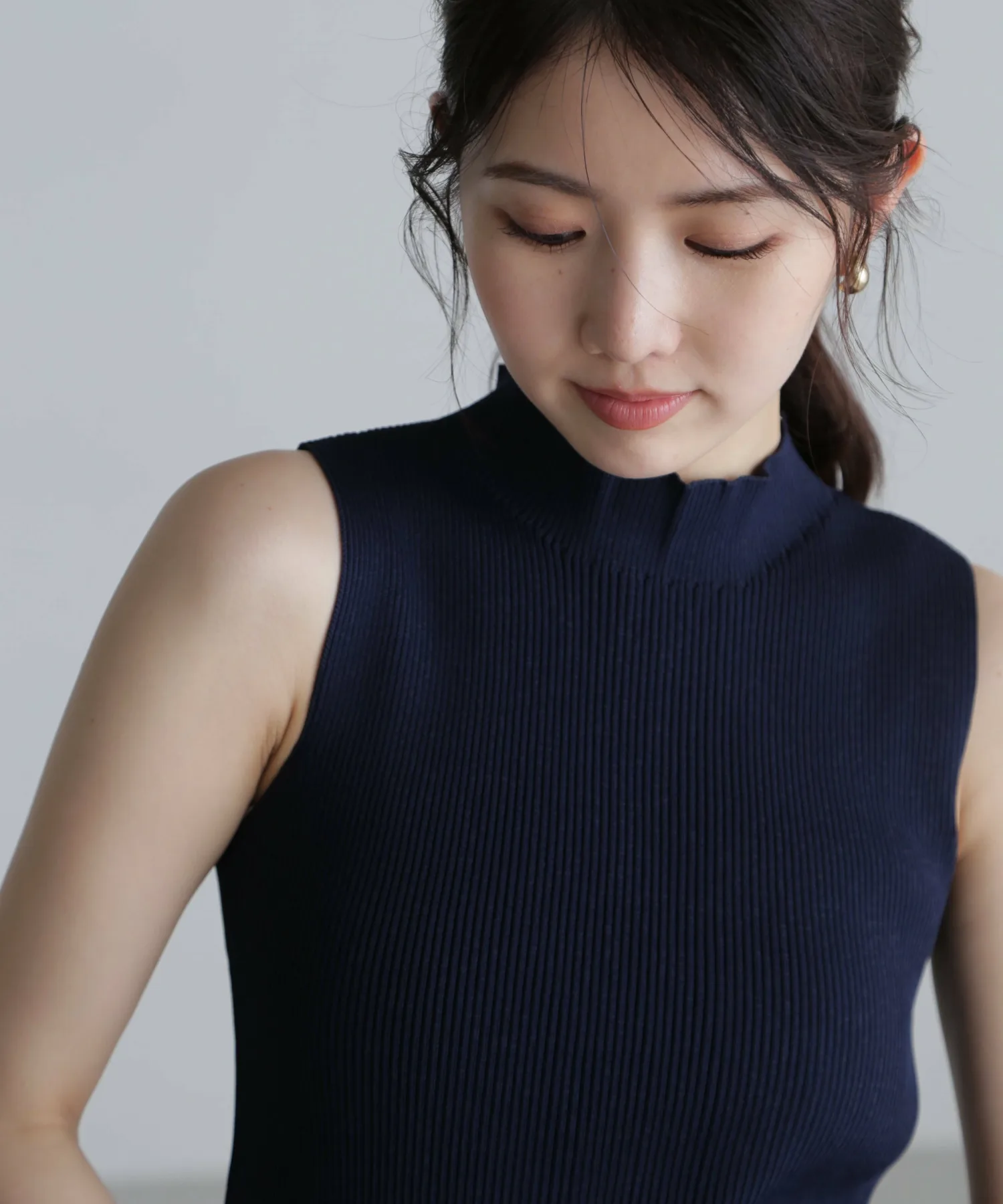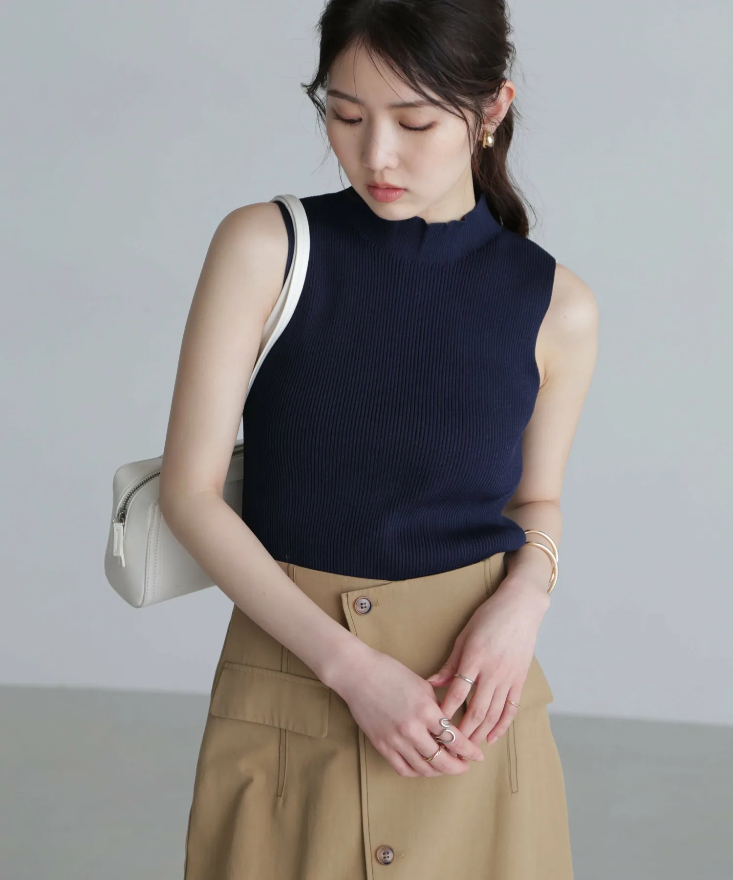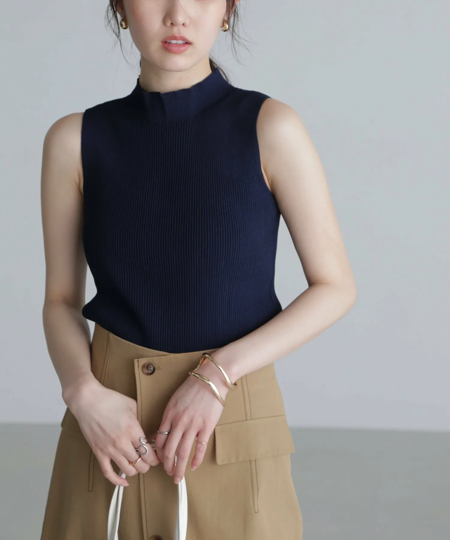 [Ткань и дизайн] Трикотажная серия, пригодная для машинной стирки. Изготовлена из нейлоновых и вискозных нитей с сухим на ощупь покрытием, трикотаж аккуратный и ровный, создавая красивую текстуру. Ребристая ткань также обеспечивает отличную эластичность. Сплошное вязаное горлышко придает изделию аккуратный вид, а отсутствие швов вокруг шеи делает его удобным в ношении без раздражения. Плечи слегка заужены, оставляя большую площадь открытых плеч, что предотвращает слишком взрослый вид. Не слишком прозрачная, поэтому ее можно носить как самостоятельно, так и в качестве нижнего слоя или в многослойной одежде. ★При стирке используйте деликатный режим и поместите изделие в сетку для белья. Мы узнаем, можно ли стирать в машине два цвета #011 Черный люрекс и #021 Серый люрекс после Китайского Нового года.