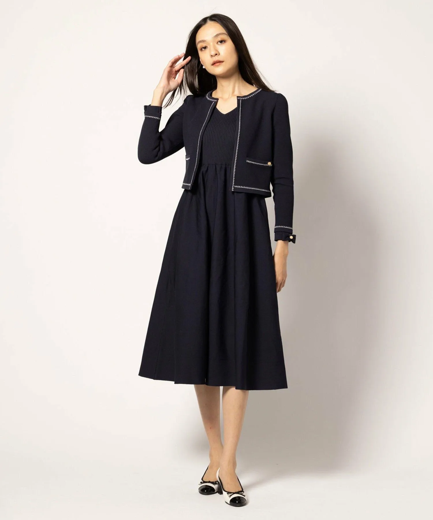 Сочетайте его с трикотажным жакетом из того же материала для комплекта, который рекомендуется для более формальных случаев.