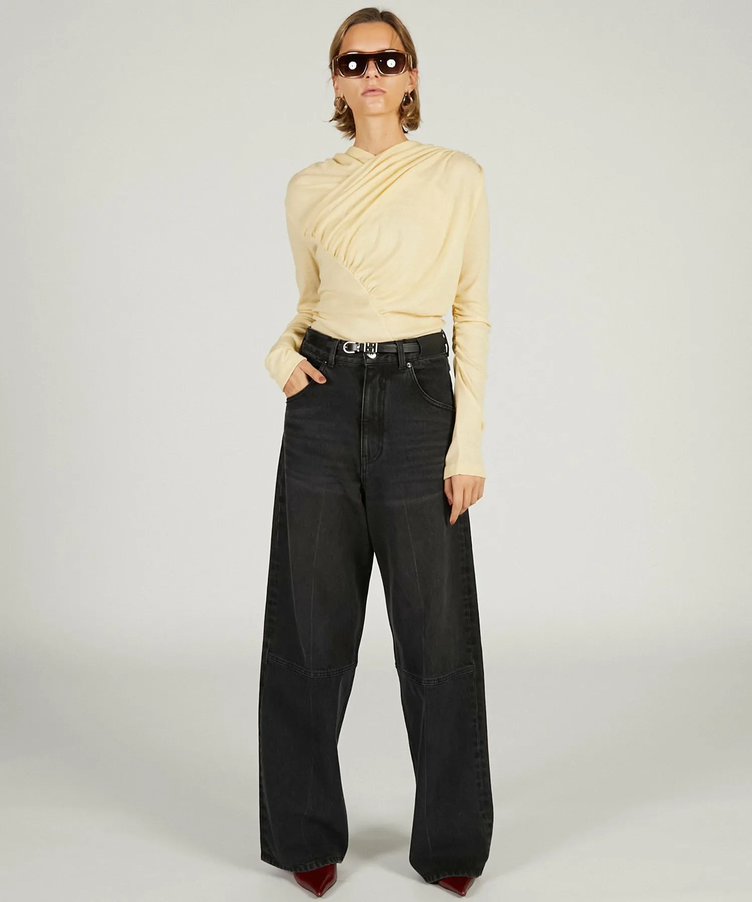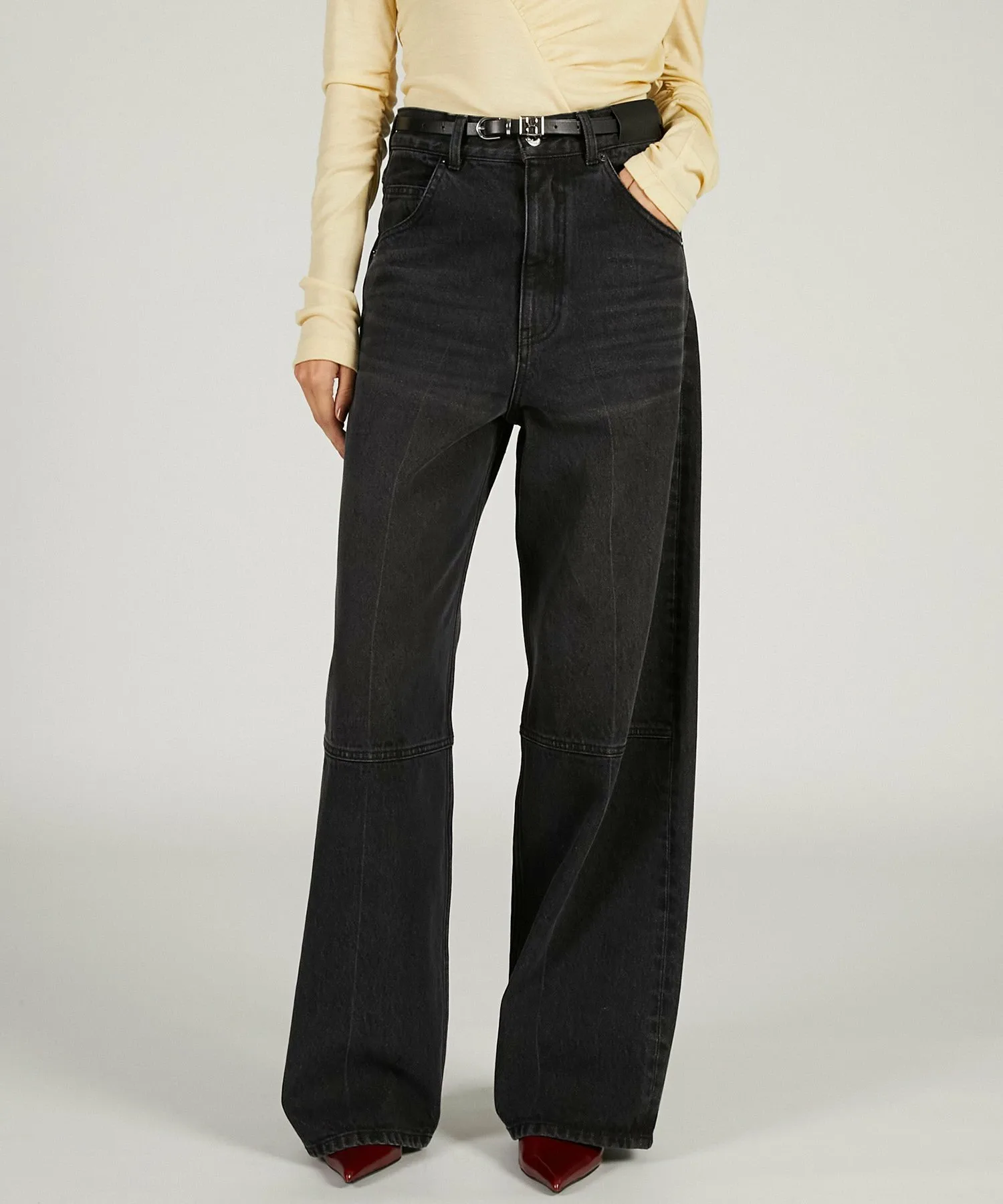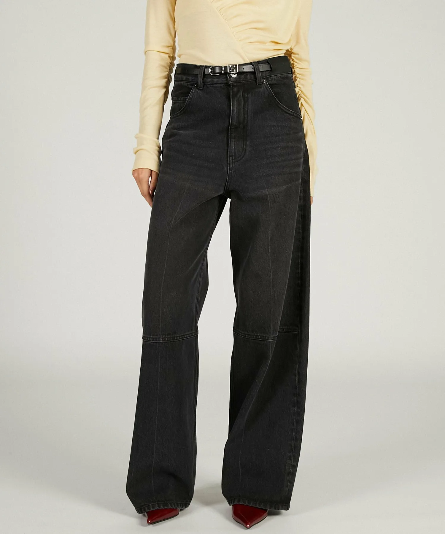 Джинсы прямого силуэта с высокой посадкой.