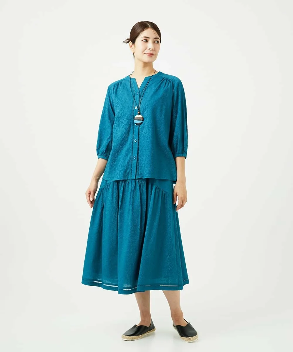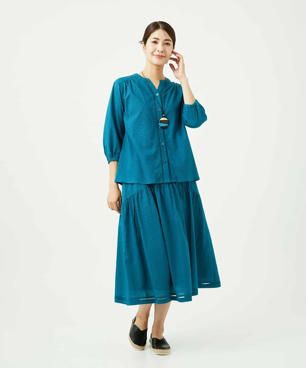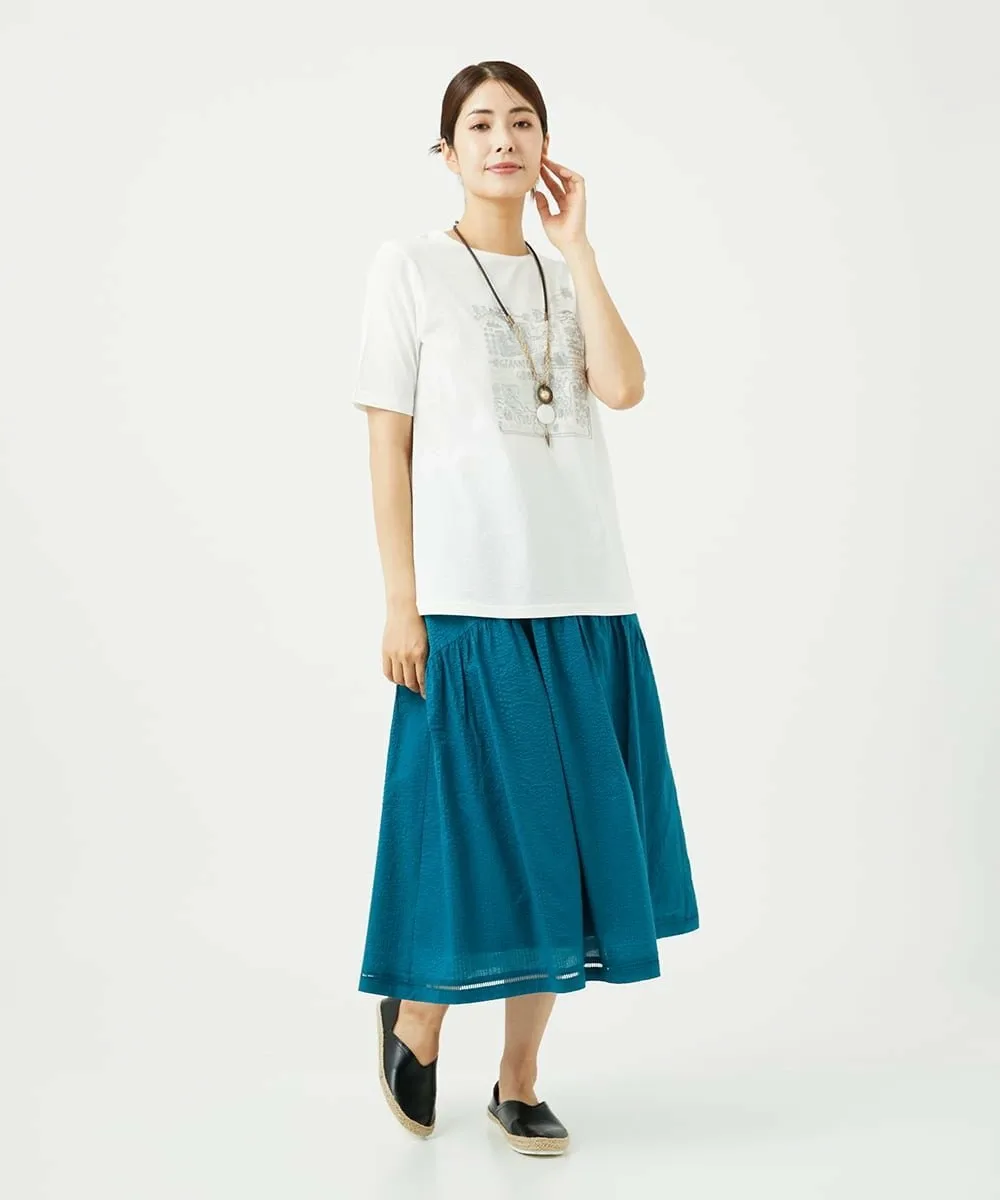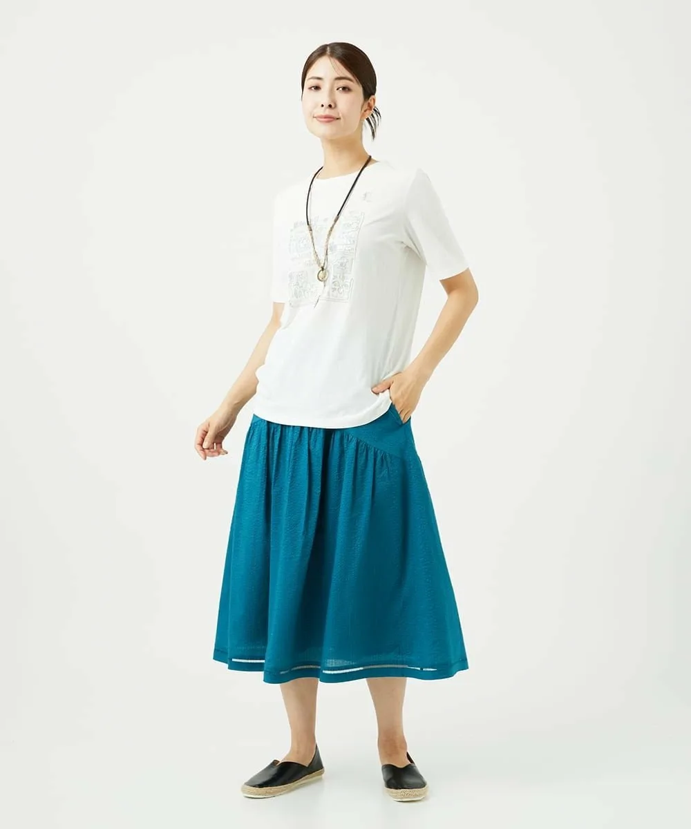 Даже в сочетании с простым топом она создает освежающий, элегантный и изысканный образ. Мы также рекомендуем сочетать его с блузкой для более элегантного образа. У нас также есть блузка с застежкой спереди [NGBJB01330] и платье-туника [NGEJB01360], изготовленные из того же материала. Эту юбку можно носить как комплект.