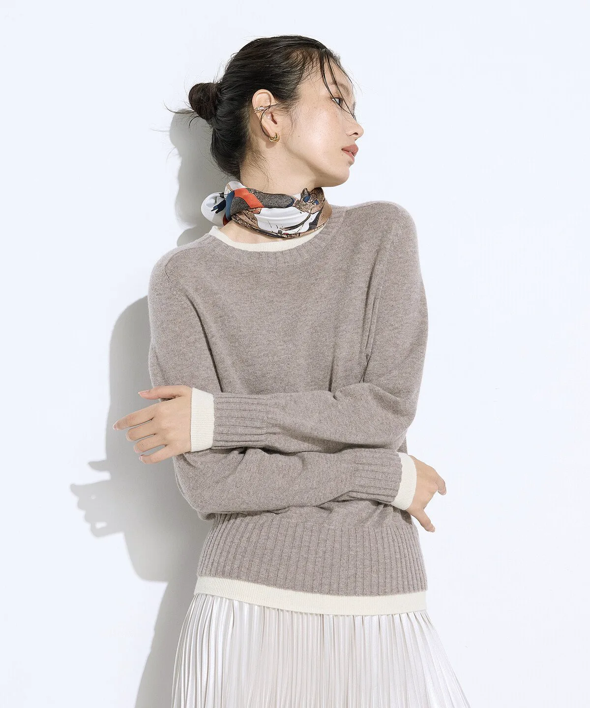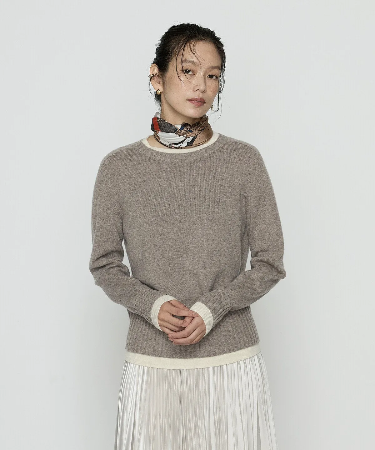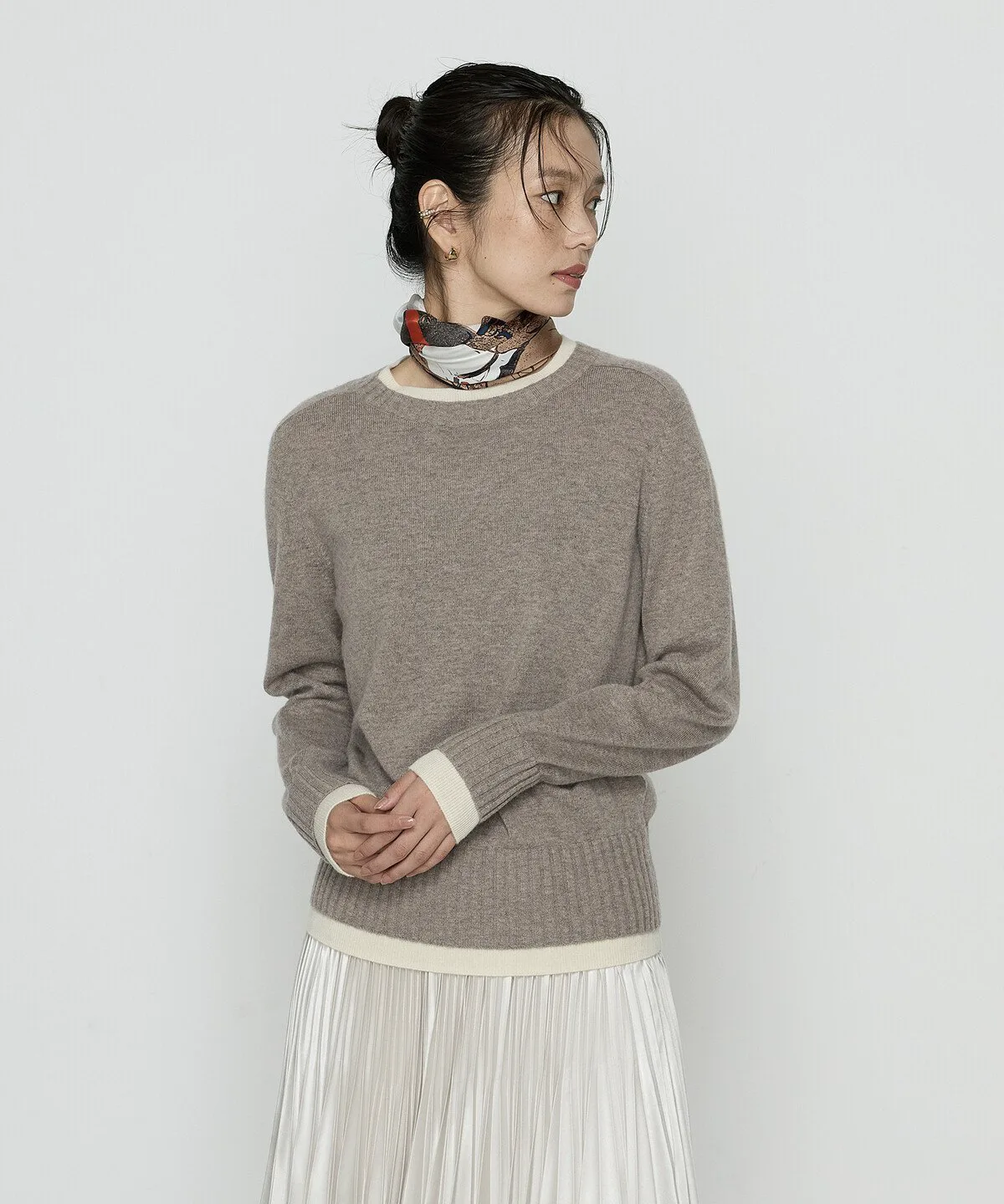 Воротник, манжеты и нижний край выполнены в двойной ребристой вязке в своей цветовой гамме, в то время как основная часть пуловера однослойная, поэтому его можно носить под пальто, не создавая ощущения громоздкости.