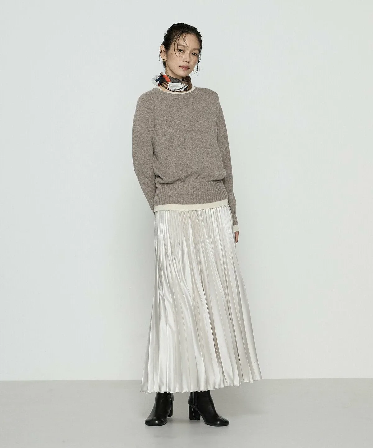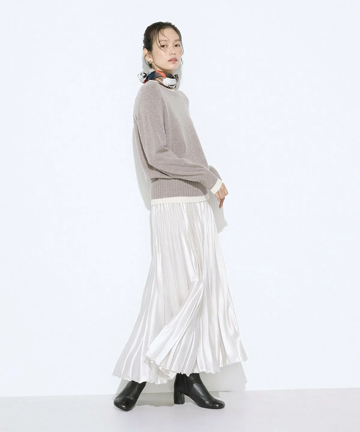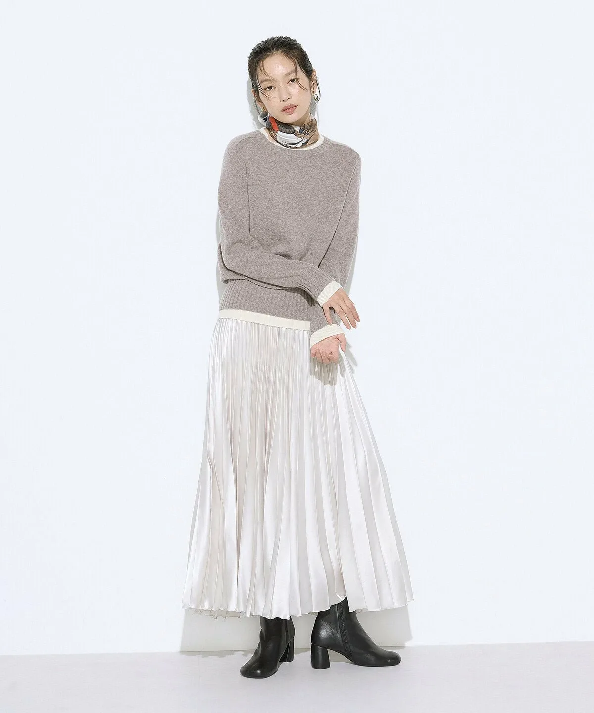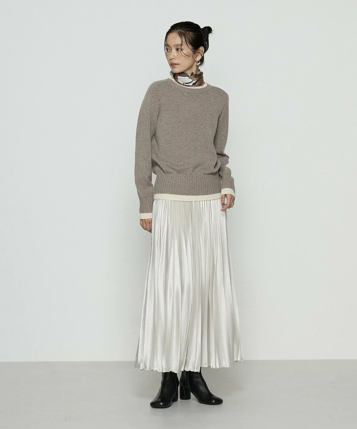 Воротник, манжеты и нижний край выполнены в двойной ребристой вязке в своей цветовой гамме, в то время как основная часть пуловера однослойная, поэтому его можно носить под пальто, не создавая ощущения громоздкости.