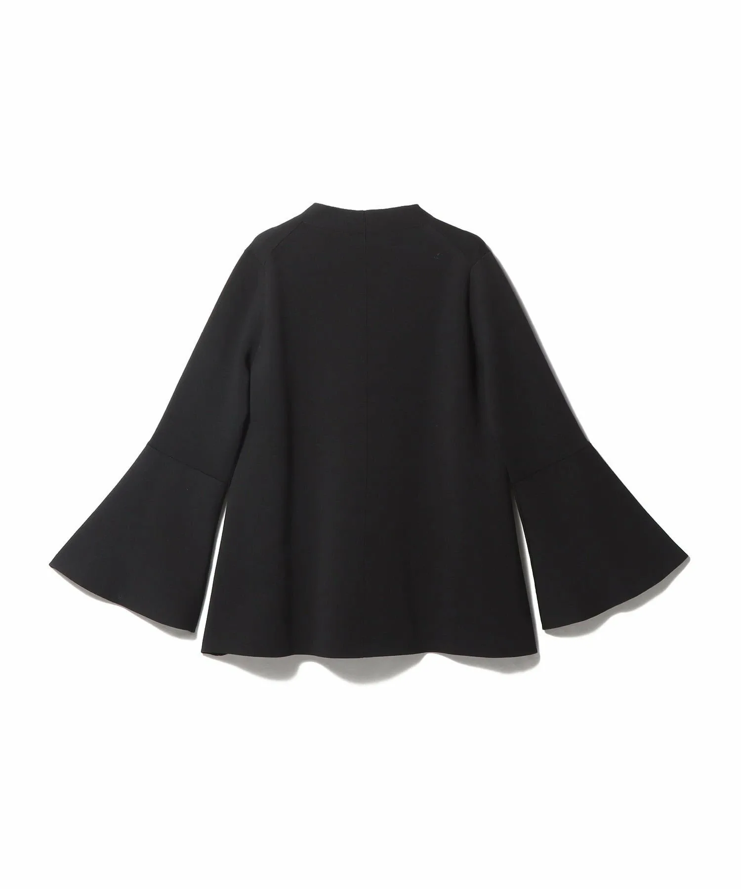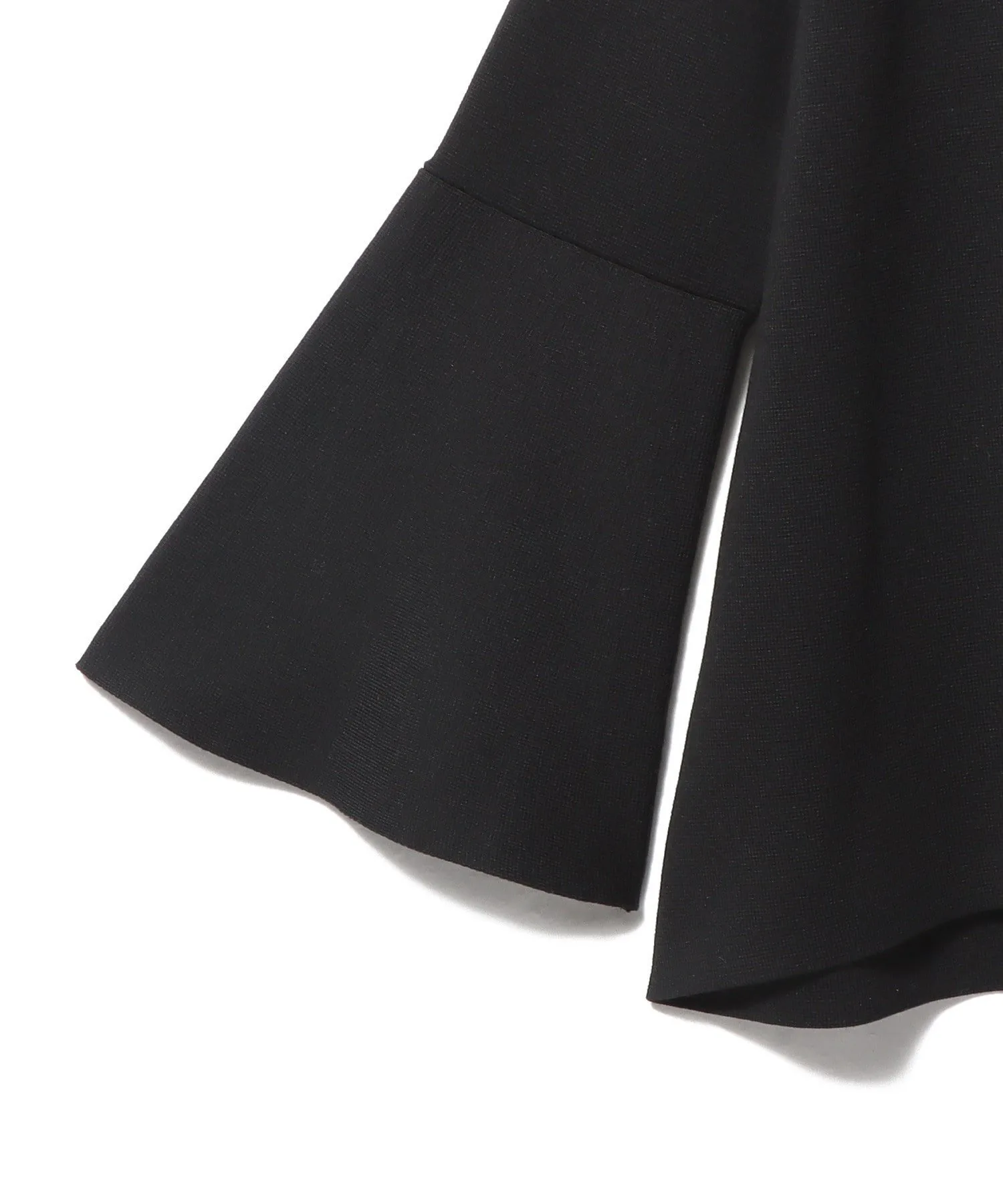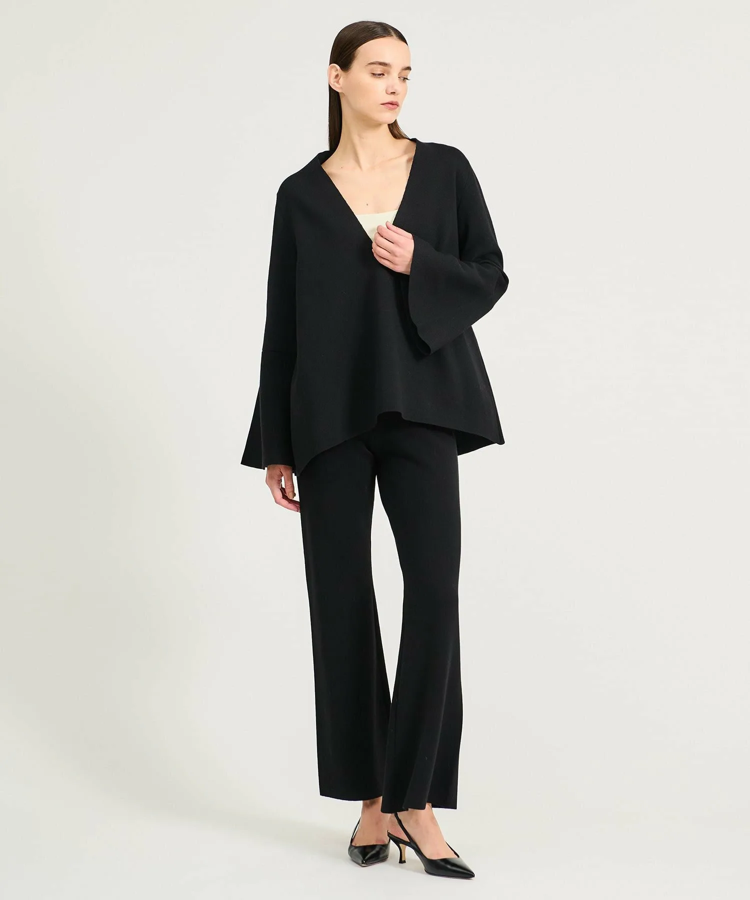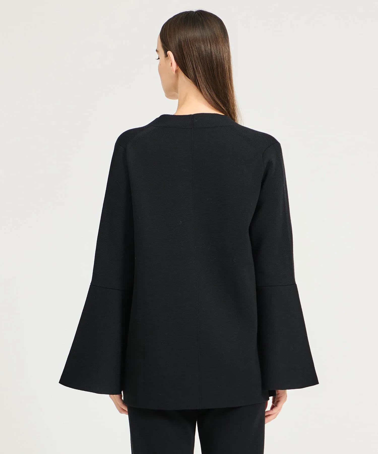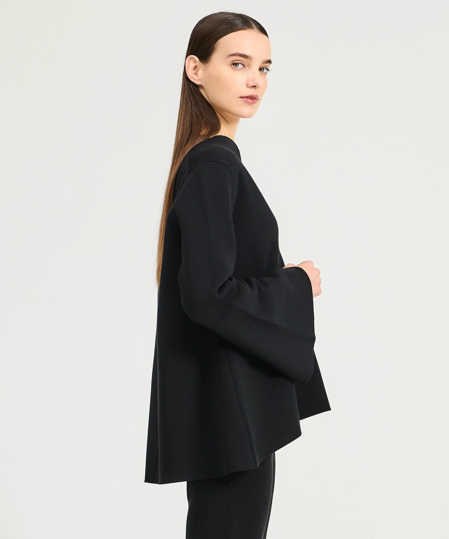 Тепло шерсти в сочетании с характерной драпировкой ацетата создает четкий и элегантный образ. Расклешенный силуэт в сочетании с глубоким V-образным вырезом и расклешенными рукавами придает ему привлекательный, динамичный вид.