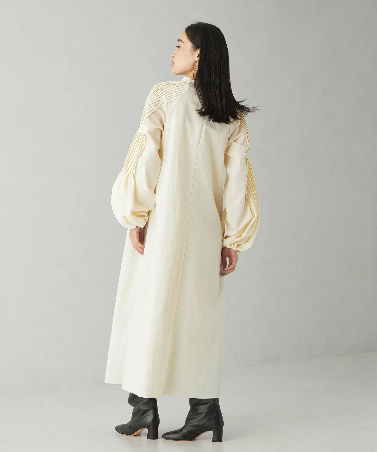 Платье с роскошными складками на рукавах и объемным силуэтом.