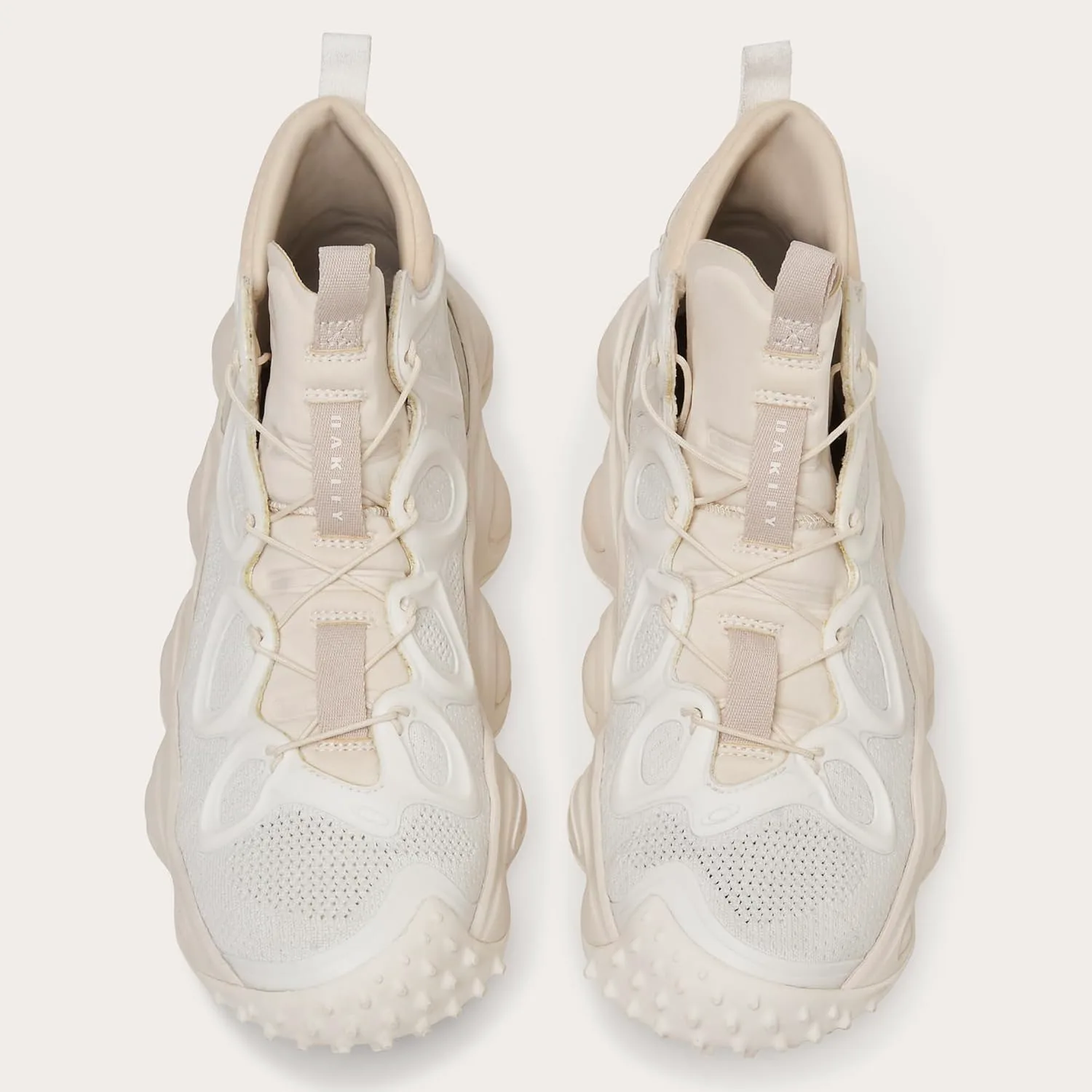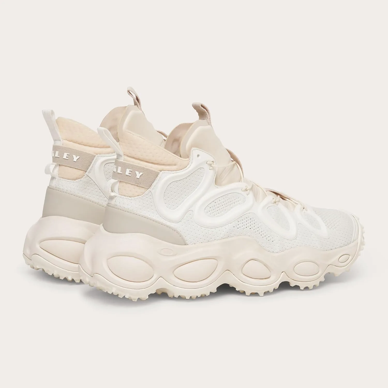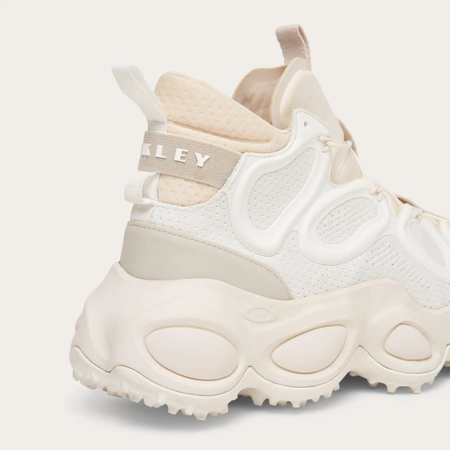 Верх из структурного тяжелого жаккардового трикотажа Мягкий и тисненый язычок из лайкры Многопрофильные протекторные элементы на средней подошве для улучшенного сцепления, внешнего вида и ощущения Сварной логотип Oakley Bark на ремешке пятки и на язычке Стелька из переработанных материалов Bloom для повышения комфорта