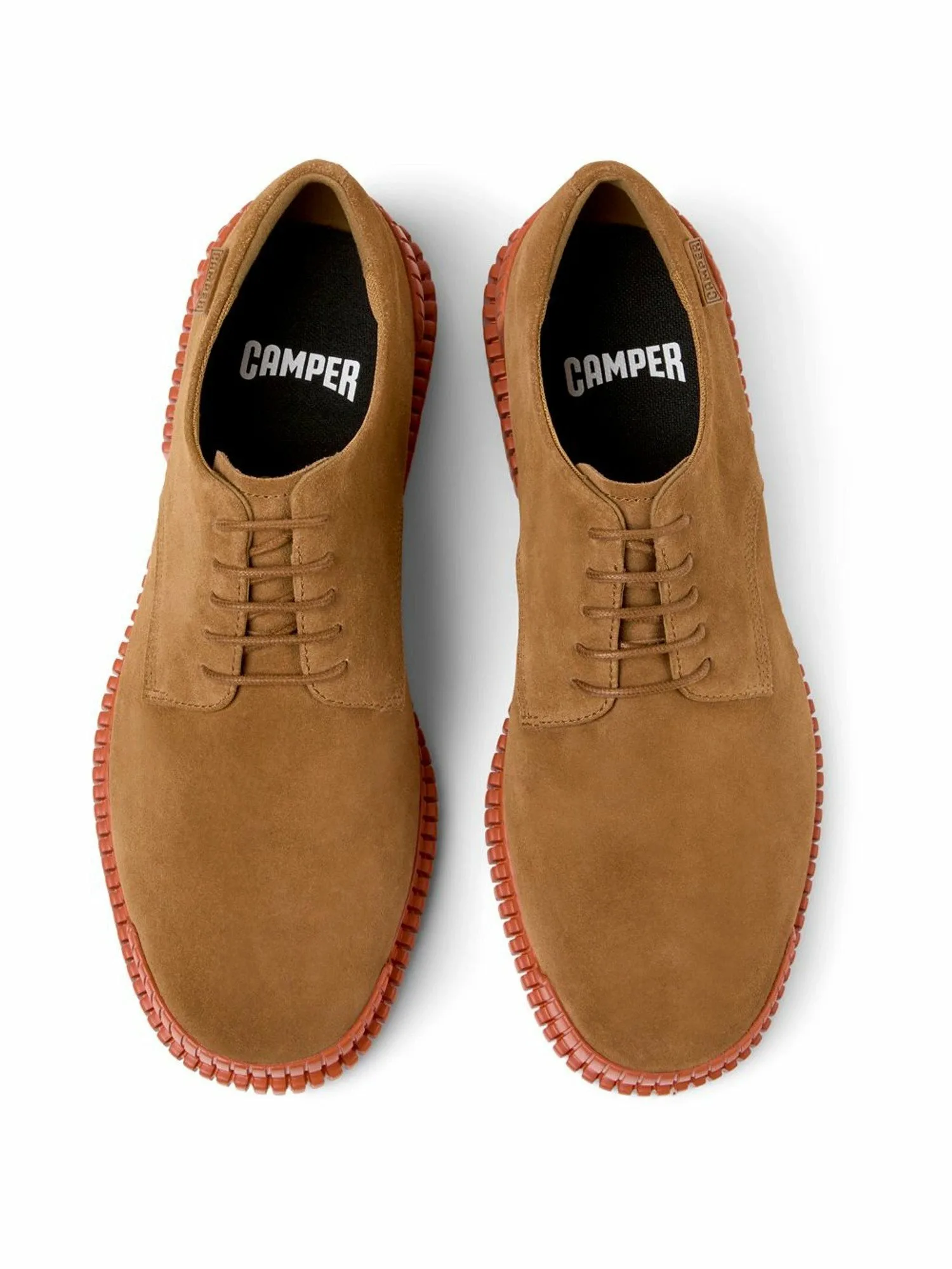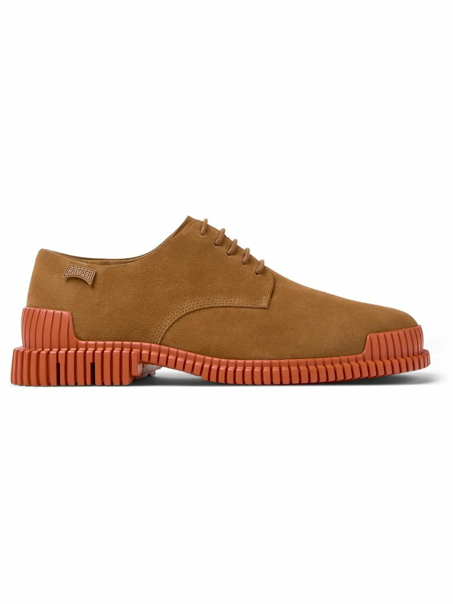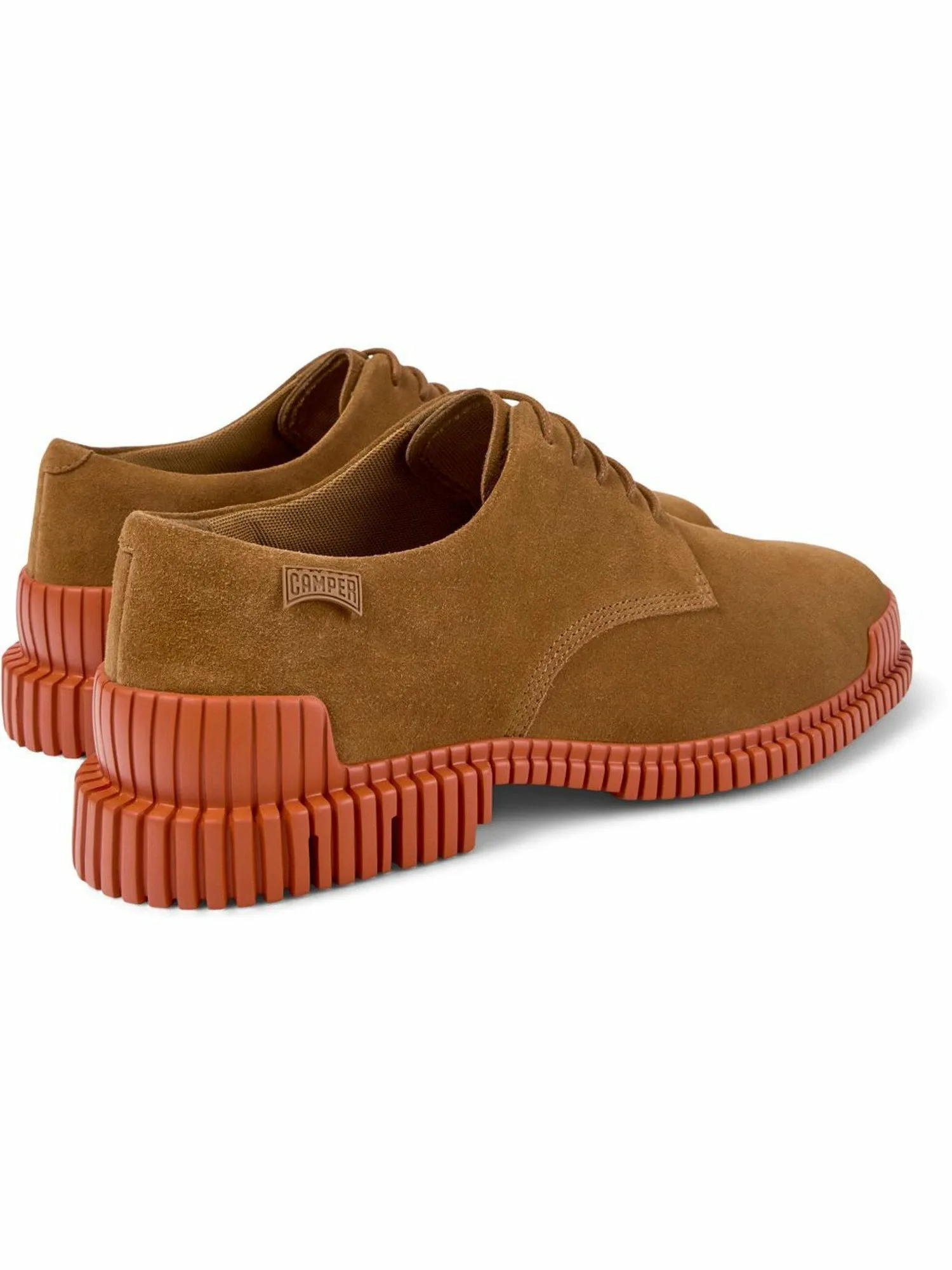 В этом сезоне мы добавили повседневные и игривые туфли-дерби из замши с яркой оранжевой подошвой для создания контраста.