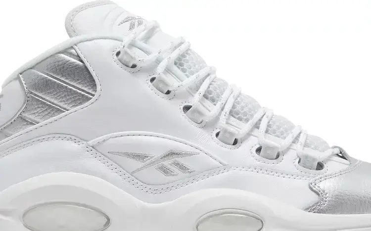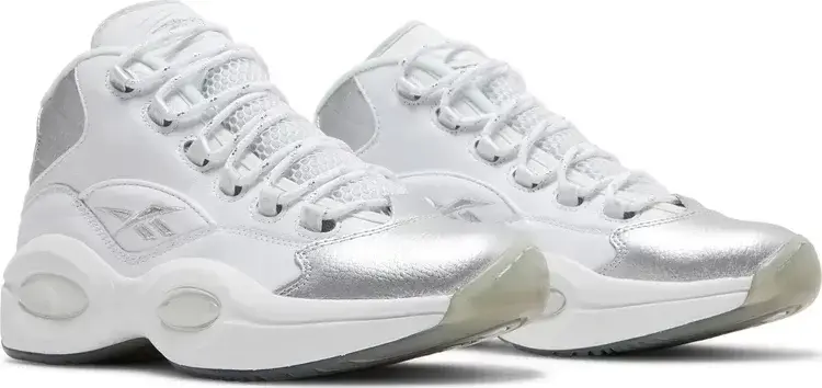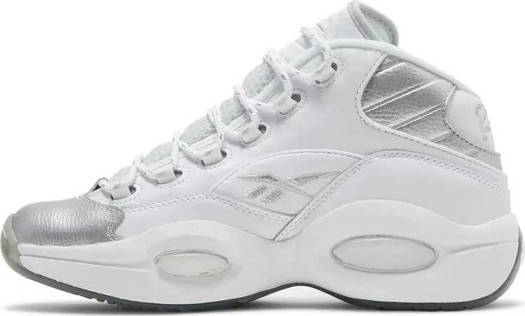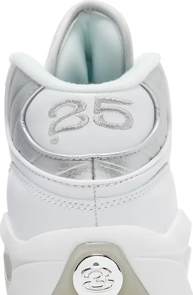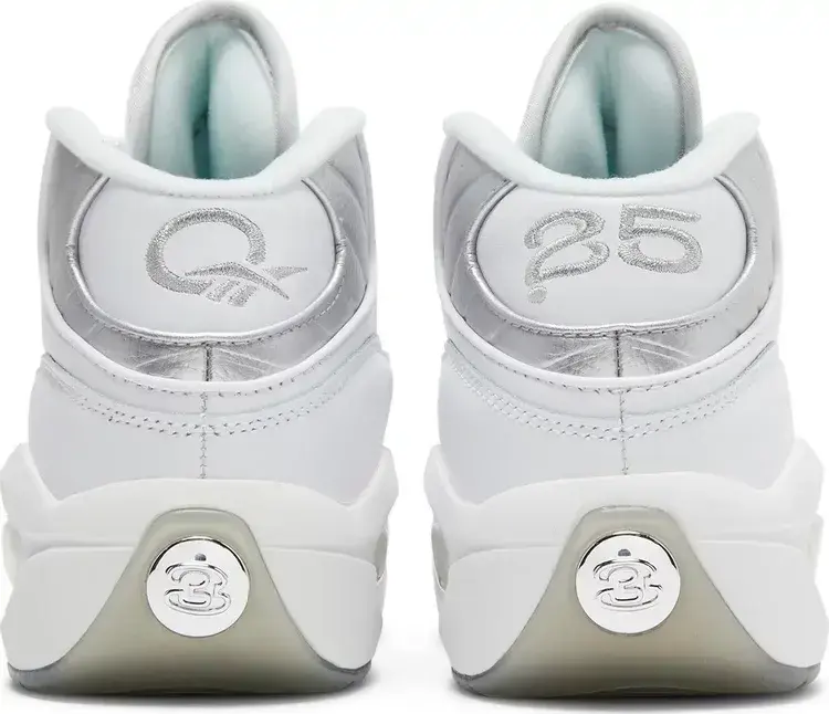 Reebok Question Mid ‘25th Anniversary’ представляет ограниченную расцветку, посвященную новичку Аллена Айверсона в сезоне НБА и дебюту его фирменной обуви. Верх средней части имеет белый кожаный верх с серебристыми металлическими вставками на мыске и воротнике. Логотип Reebok Question украшает пятку левого ботинка, а вышитая цифра «25» украшает правый. Кроссовки сидят на межподошве из EVA с видимой амортизацией Hexalite. Под ногами полупрозрачная резиновая подошва обхватывает пятку, где блестящий хромированный значок показывает номер джерси Айверсона.