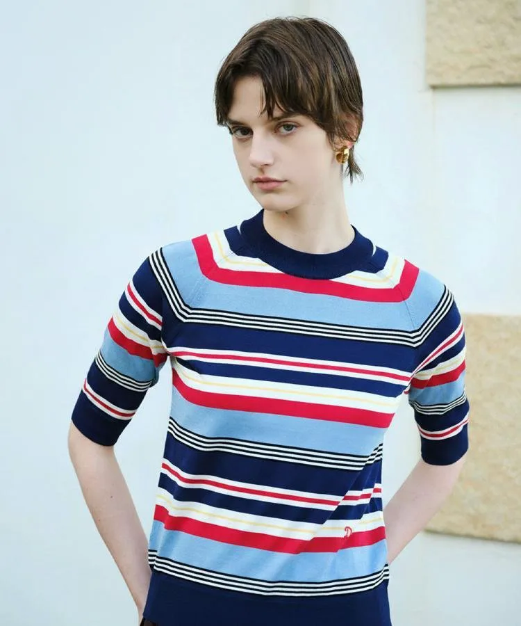В этом сезоне он представлен в трех цветах: черно-белый полосатый дизайн для повседневного образа, дизайн с многослойной каймой, сочетающий освежающий саксофон с коричневым для темного, летнего настроения, и яркий темно-синий и красный дизайн с многослойной каймой в многоцветной морской цветовой палитре.