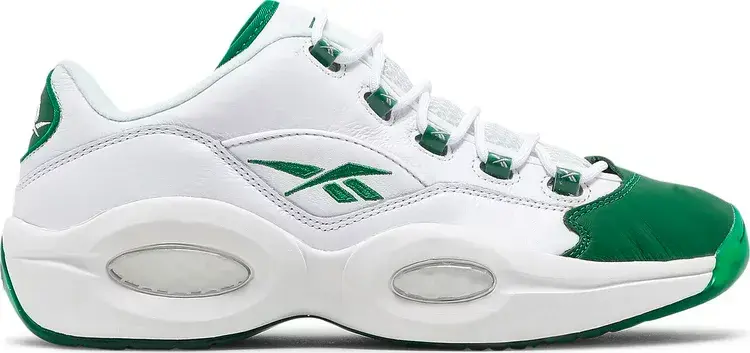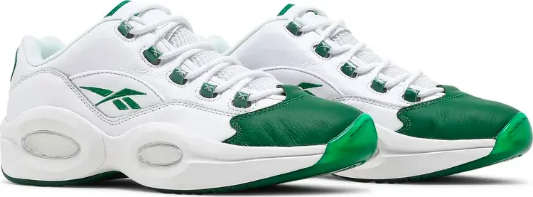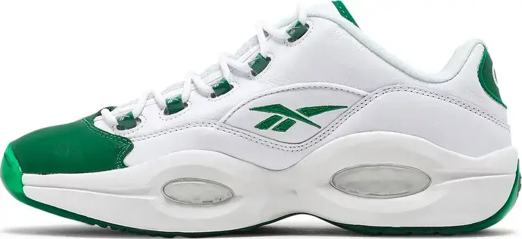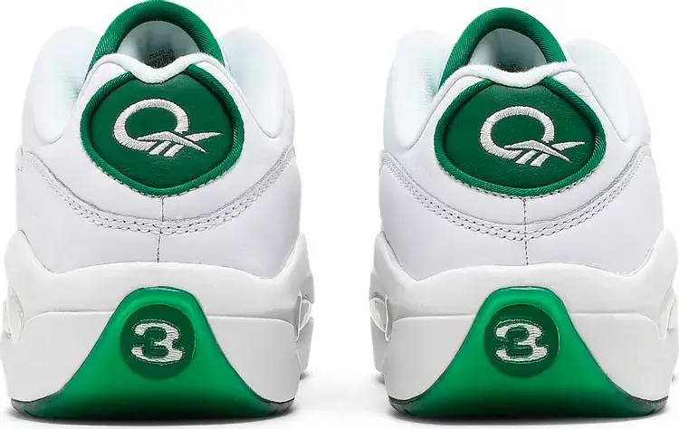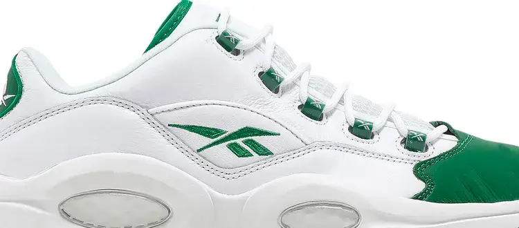 Reebok Question Low «Green Toe» возрождает простую двухцветную расцветку, первоначально выпущенную в 2006 году. Фирменная обувь Аллена Айверсона, вдохновленная легендарной франшизой «Бостон Селтикс», выполнена из белой кожи с контрастным кожаным носком цвета Glen Green. Тот же оттенок повторяется на различных фирменных хитах кроссовок, а также на армированных пластиком петлях для шнурков и полупрозрачной резиновой подошве. Низкий верх опирается на легкую промежуточную подошву из ЭВА с амортизацией Hexalite в стиле ретро в области пятки и передней части стопы.
