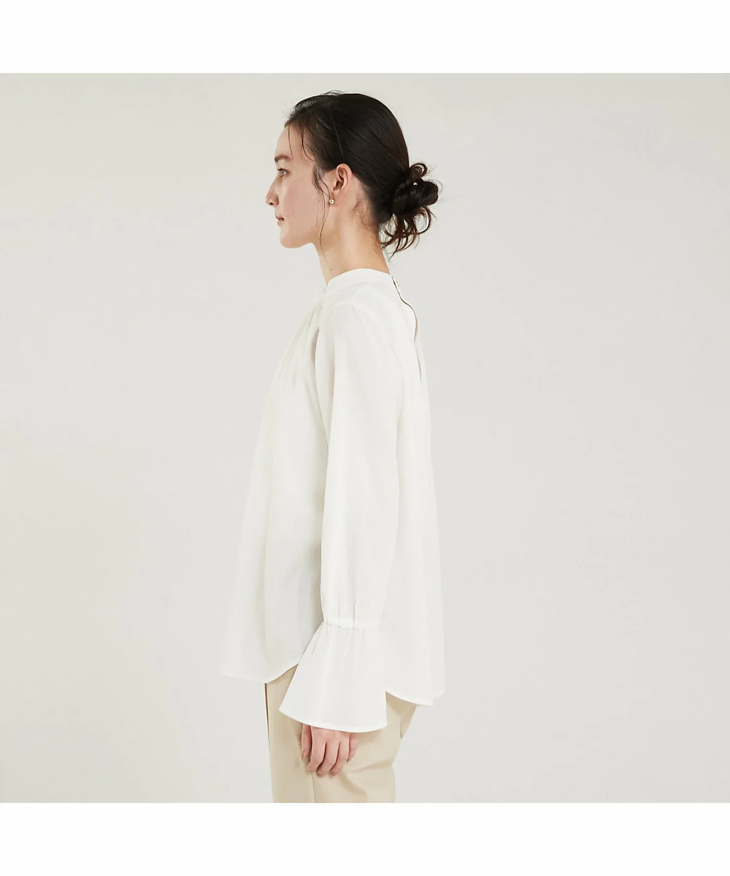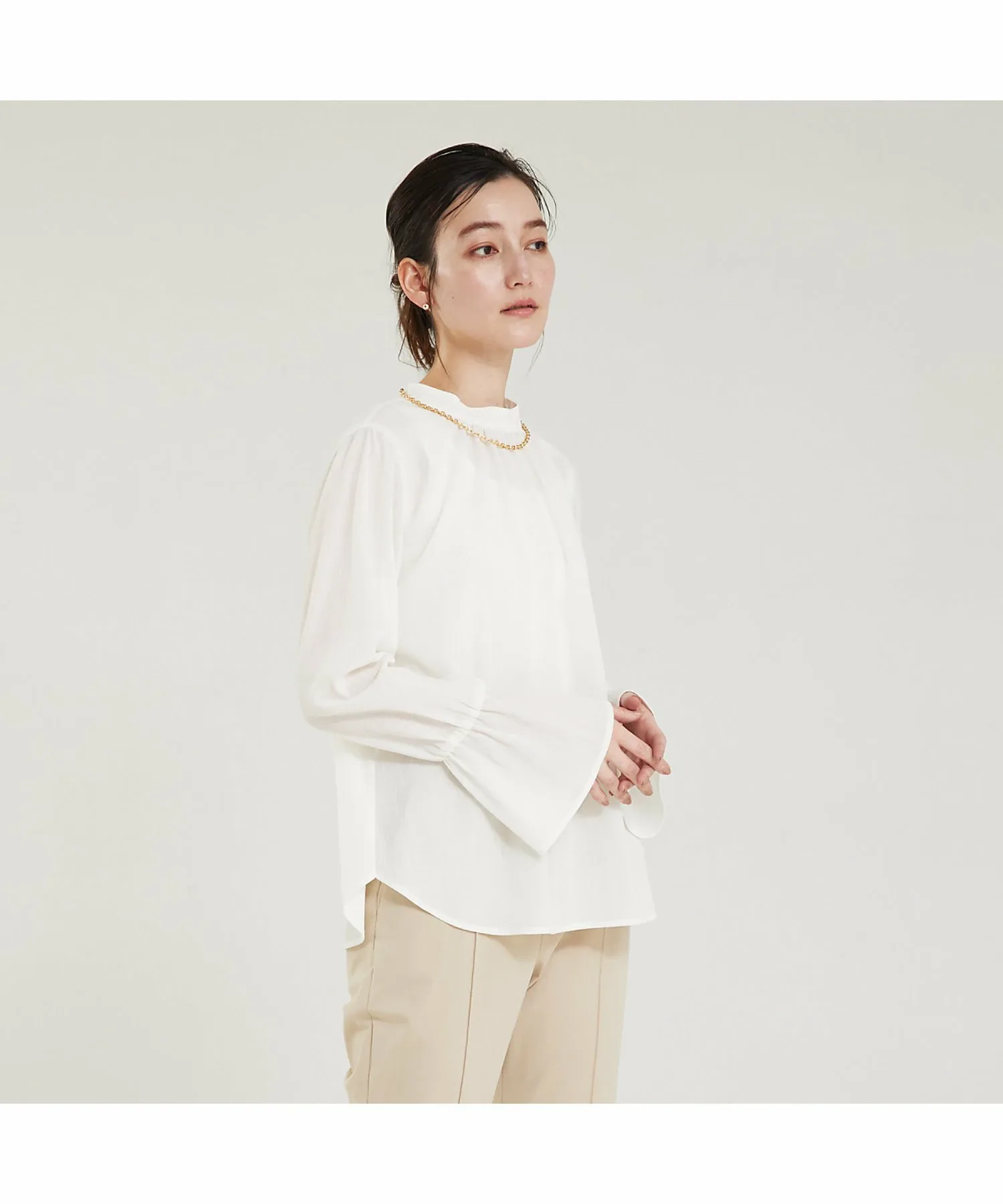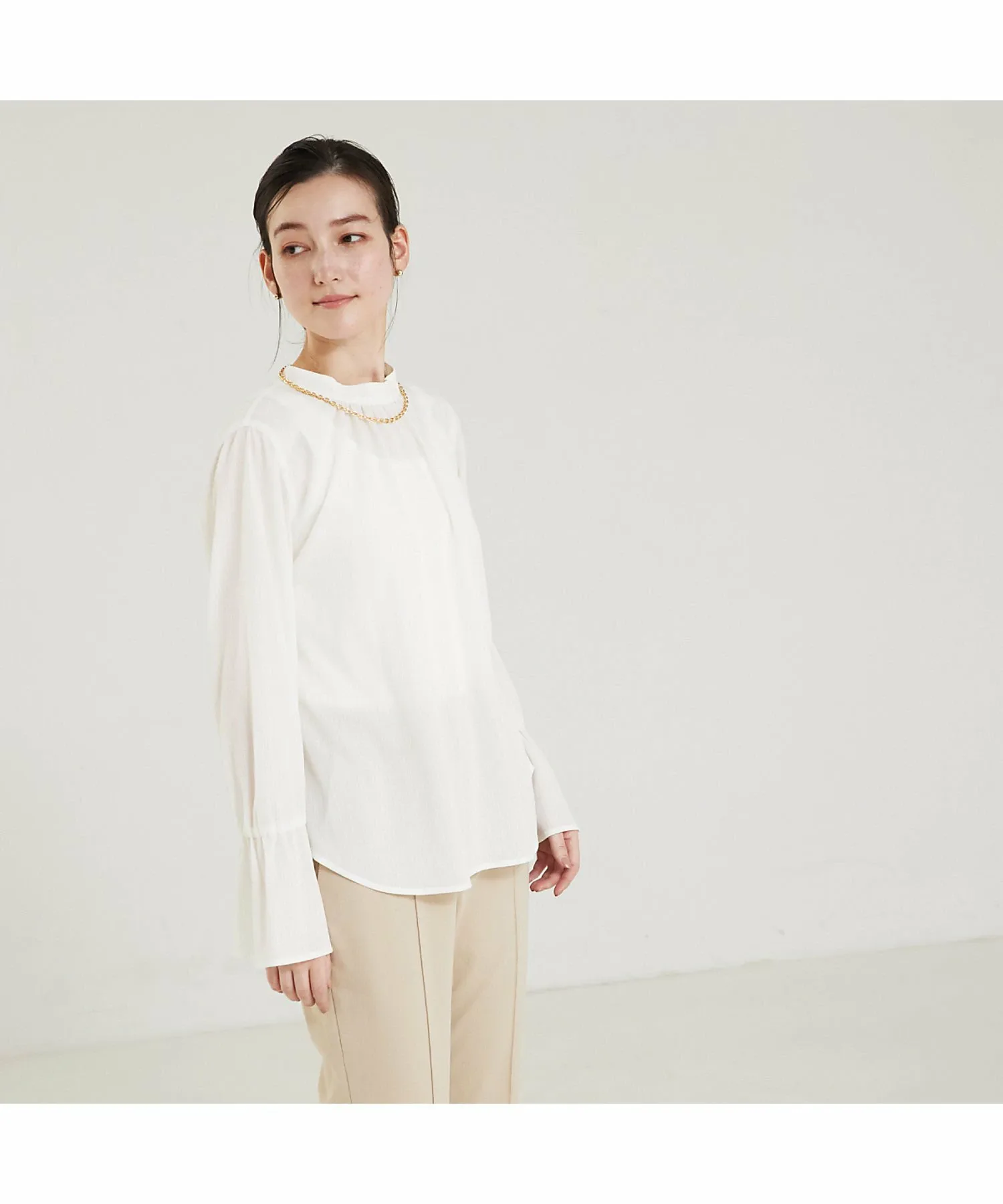 Сборки на груди и мягко расклешенные рукава-колокол создают женственный образ.