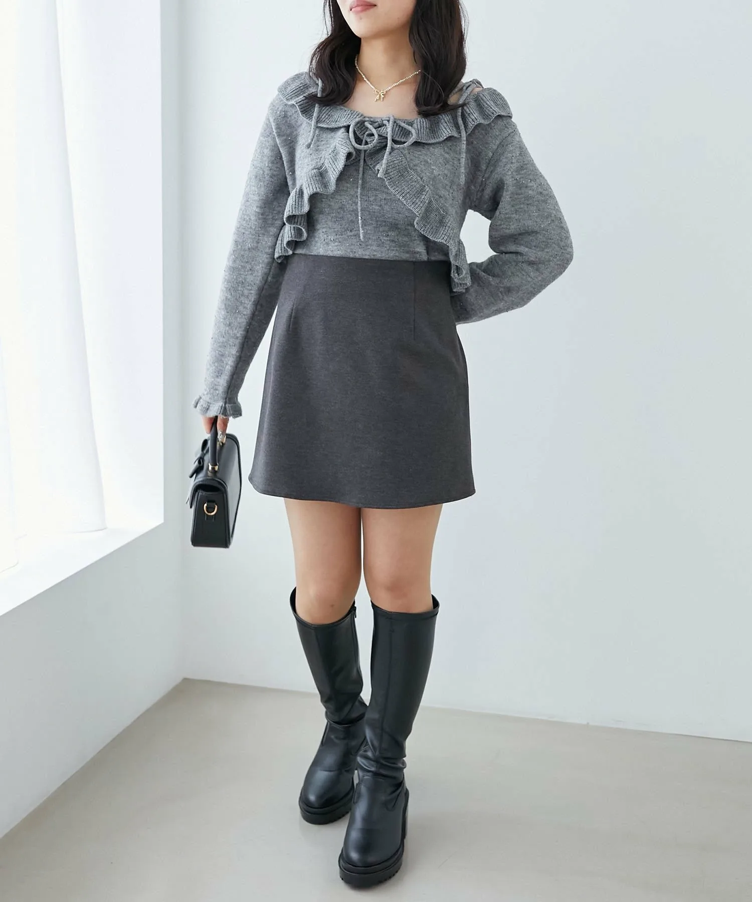 Стиль Юбка облегающая, поэтому сочетайте ее с объемным трикотажным свитером или кардиганом для милого образа! Сочетайте ее с компактным топом для сбалансированного образа. ◎ Мы рекомендуем лоферы или объемные ботинки. >