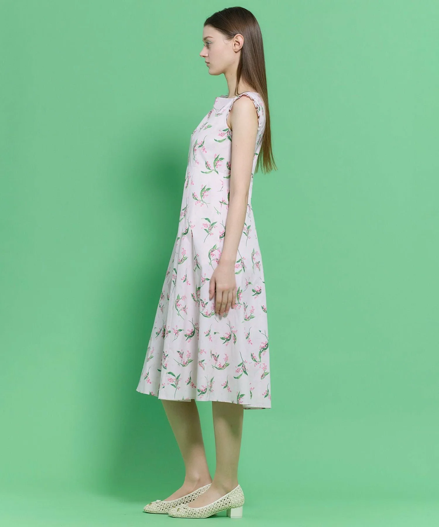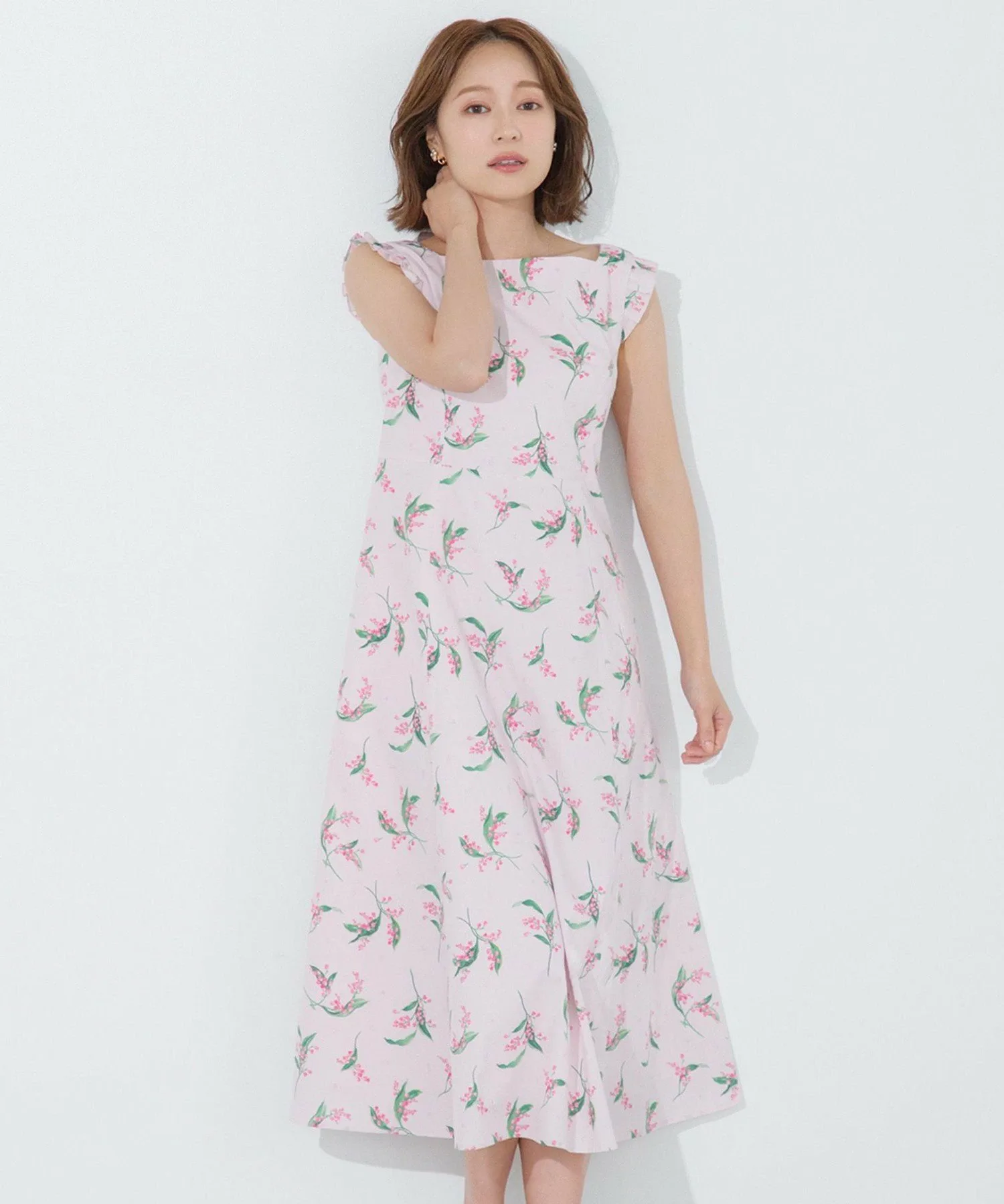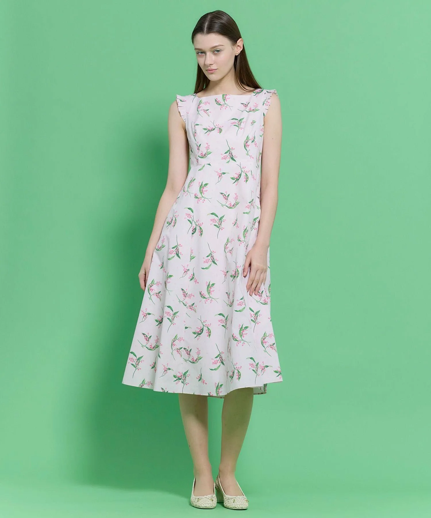 Это платье сшито из высококачественного, плотного материала, что придает ему чистый и элегантный вид. Прекрасный принт с ландышами украшает все платье, подчеркивая его элегантность и женственность. Складки на талии создают четкий силуэт и эффектный вид. Эта универсальная вещь идеально подходит для особых случаев или в сочетании с жакетом или кардиганом для повседневной носки.