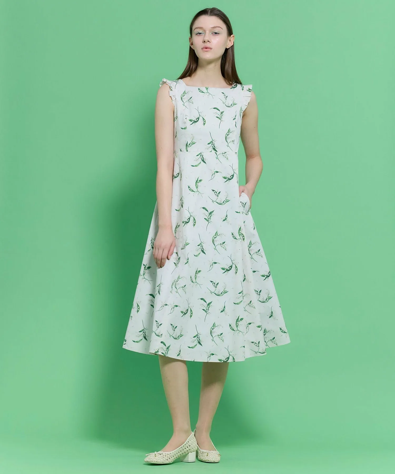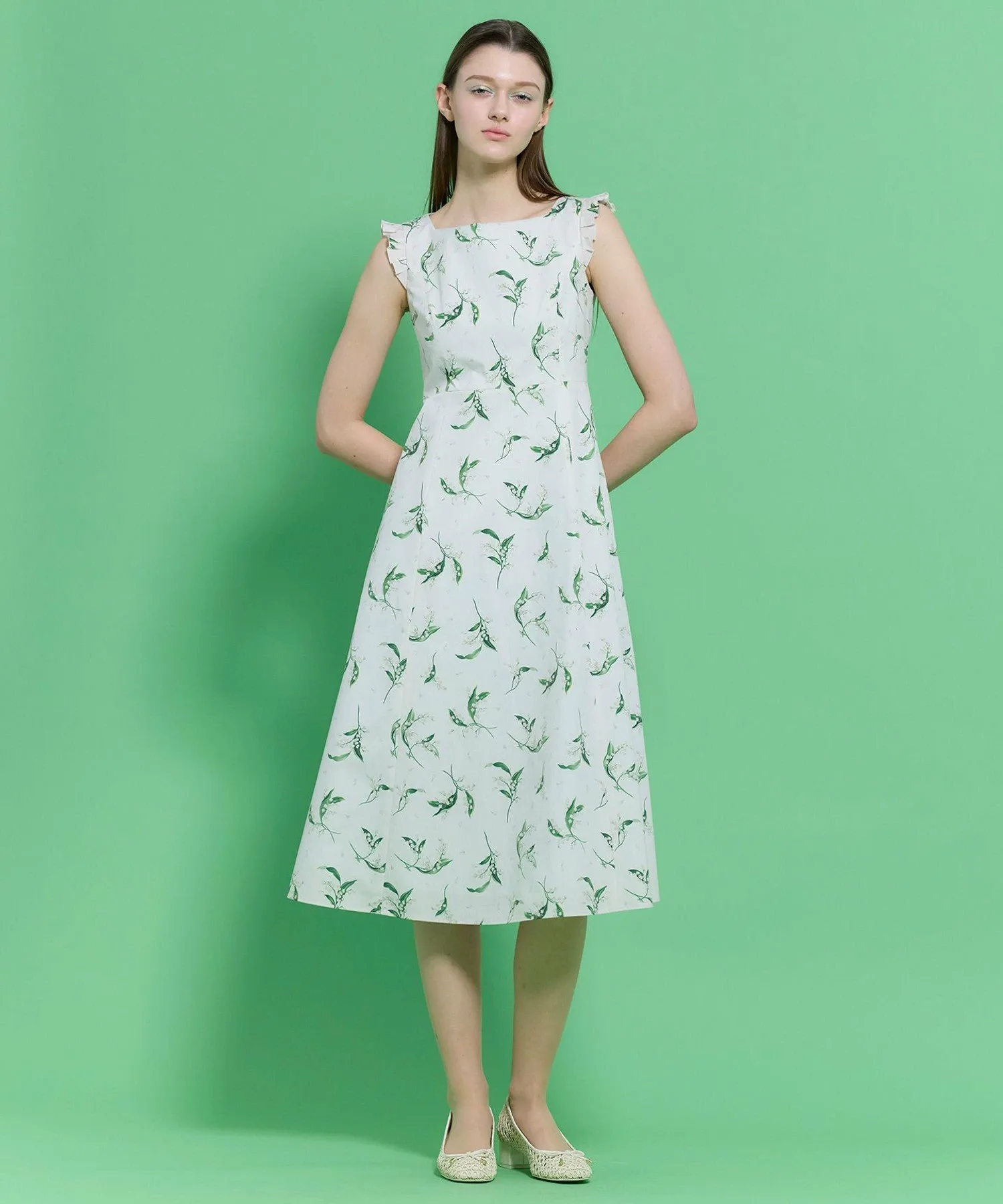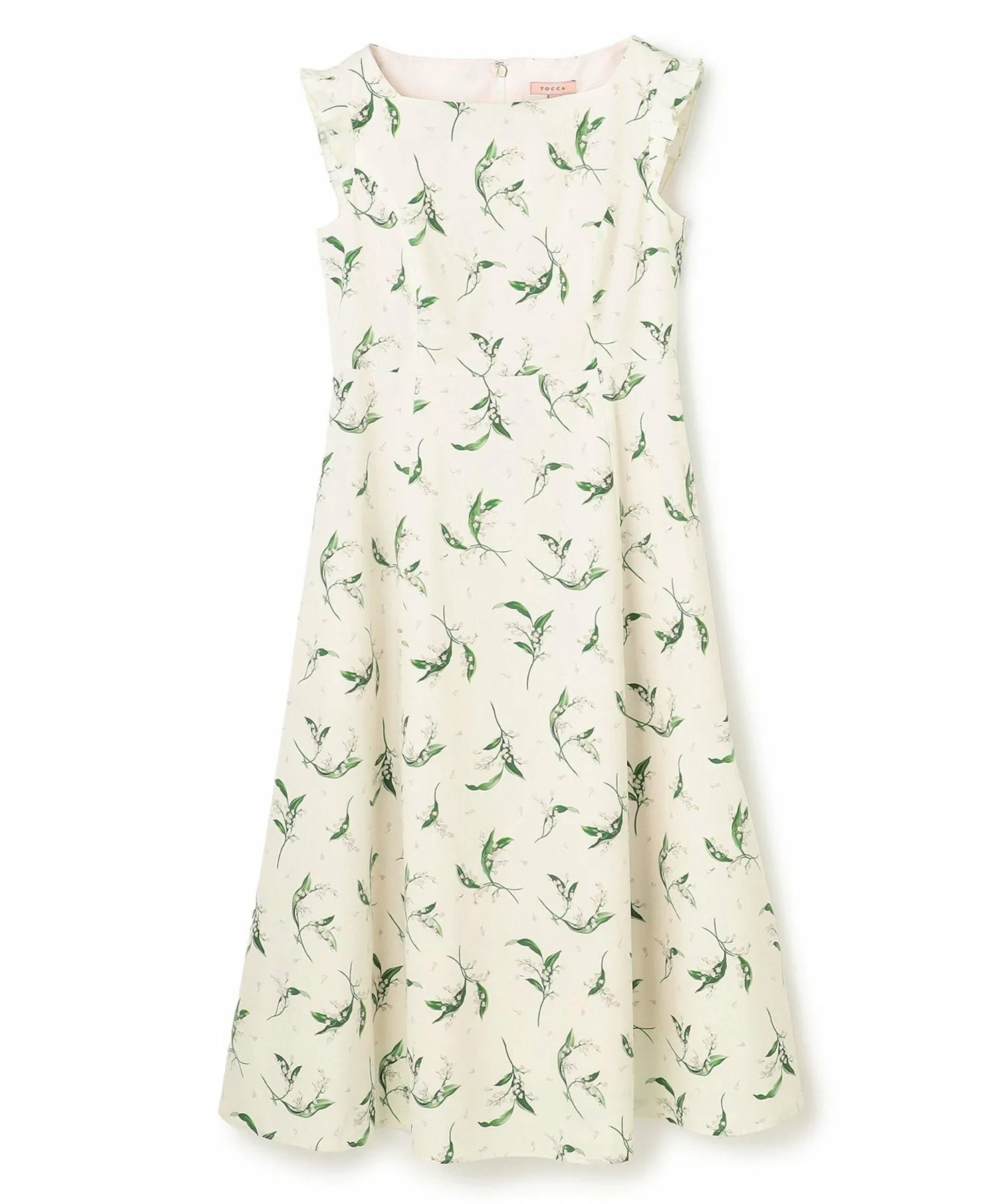 Это платье сшито из высококачественного, плотного материала, что придает ему чистый и элегантный вид. Прекрасный принт с ландышами украшает все платье, подчеркивая его элегантность и женственность. Складки на талии создают четкий силуэт и эффектный вид. Эта универсальная вещь идеально подходит для особых случаев или в сочетании с жакетом или кардиганом для повседневной носки.