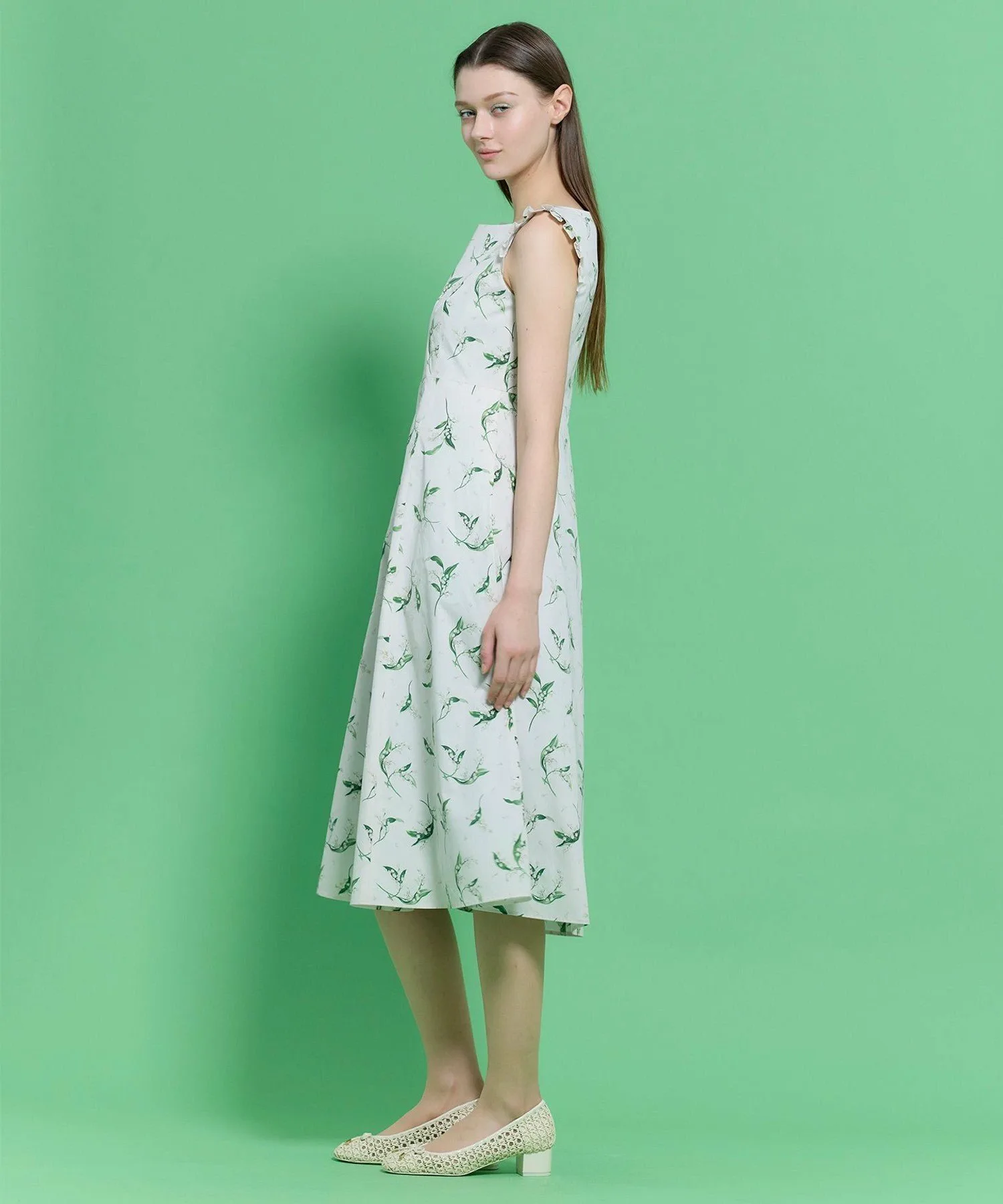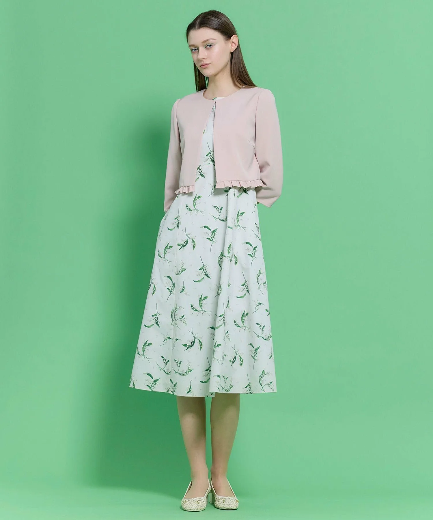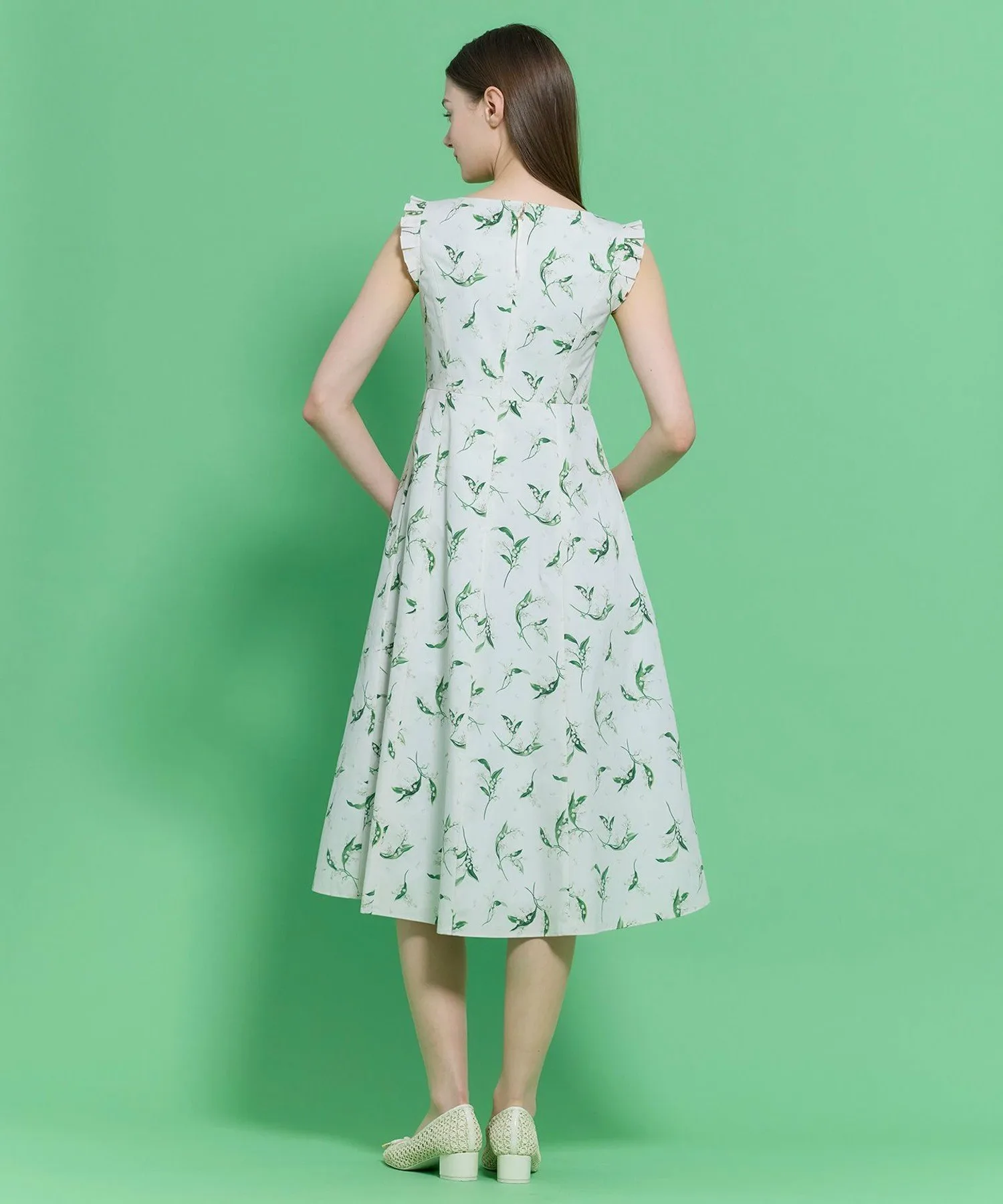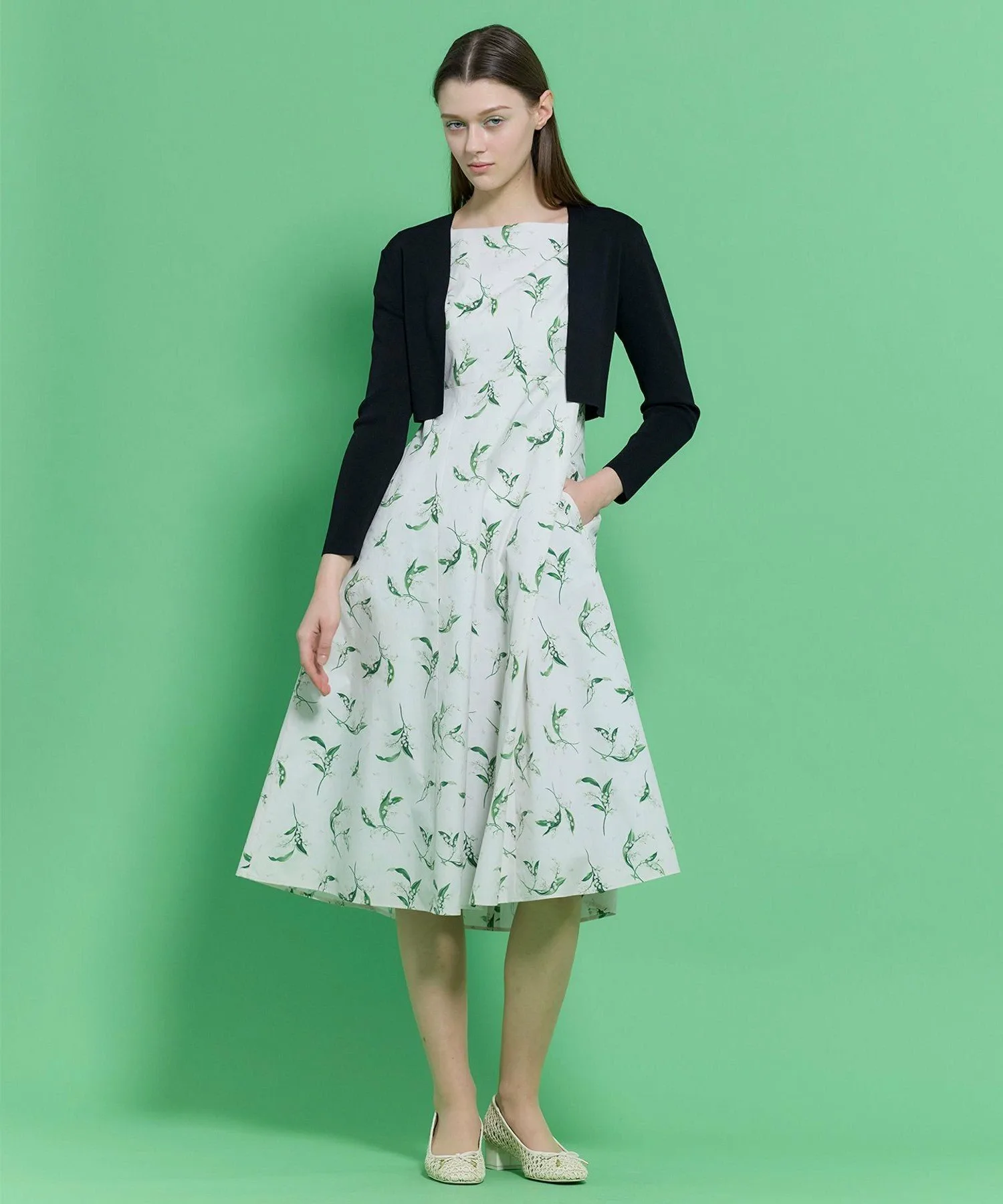 Это платье сшито из высококачественного, плотного материала, что придает ему чистый и элегантный вид. Прекрасный принт с ландышами украшает все платье, подчеркивая его элегантность и женственность. Складки на талии создают четкий силуэт и эффектный вид. Эта универсальная вещь идеально подходит для особых случаев или в сочетании с жакетом или кардиганом для повседневной носки.