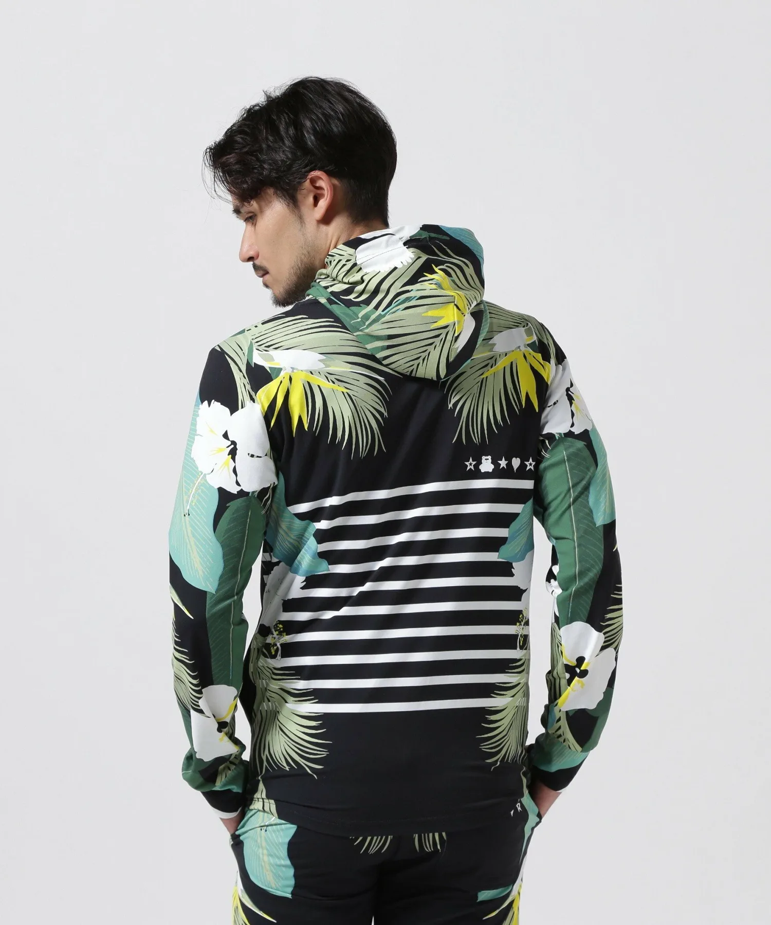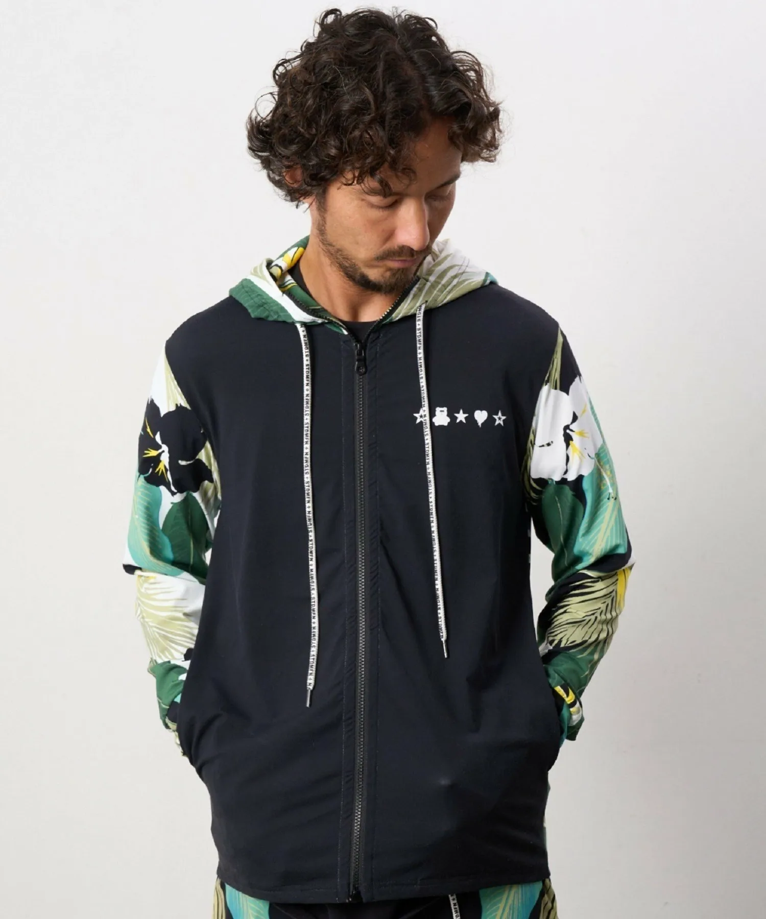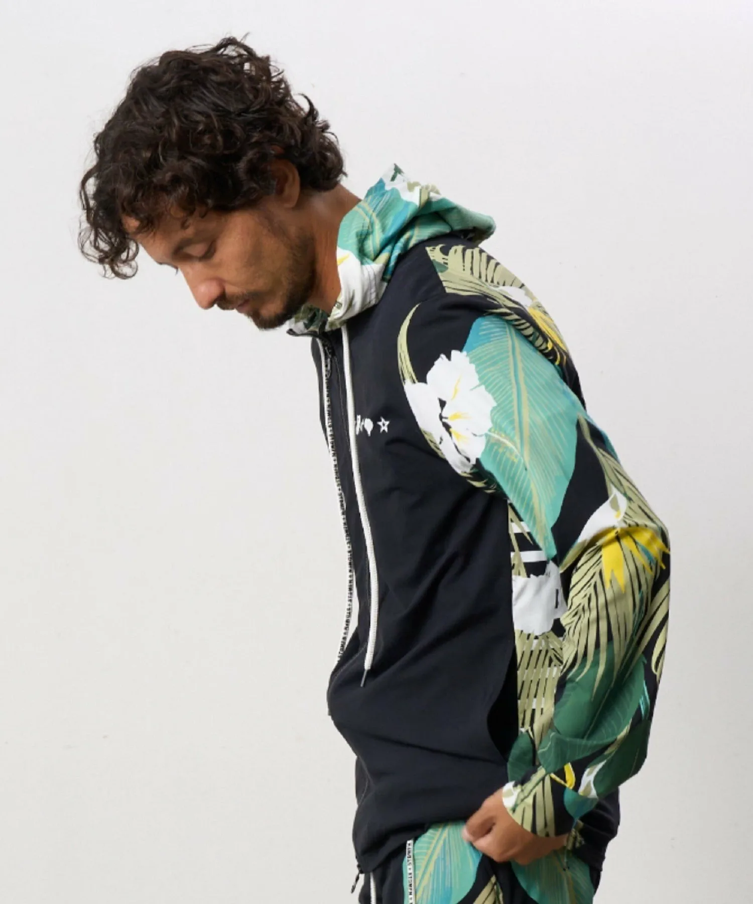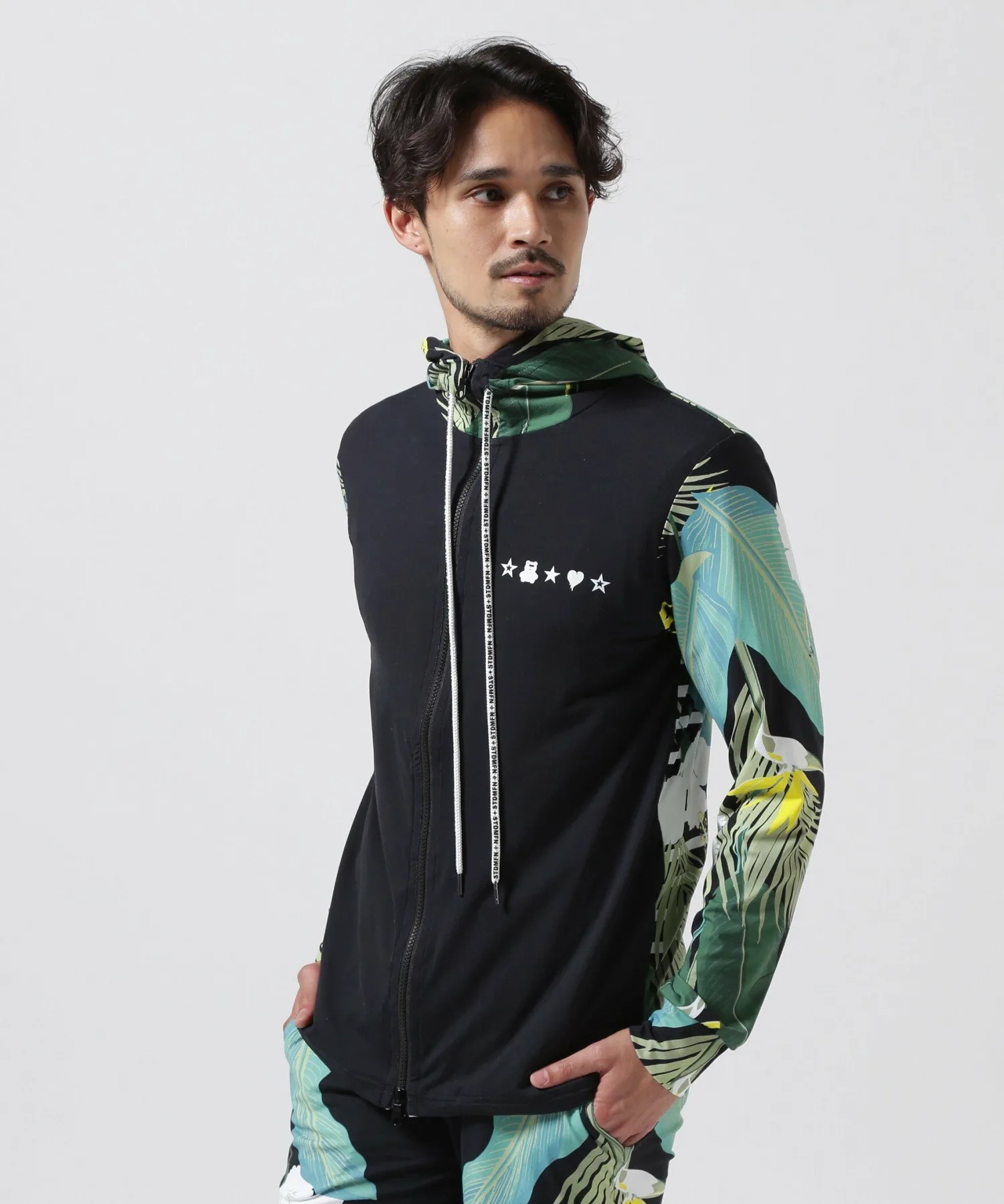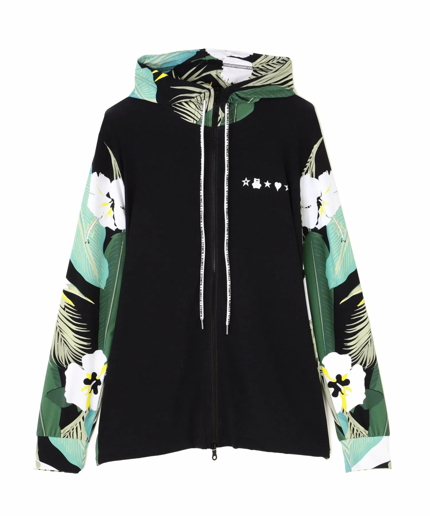 Худи на молнии из оригинального эластичного нейлонового материала с узором из цветов и листьев.