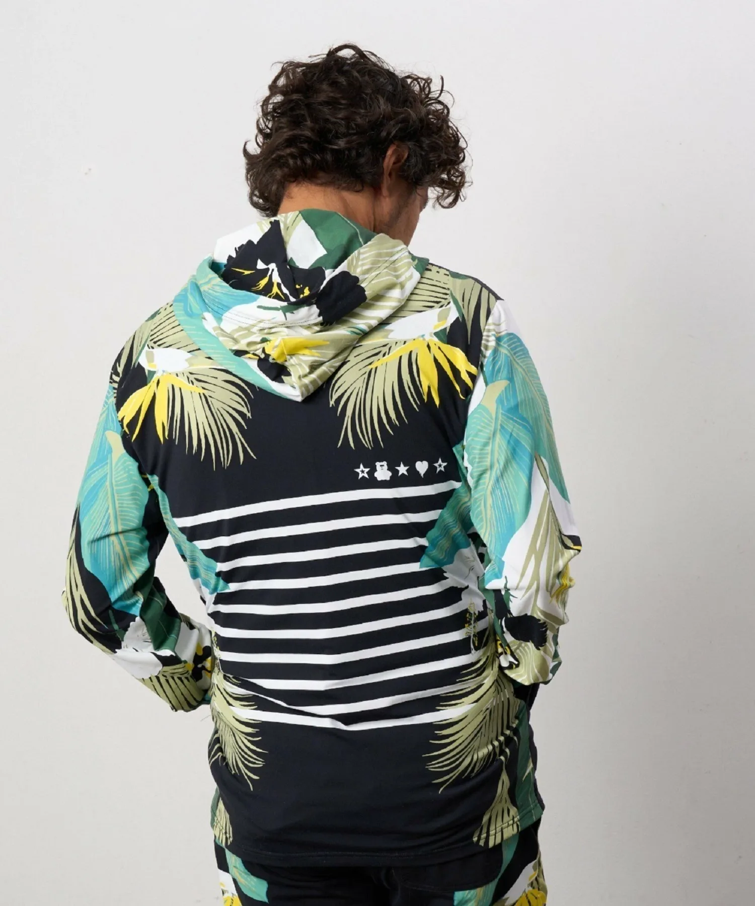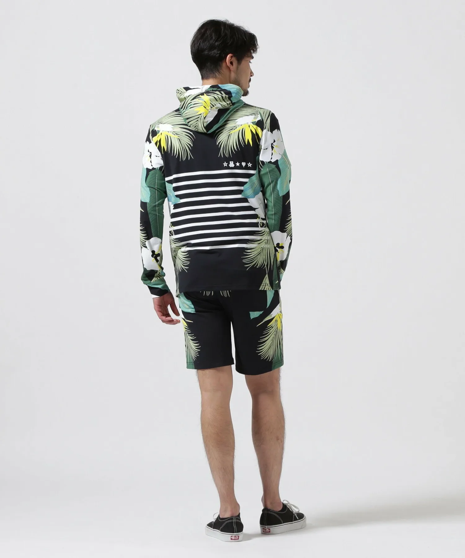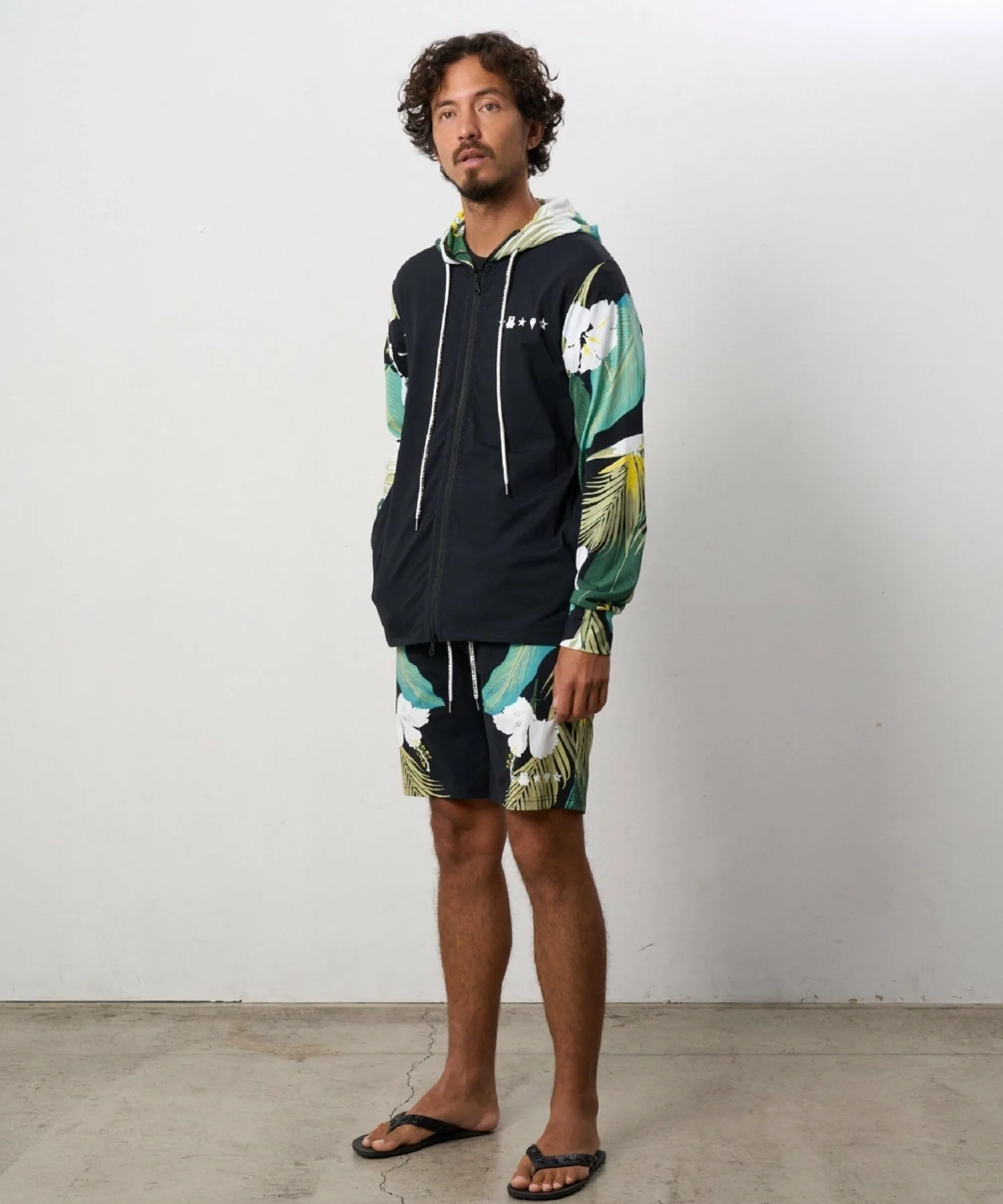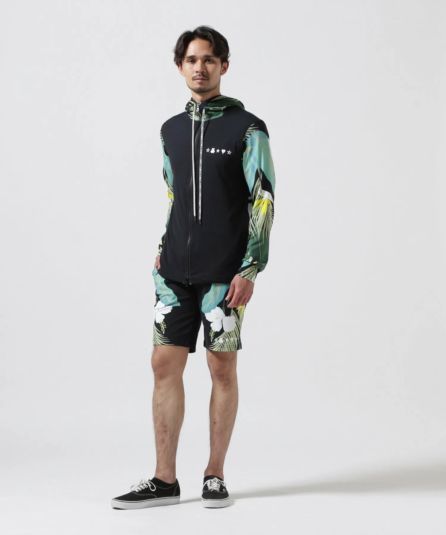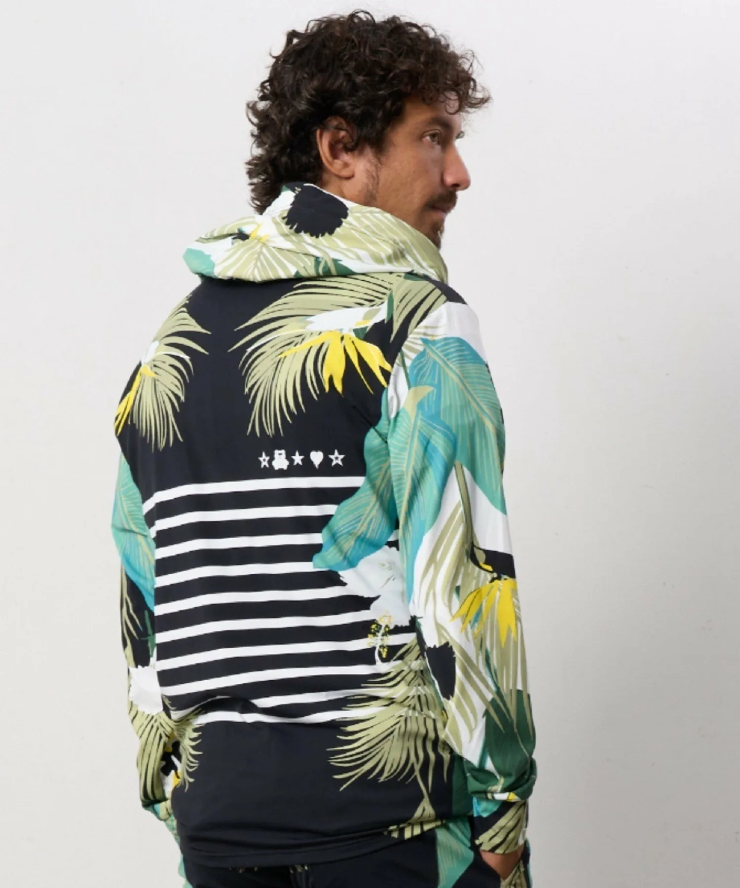 Худи на молнии из оригинального эластичного нейлонового материала с узором из цветов и листьев.