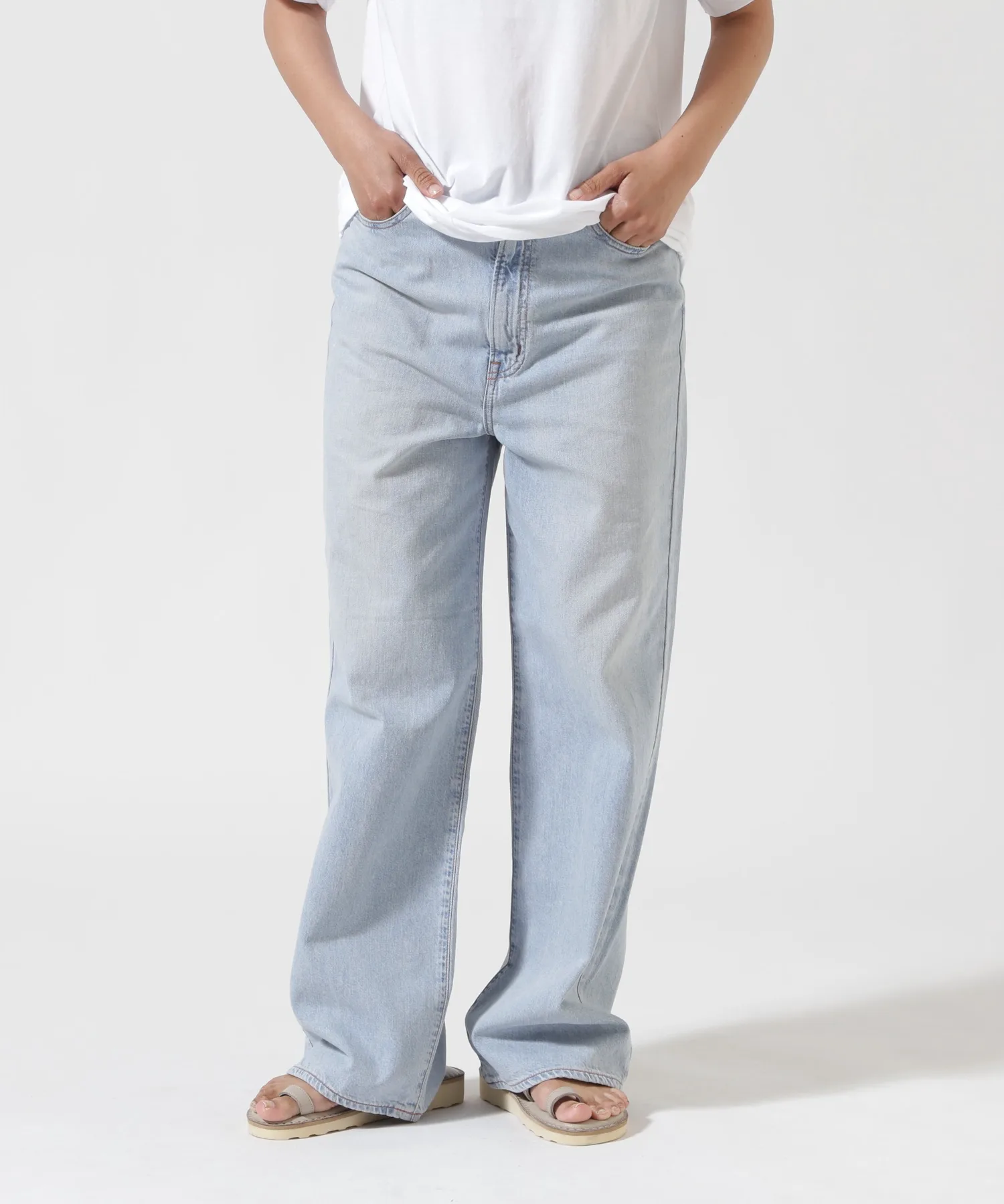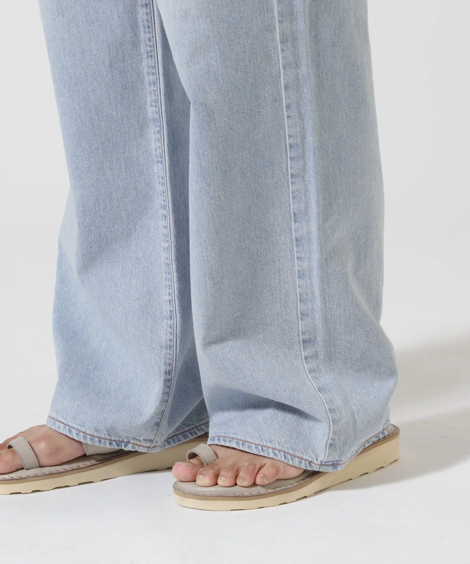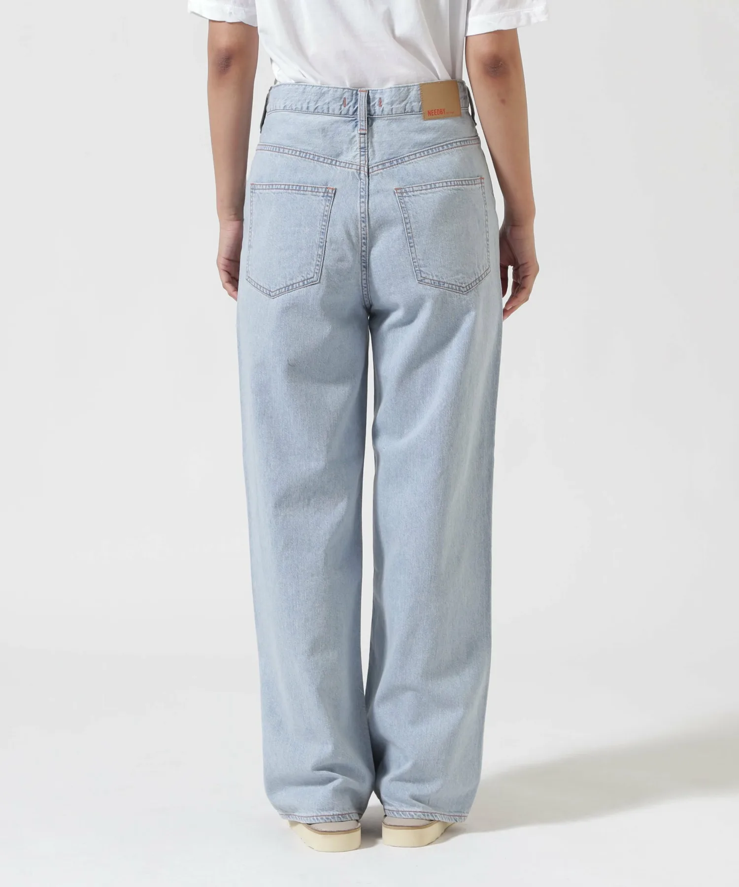Несмотря на то, что они широкие от бедер до низа, они хорошо сидят на талии, создавая привлекательный силуэт. Они изготовлены из оригинальной джинсовой ткани NEEDBY с открытой нитью в качестве утка. При разработке ткани учитывались принципы устойчивого развития, использовался метод окрашивания i-Next.