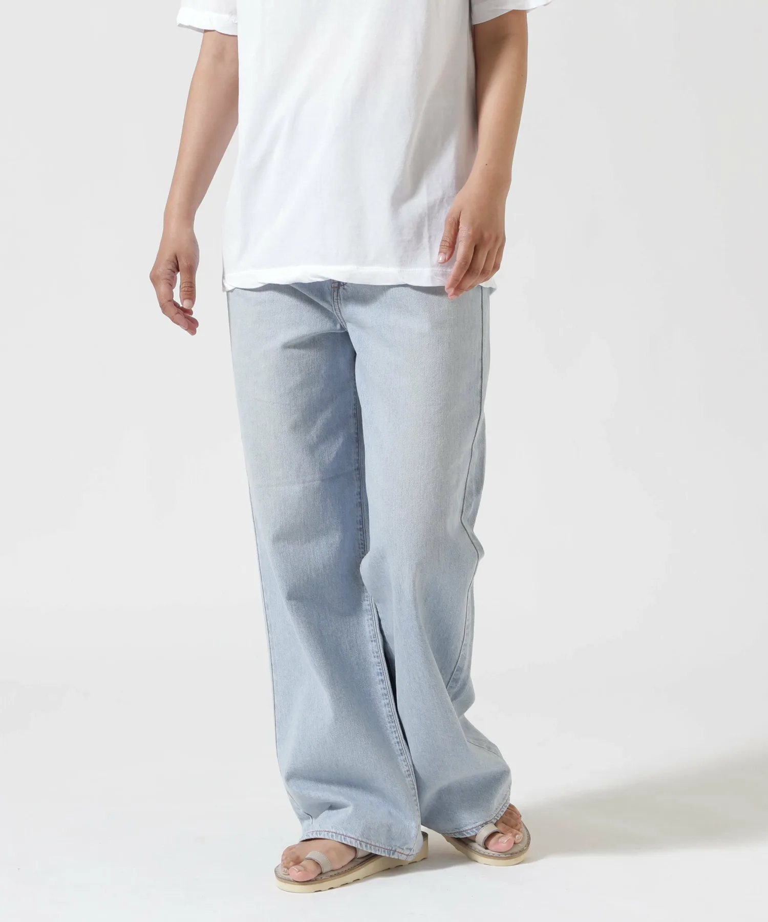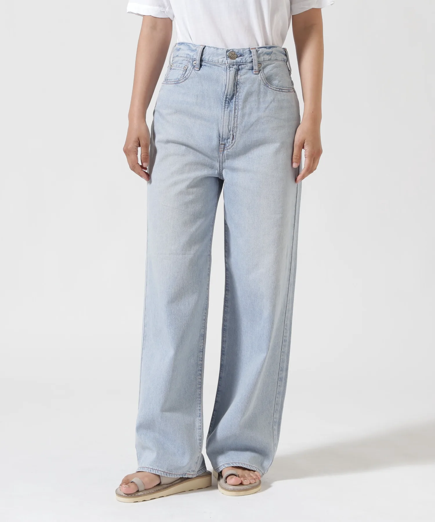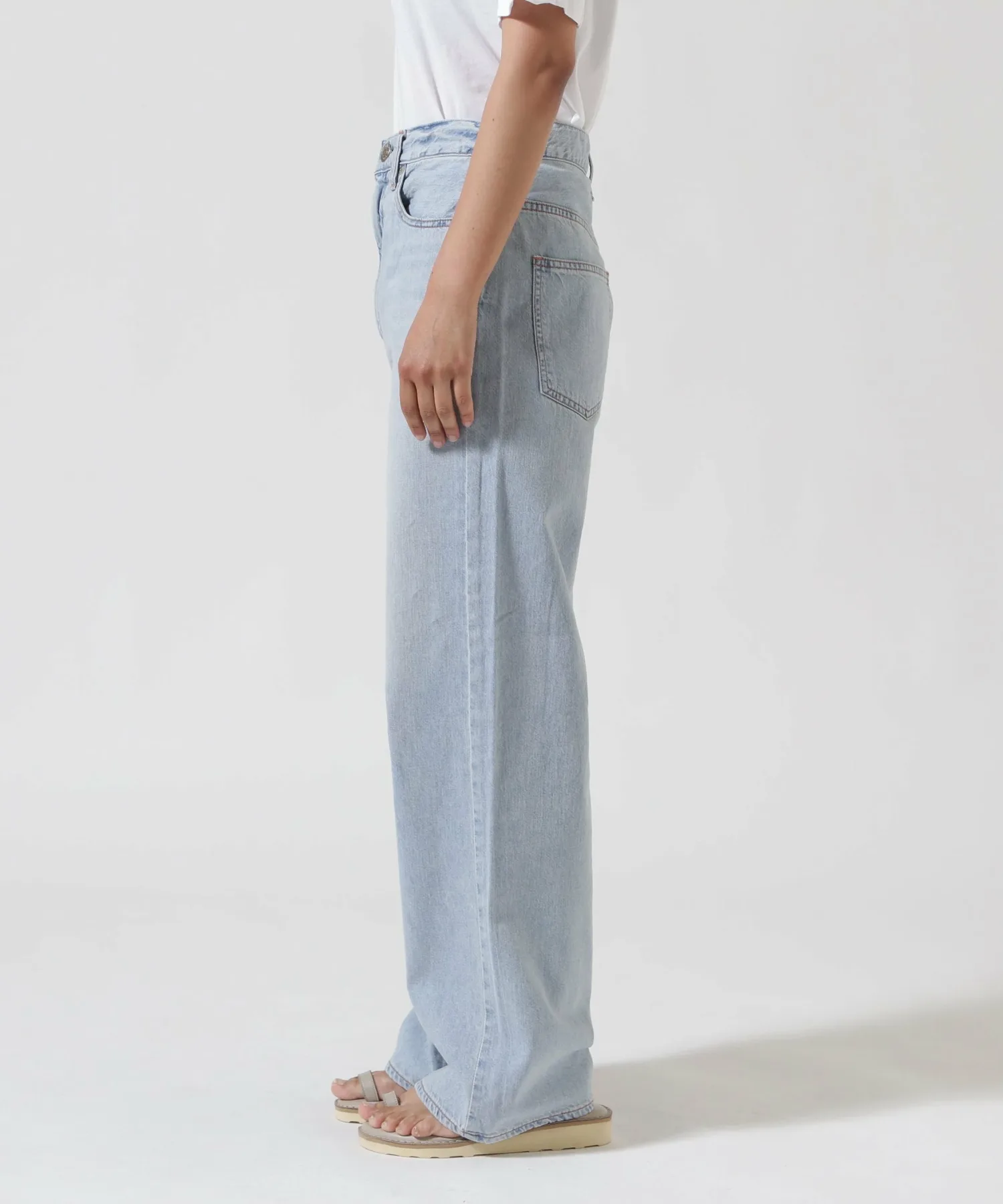 Несмотря на то, что они широкие от бедер до низа, они хорошо сидят на талии, создавая привлекательный силуэт. Они изготовлены из оригинальной джинсовой ткани NEEDBY с открытой нитью в качестве утка. При разработке ткани учитывались принципы устойчивого развития, использовался метод окрашивания i-Next.