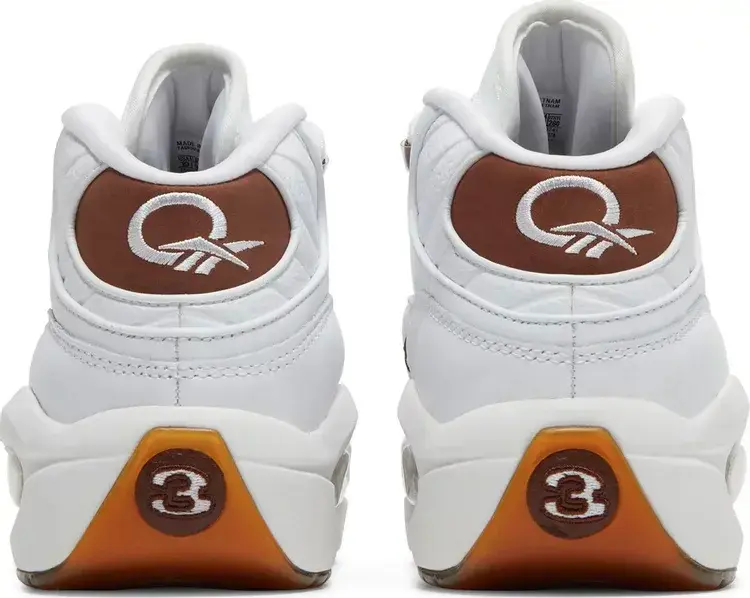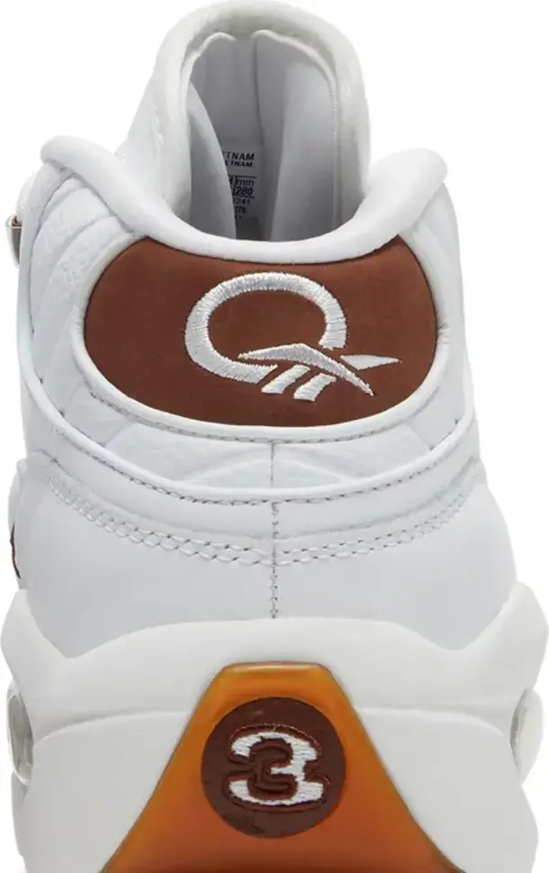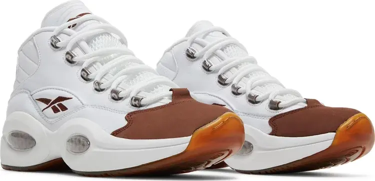 Reebok Question Mid «Mocha Toe» привносит упрощенную двухцветную отделку в первую фирменную обувь Аллена Айверсона. Верх средней части имеет белый кожаный верх с контрастными коричневыми акцентами, включая проушины из термополиуретана и логотипы Vector на язычке и задней панели. Деревенский оттенок повторяется на усиленном замшевом мыске, а также на соответствующей замшевой пятке с вышитым логотипом Question. Кроссовки имеют мягкую промежуточную подошву из EVA с видимой амортизацией Hexalite. Полупрозрачная резиновая подошва темно-янтарного цвета под ногами обеспечивает надежное сцепление.