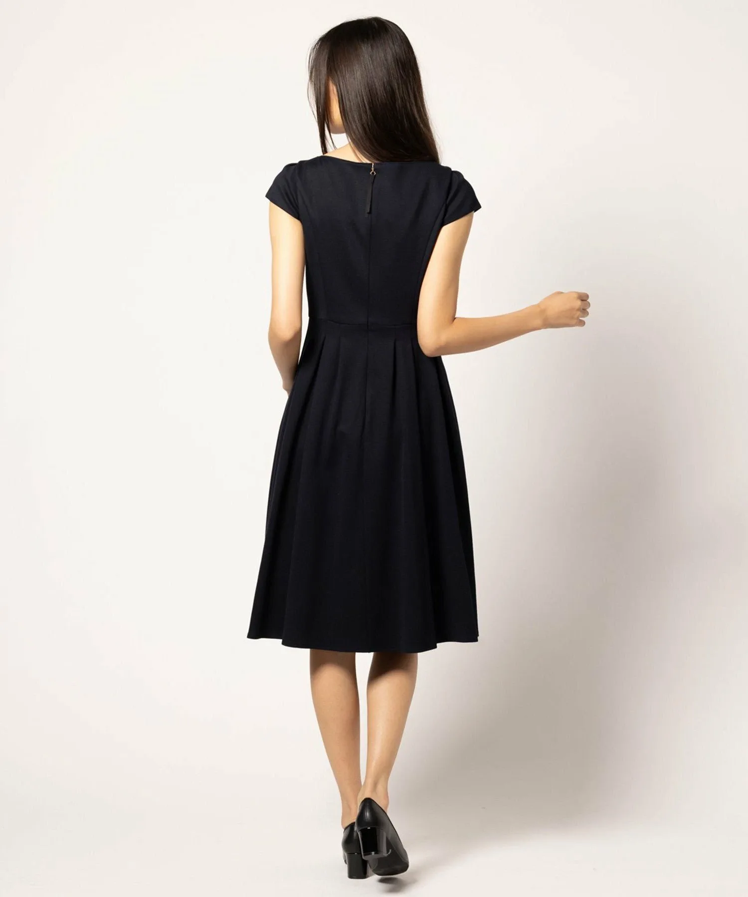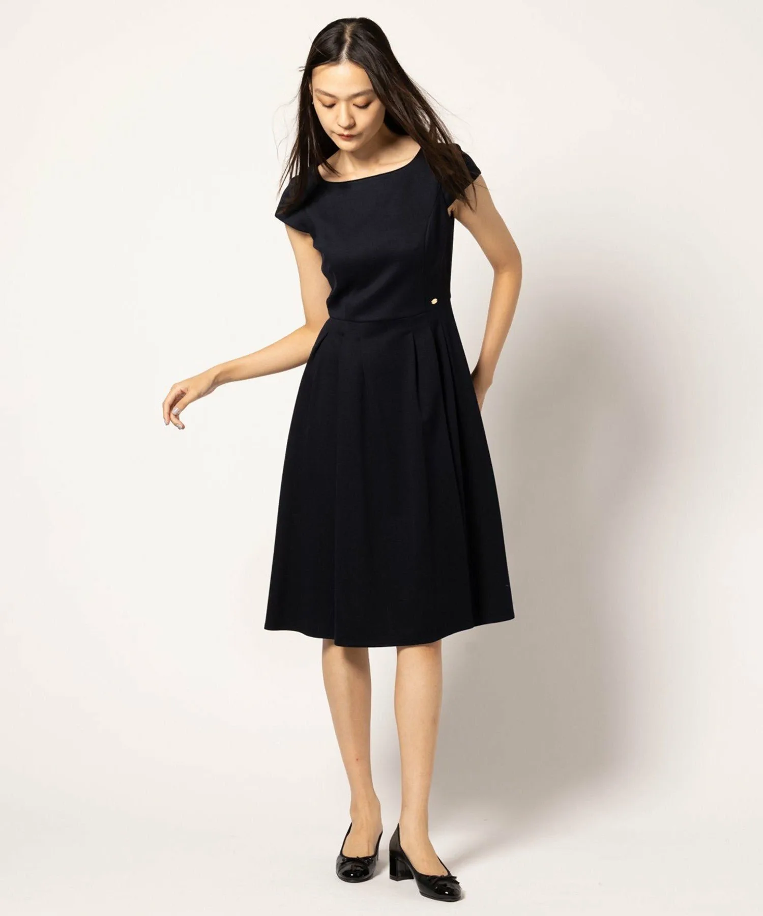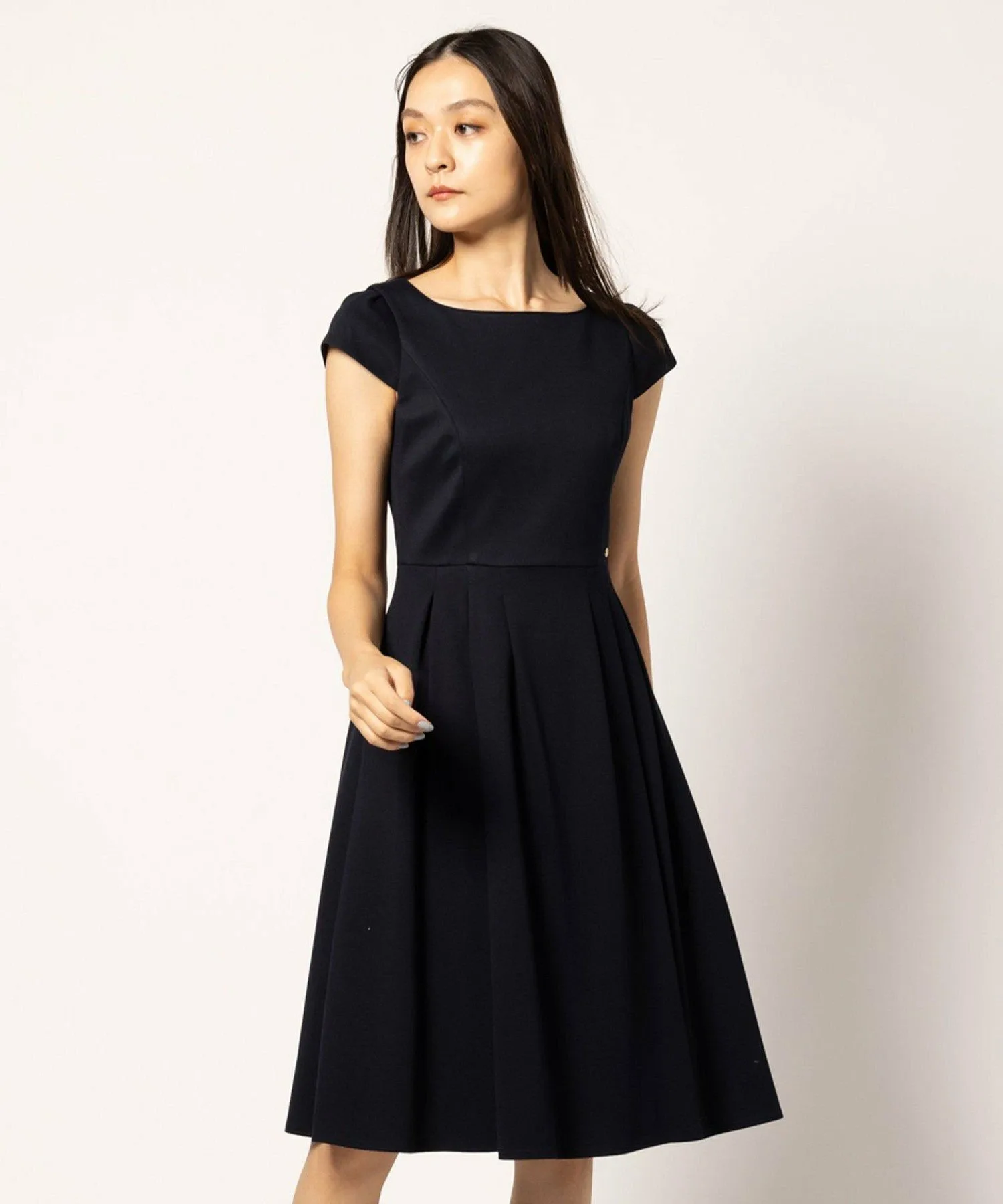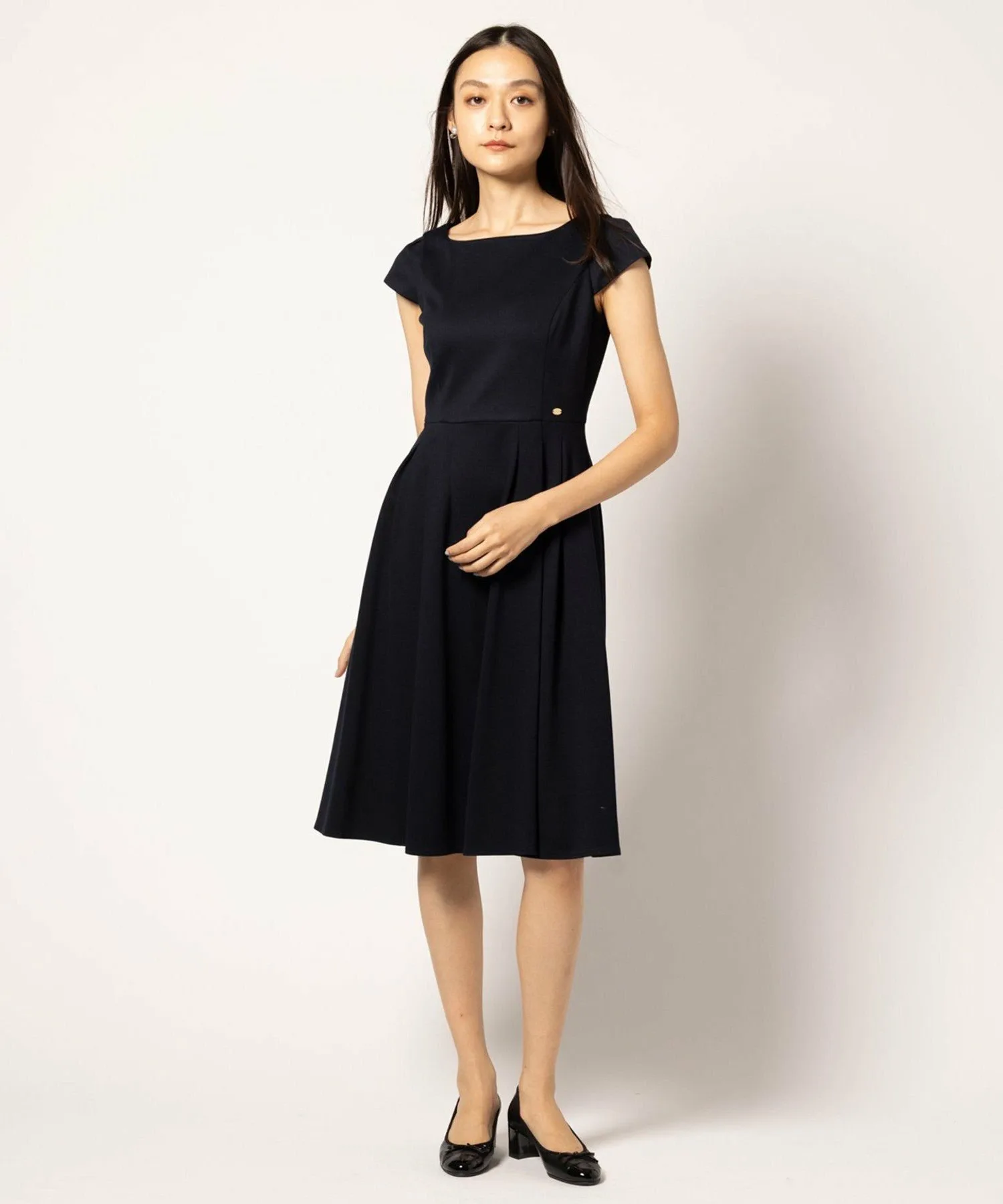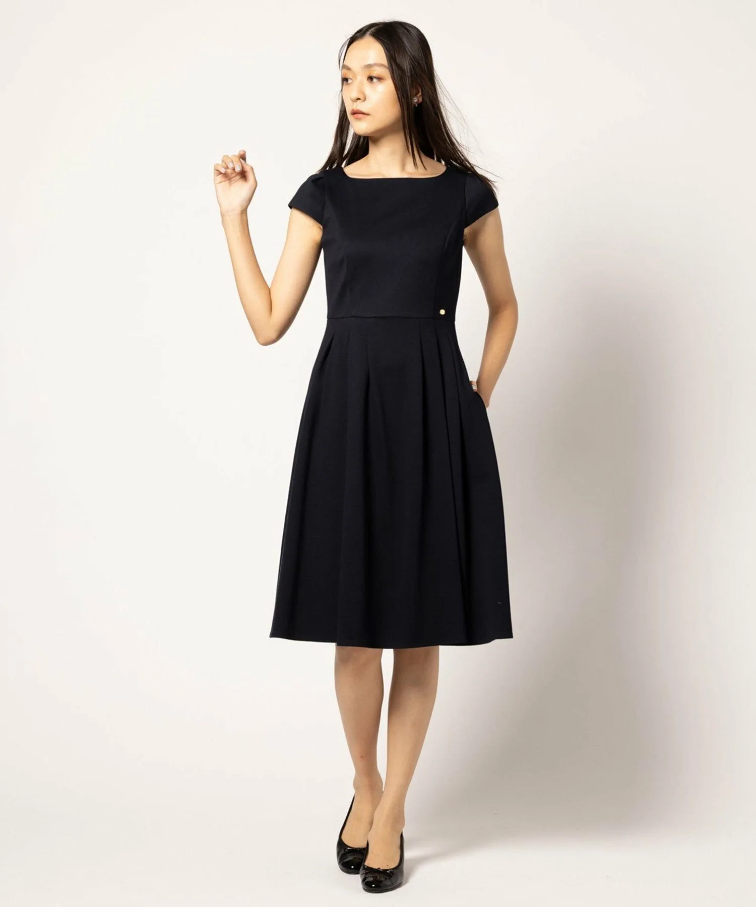 Бежевое платье 033, изготовленное из ткани с оптимальной плотностью и толщиной, имеет двухцветный дизайн, в то время как черное платье 005 и темно-синее платье 075 выполнены в простых цветах, создавая аккуратный и опрятный вид, характерный для TOCCA.