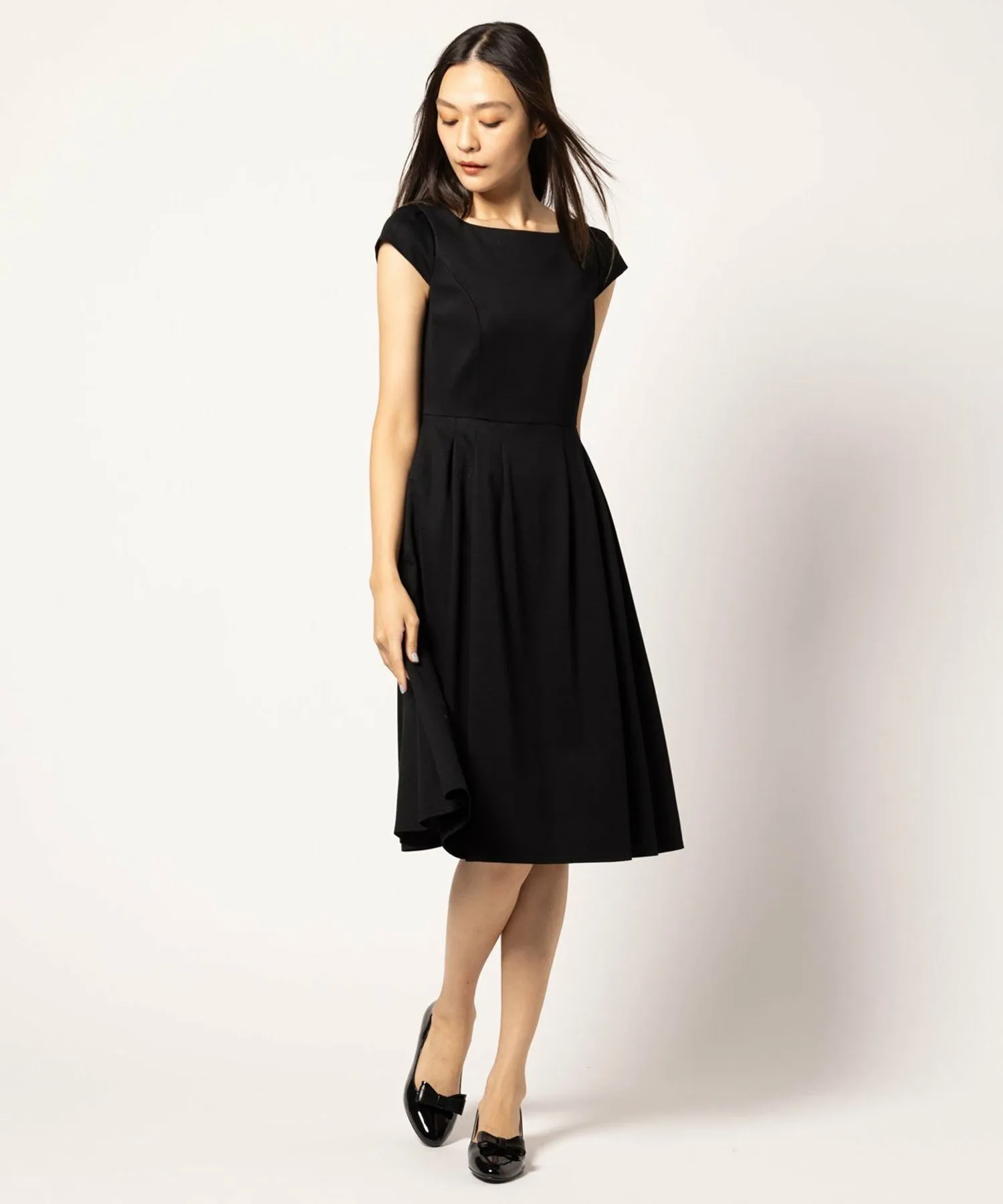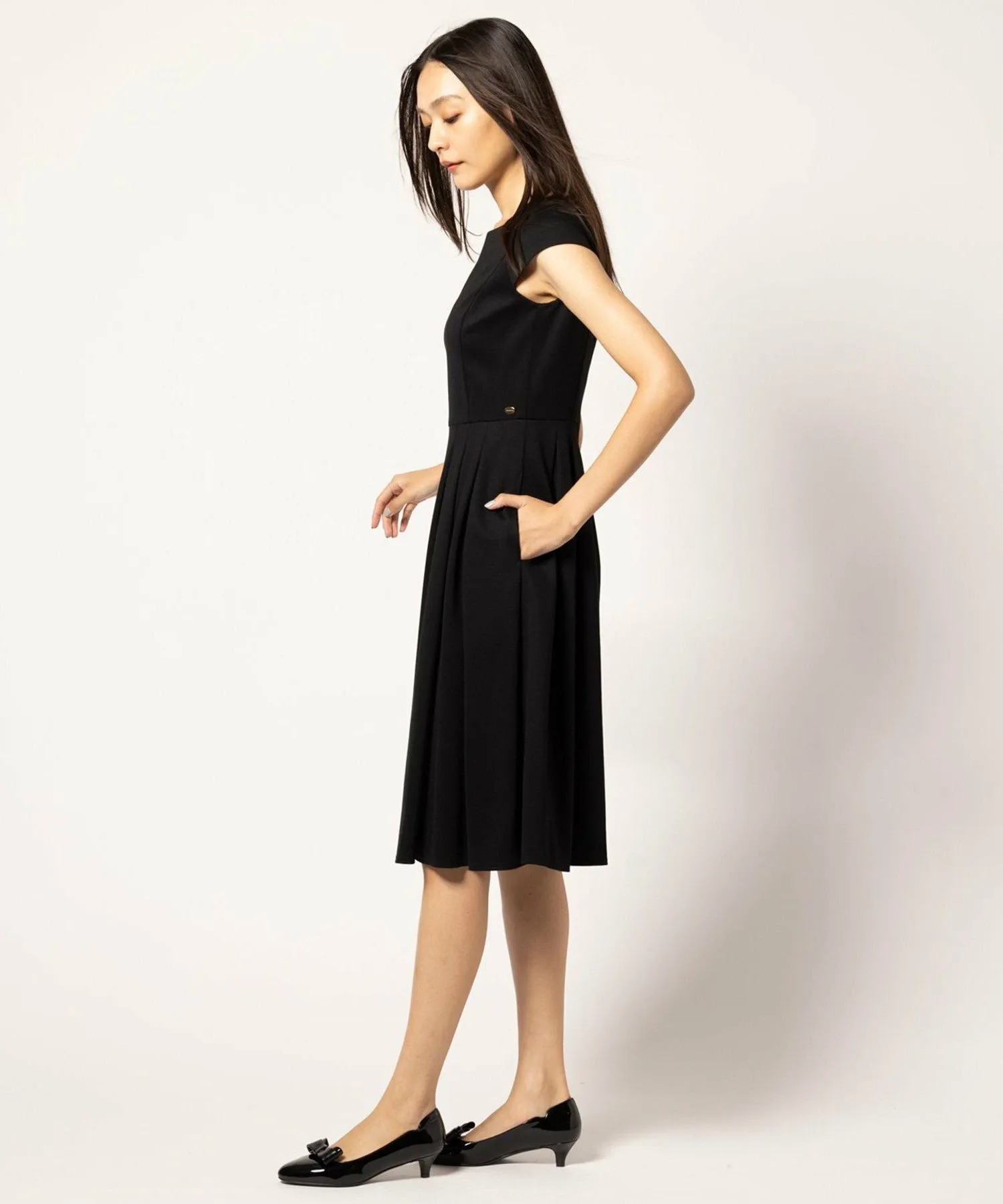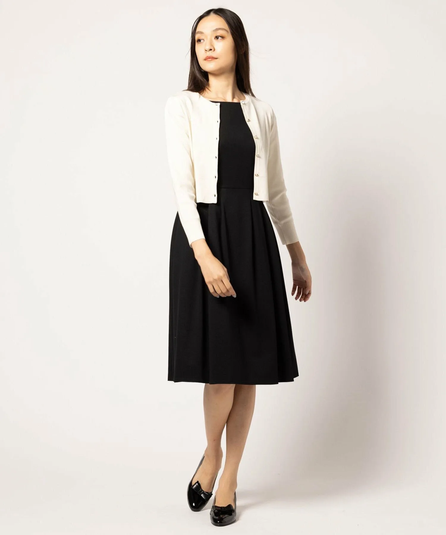 Бежевое платье 033, изготовленное из ткани с оптимальной плотностью и толщиной, имеет двухцветный дизайн, в то время как черное платье 005 и темно-синее платье 075 выполнены в простых цветах, создавая аккуратный и опрятный вид, характерный для TOCCA.