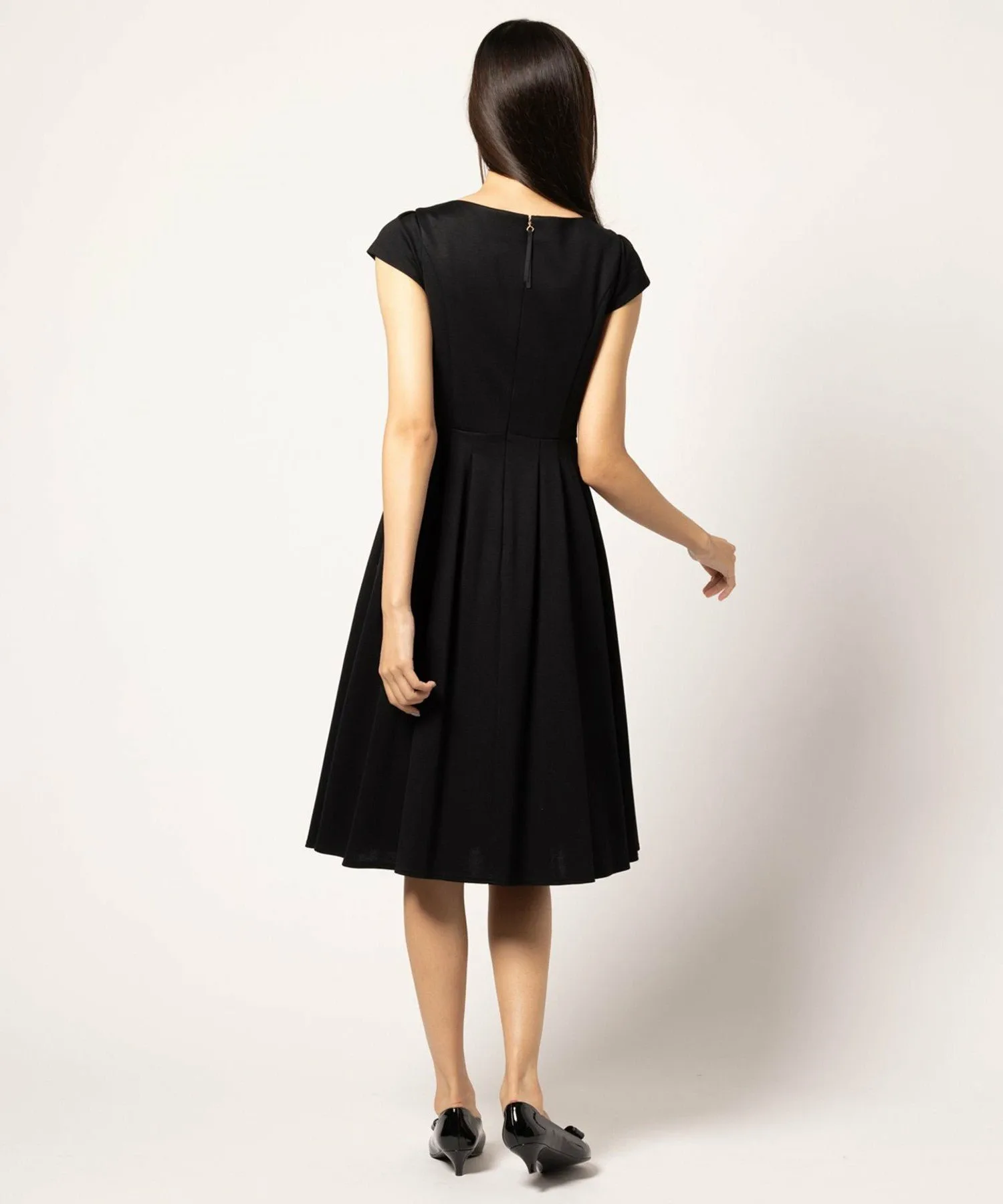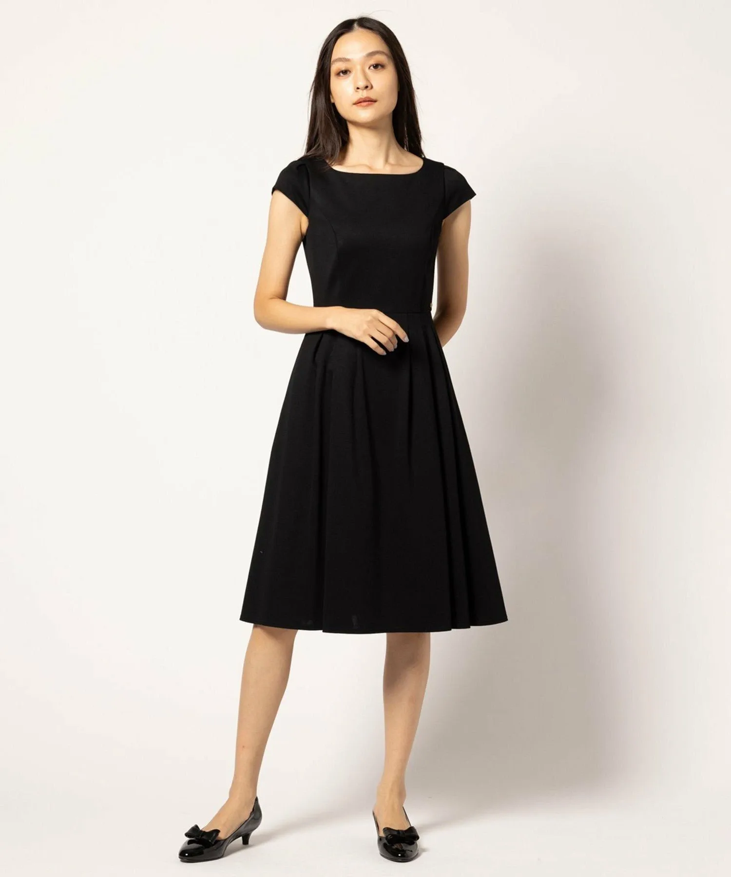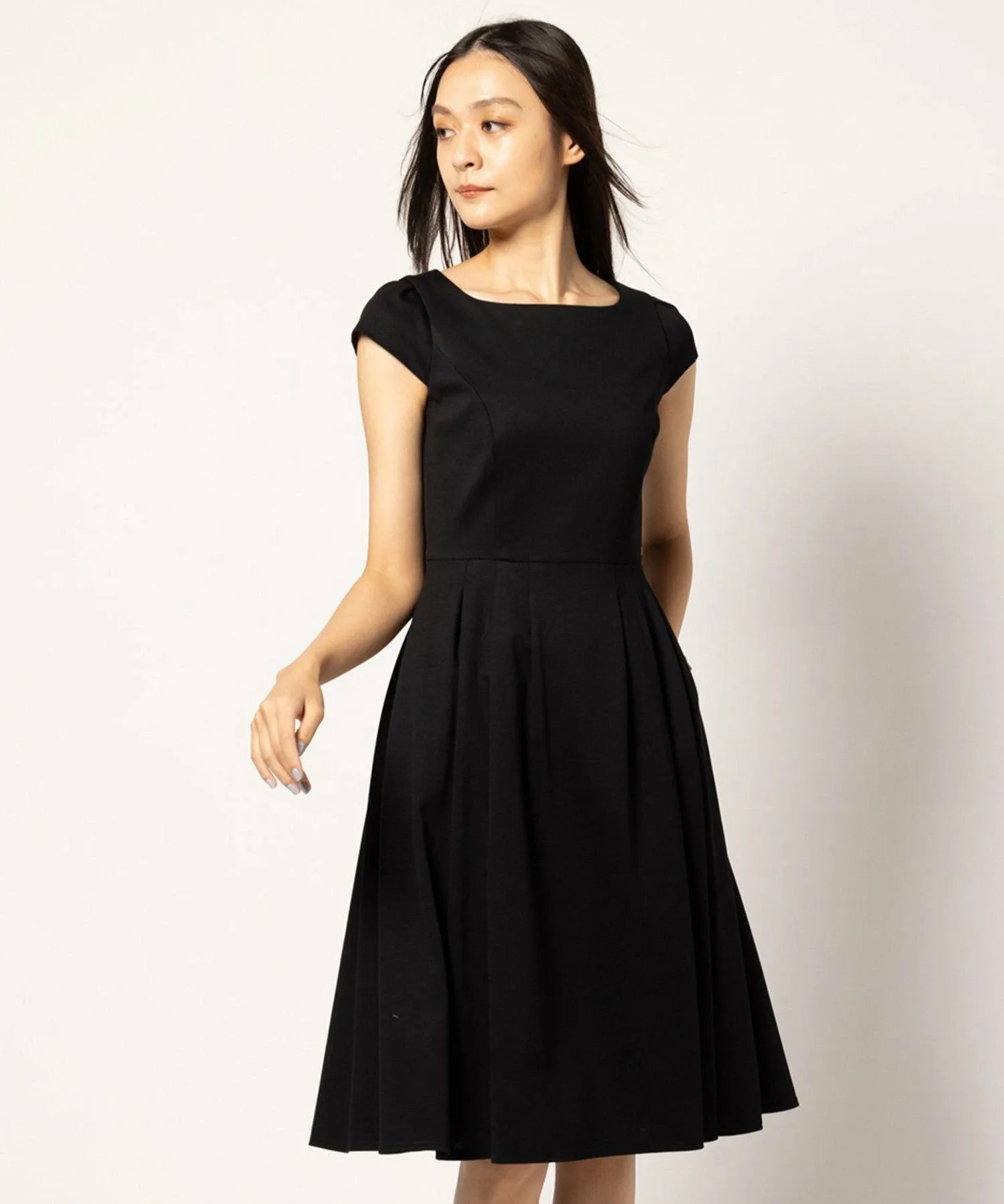 Бежевое платье 033, изготовленное из ткани с оптимальной плотностью и толщиной, имеет двухцветный дизайн, в то время как черное платье 005 и темно-синее платье 075 выполнены в простых цветах, создавая аккуратный и опрятный вид, характерный для TOCCA.