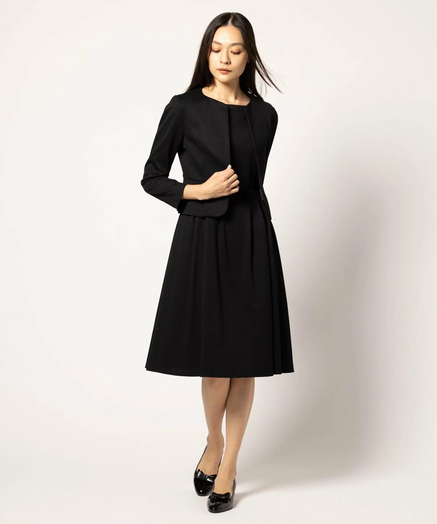 У нас также есть платье с воротником из того же материала, а также жакет без воротника, которые можно носить как комплект.