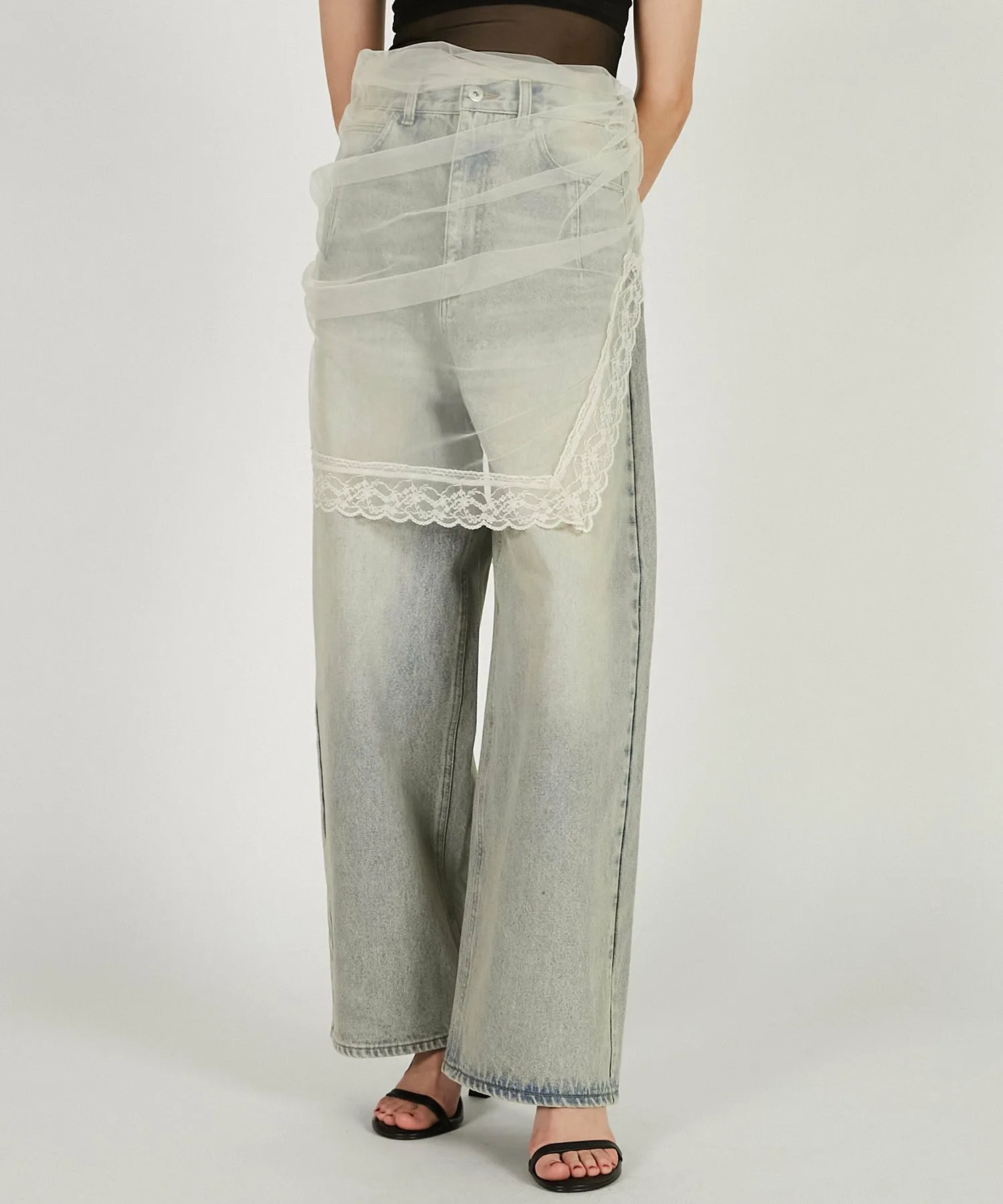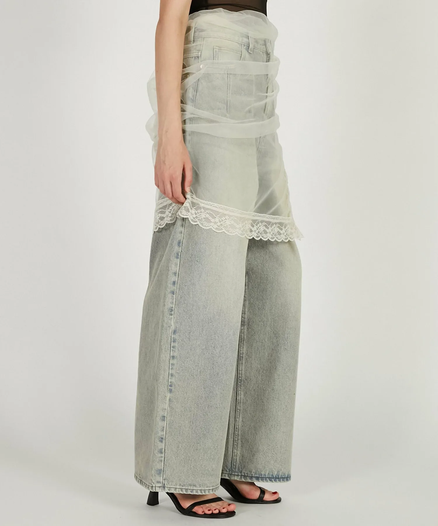 Джинсовые брюки-юбка, надетые поверх тюля.