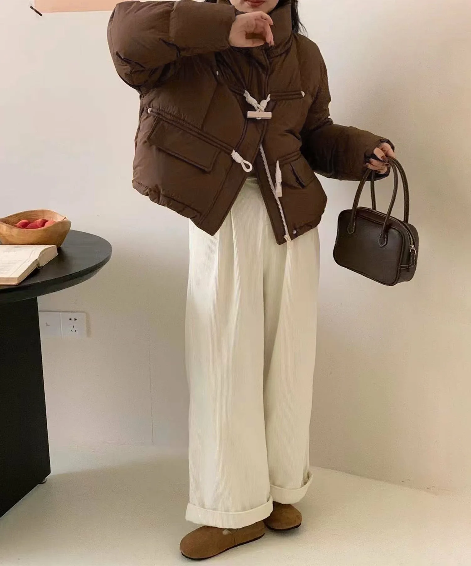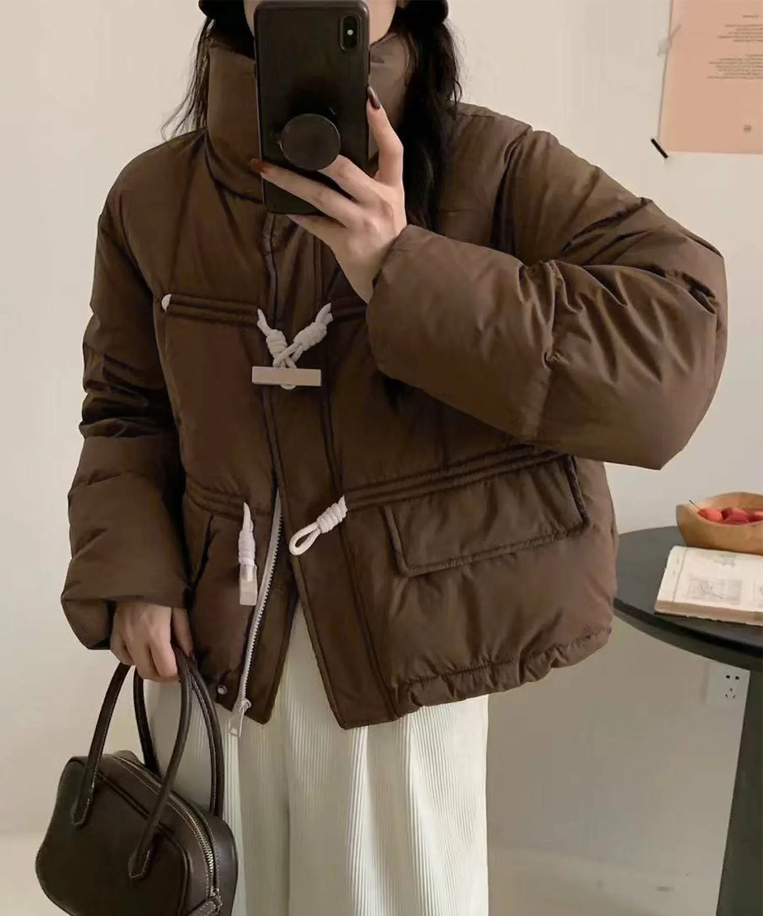 Короткая пуховая куртка с привлекательными деревянными застежками-пуговицами спереди.