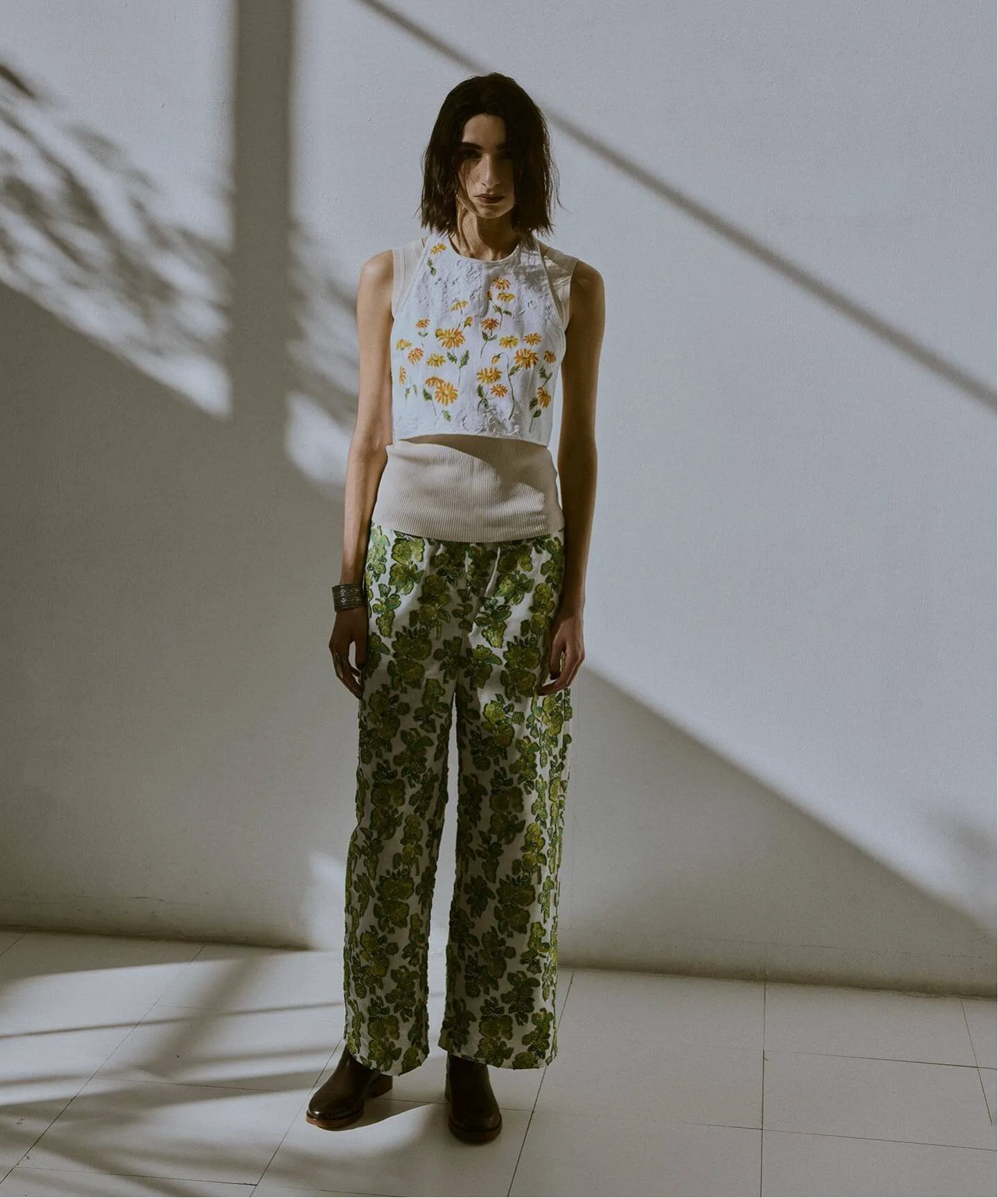 Специально изготовленный жаккард с бахромой. Великолепные и удобные брюки. Простой, удобный и свободный фасон.