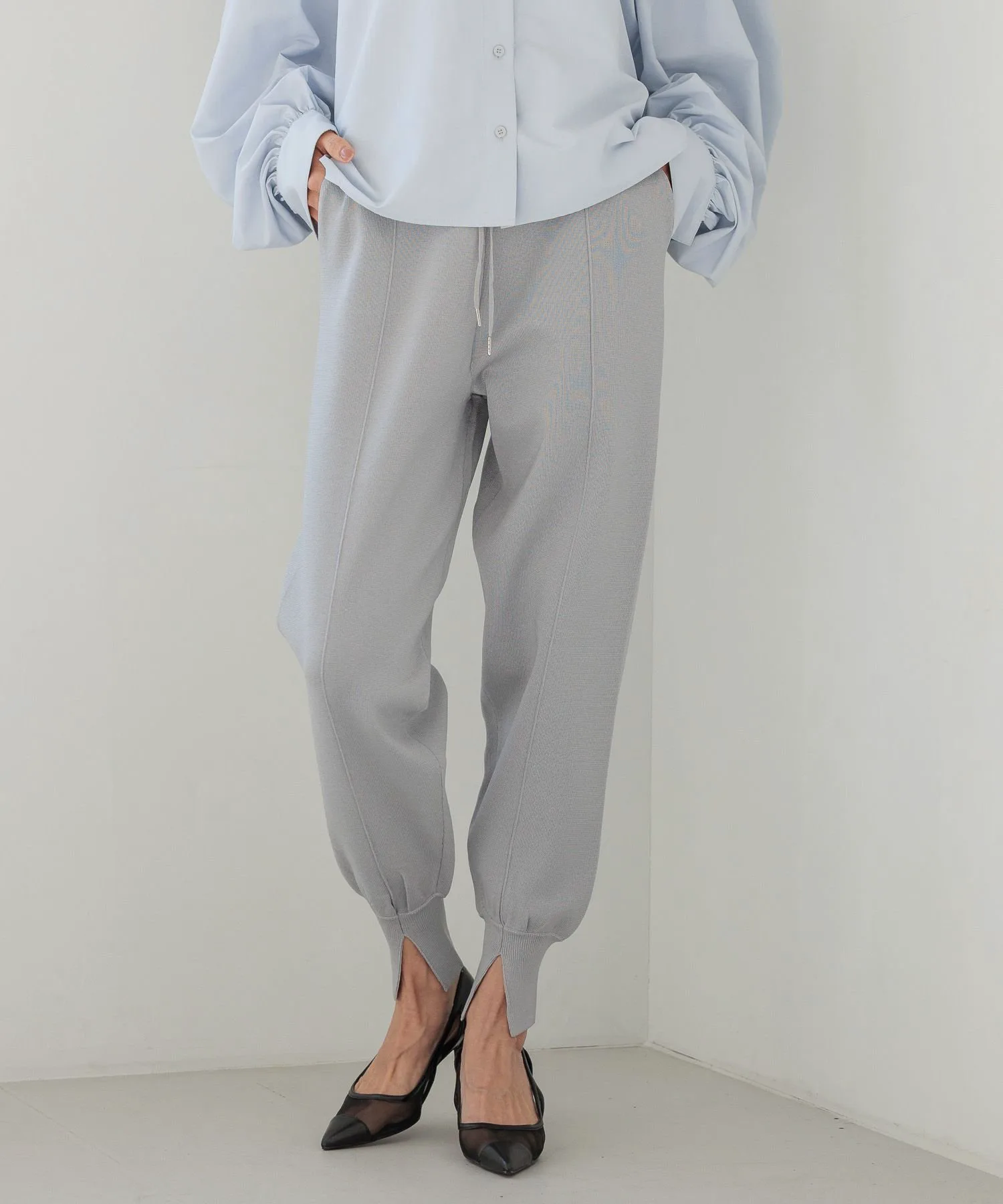 Центральная складка создает четкий силуэт, а длинный ребристый низ с разрезом спереди визуально удлиняет щиколотки, подчеркивая ваш стиль.