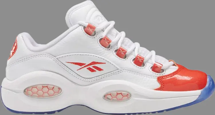 Кроссовки Reebok Question Patent Low J «Vivid Orange», предлагаемые в размерах для начальной школы, преображают дебютную фирменную обувь Аллена Айверсона в яркий образ. Низкий верх выполнен из белой кожи с оранжевыми деталями из лакированной кожи на пятке и усиленным мыском. Цитрусовый оттенок, повторяющийся по всему верху и промежуточной подошве с пропиткой Hexalite, создает резкий контраст в виде ледяной синей полупрозрачной резиновой подошвы.