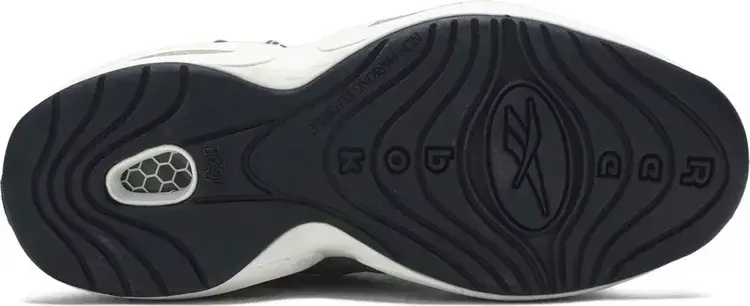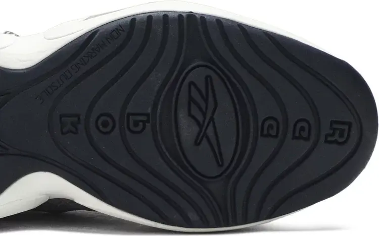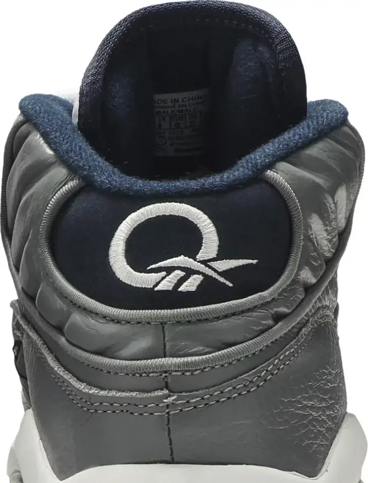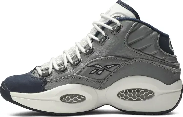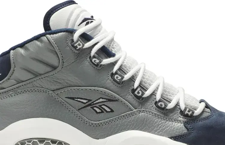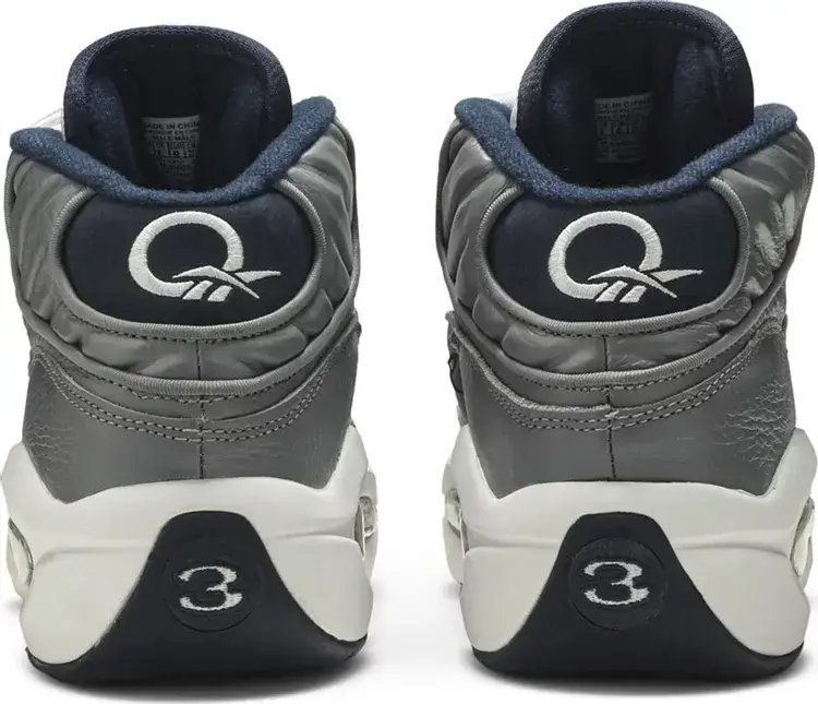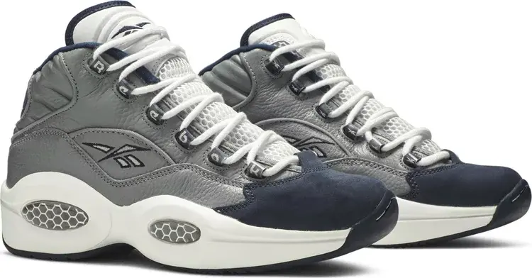 Фирменная форма Question Mid Аллена Айверсона выполнена в классической серой и темно-синей цветовой палитре, как дань уважения его дням, когда он играл за Джорджтаун Хойас. Верх обуви из серой кожи имеет рваную текстуру, а синие акценты на носке и пятке выполнены из контрастного нубука. Полупрозрачные окна Hexalite появляются в межподошве для амортизации по всей длине, а цифра Iverson 3 появляется на пятке.