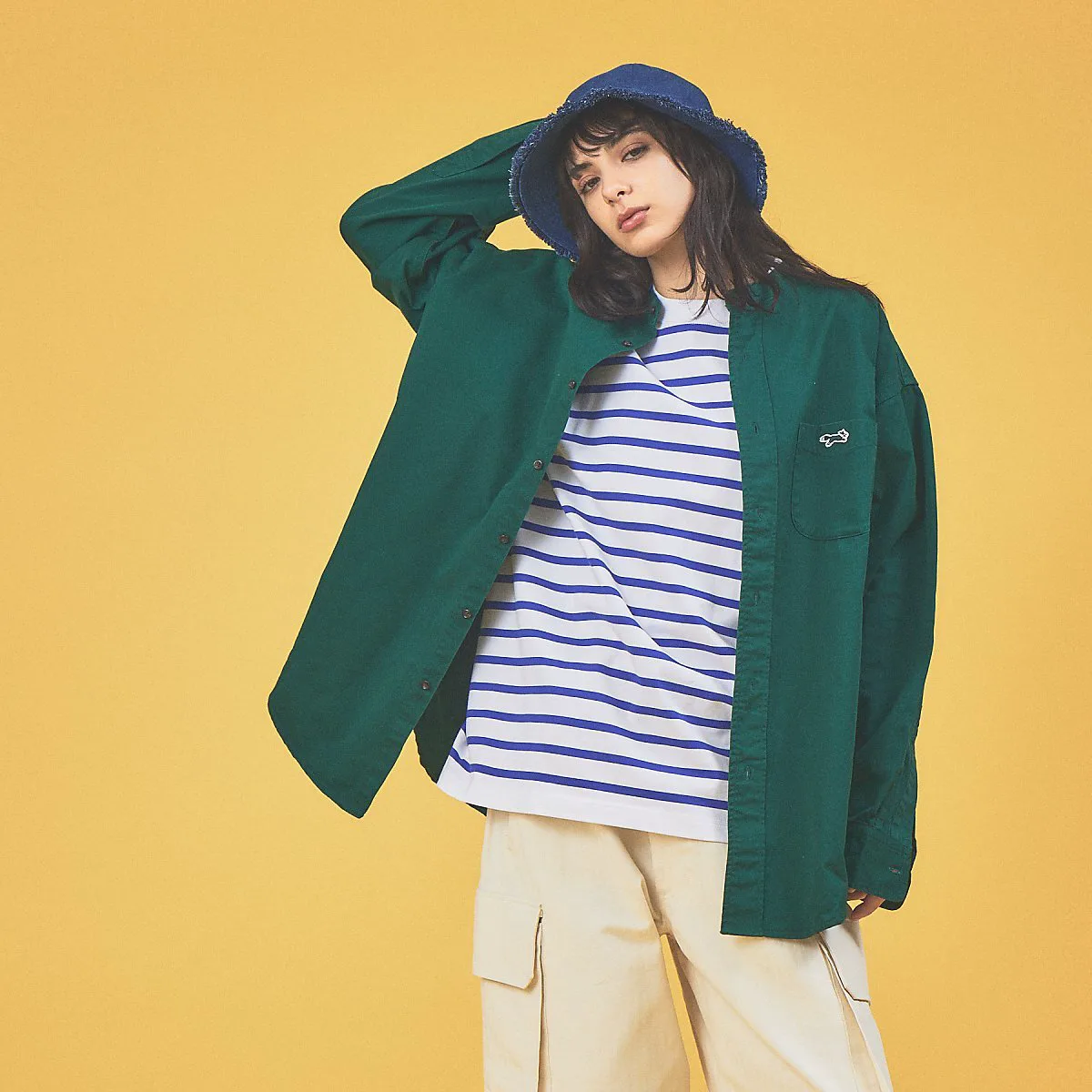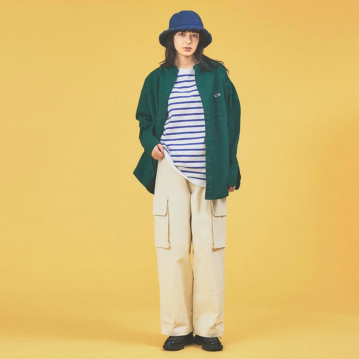 Используемые материалы подобраны в соответствии с цветом. Используется многослойная ткань: белый (оксфорд), бежевый, темно-зеленый (хлопковый твил) и индиго (джинсовая ткань).
